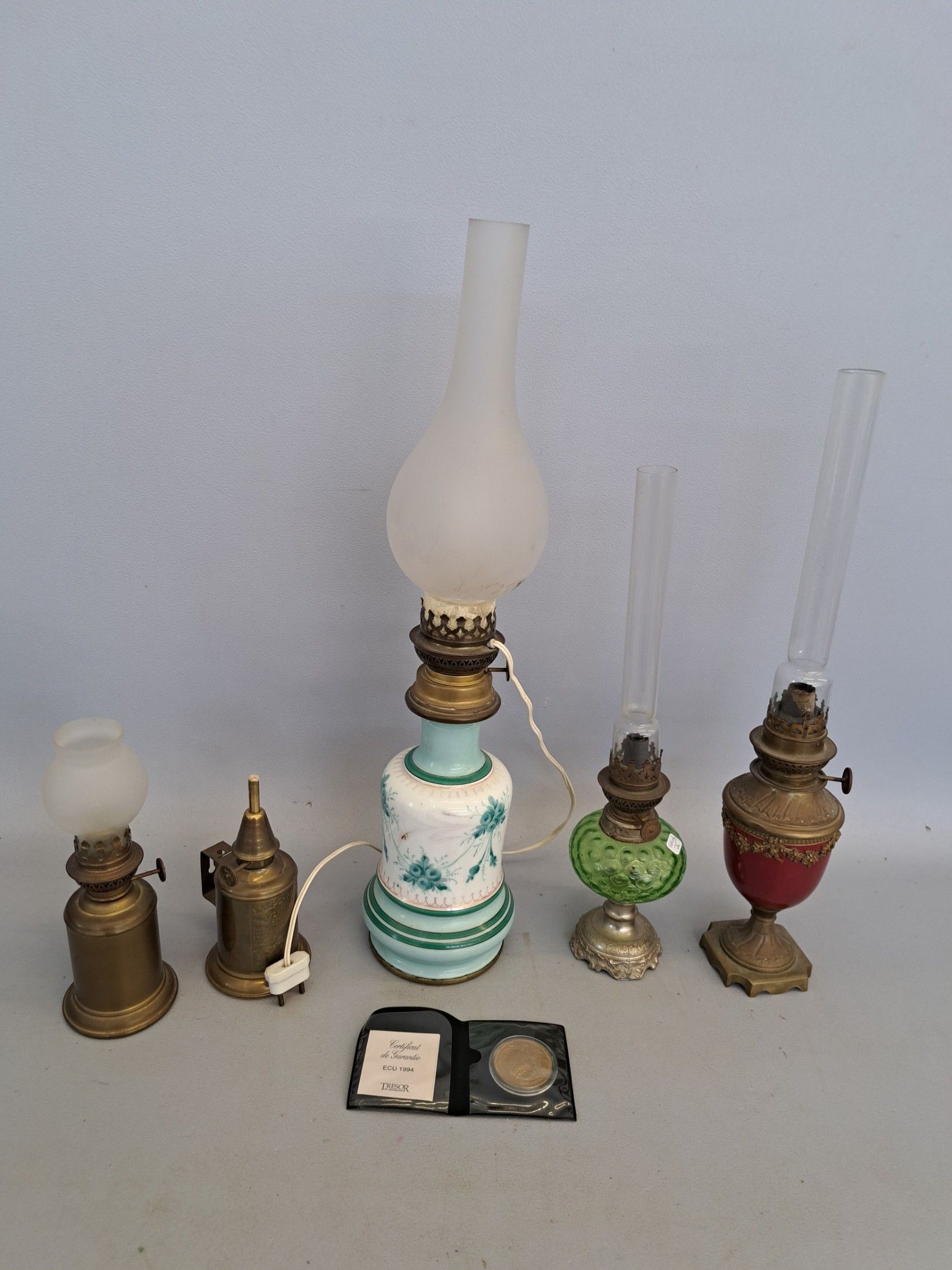 Three oil lamps: one with a green glass reservoir, one with a red porcelain reservoir and the third electrically mounted in porcelain enamelled in green monochrome with flowers. Maximum height: 55 cm.