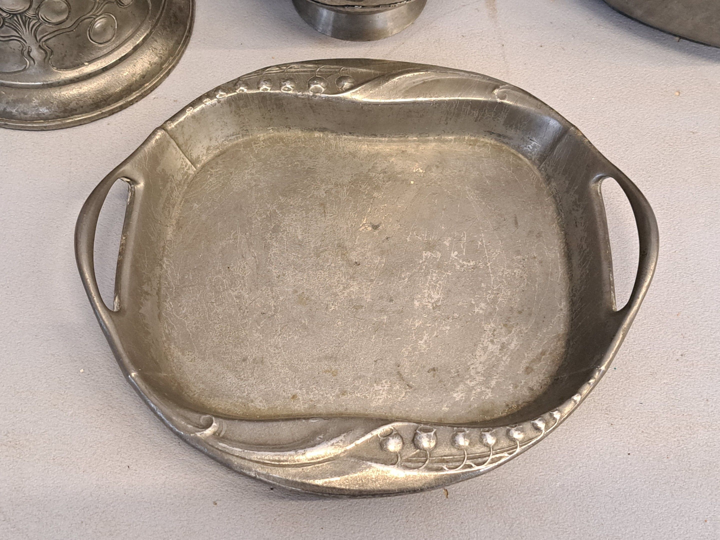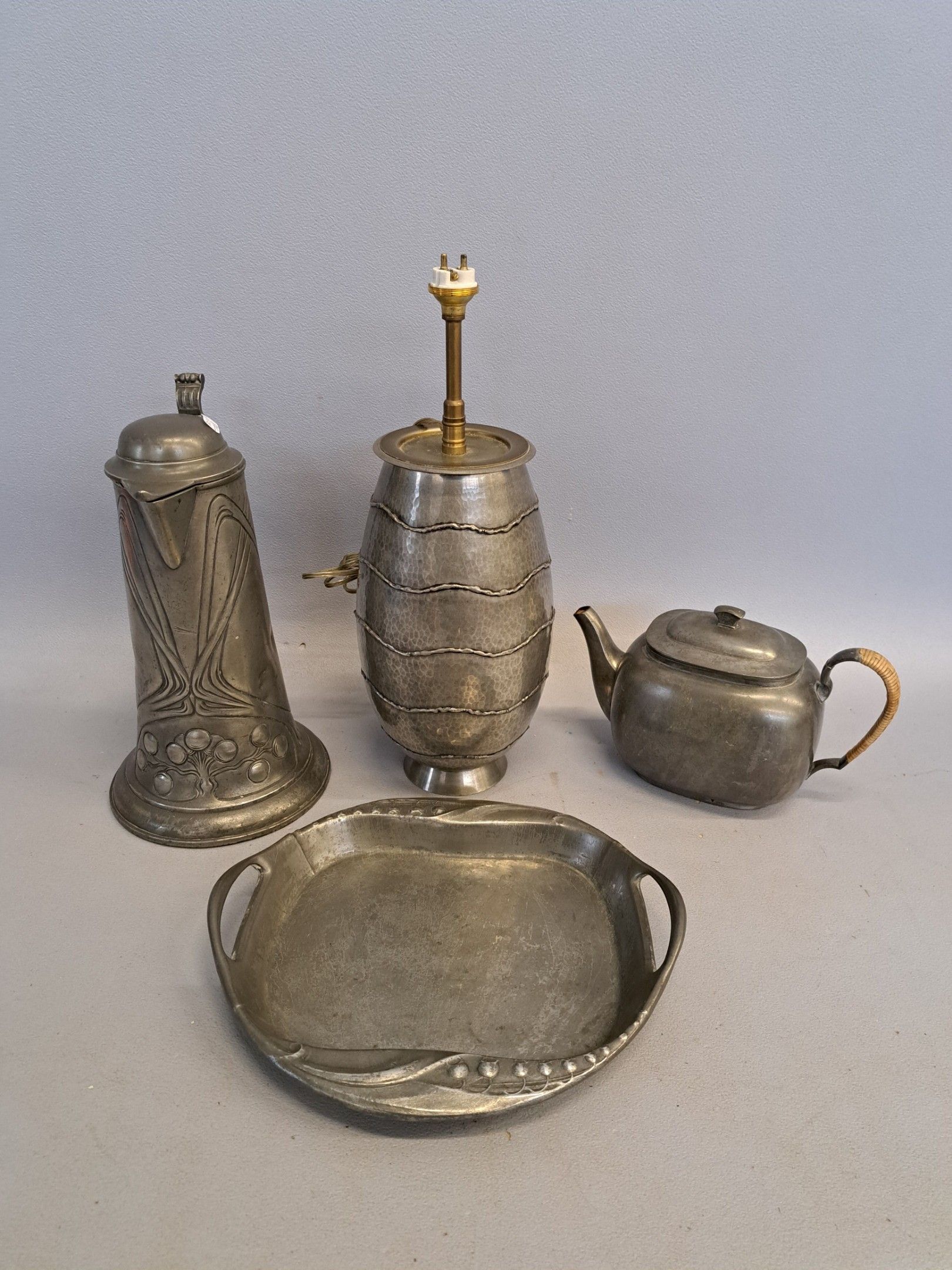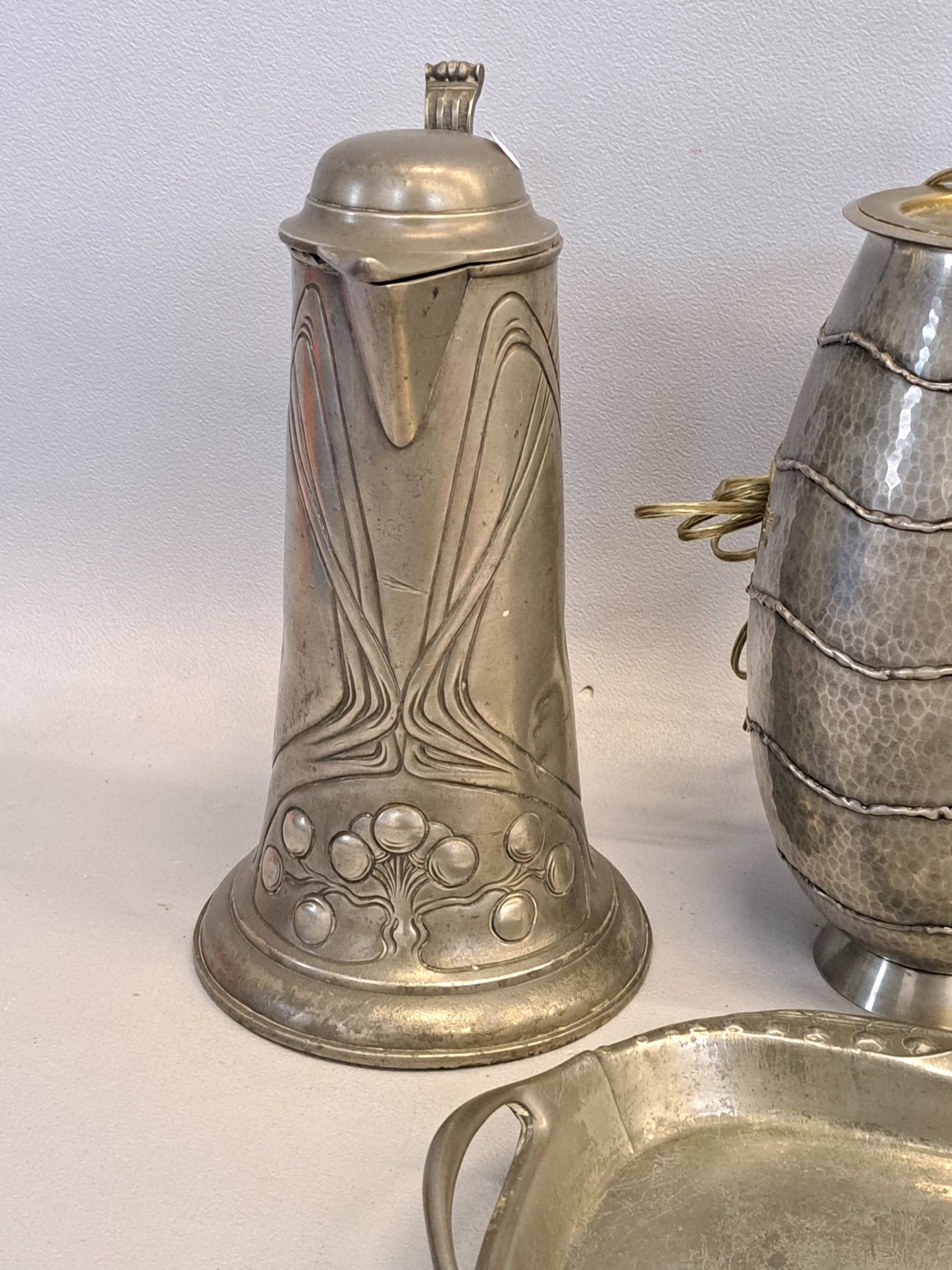 Set of four pewter pieces: covered pot, jug signed Just Andersen Denmark, tray with lily of the valley decoration by Kayserzinn and lamp-mounted vase signed Delavan. H. max. 27 cm.