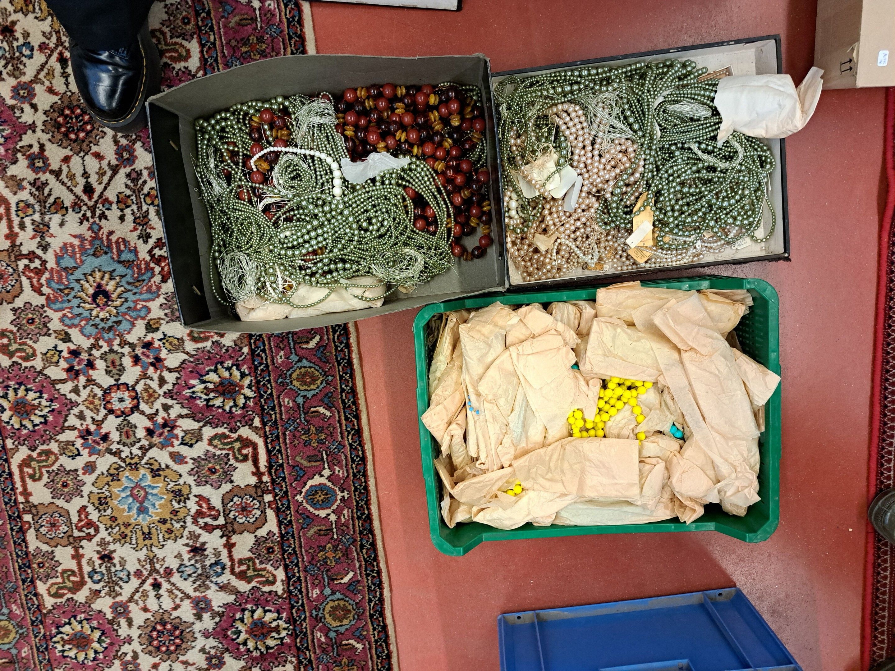 Three boxes of pearls in various colours.