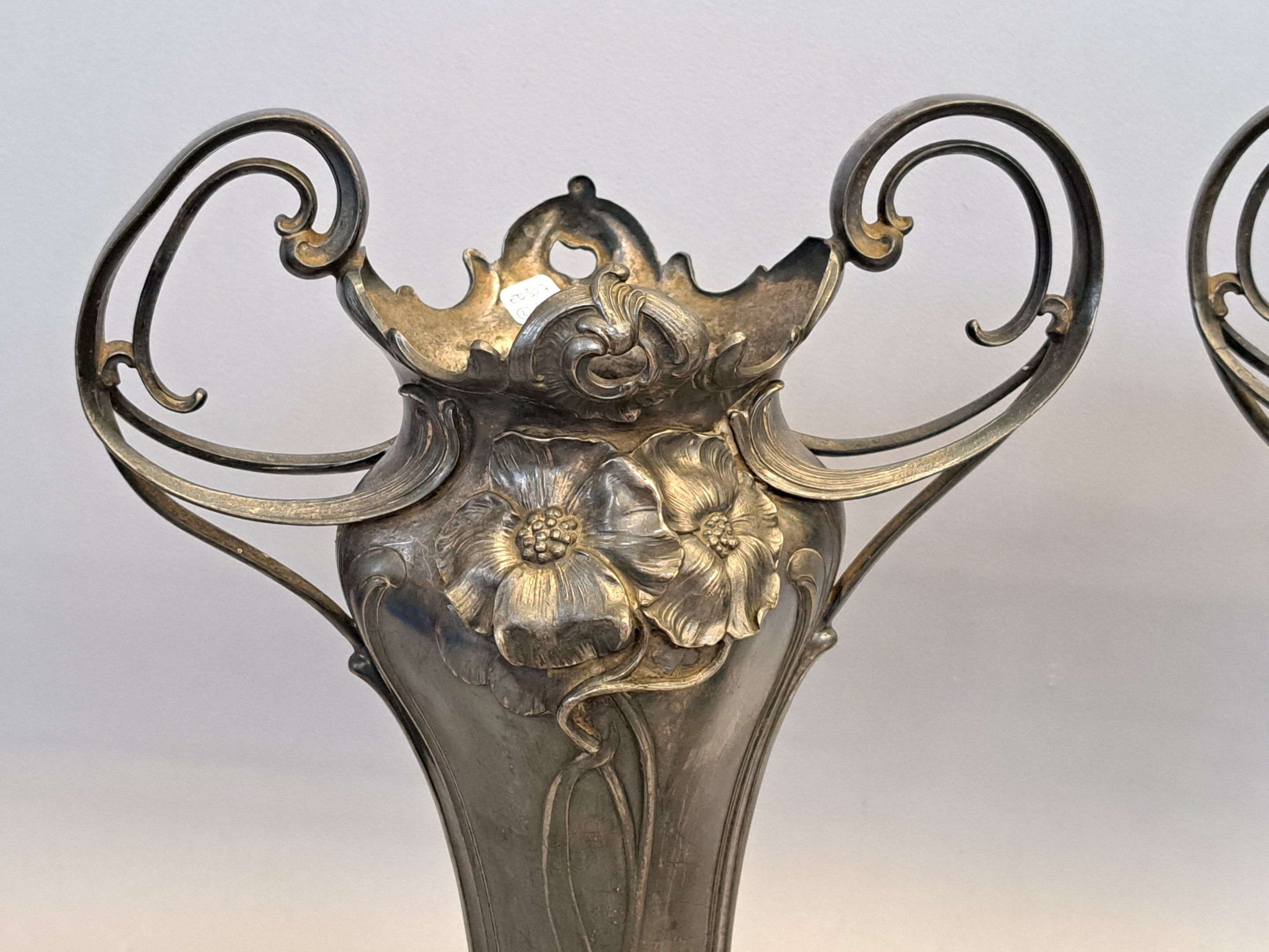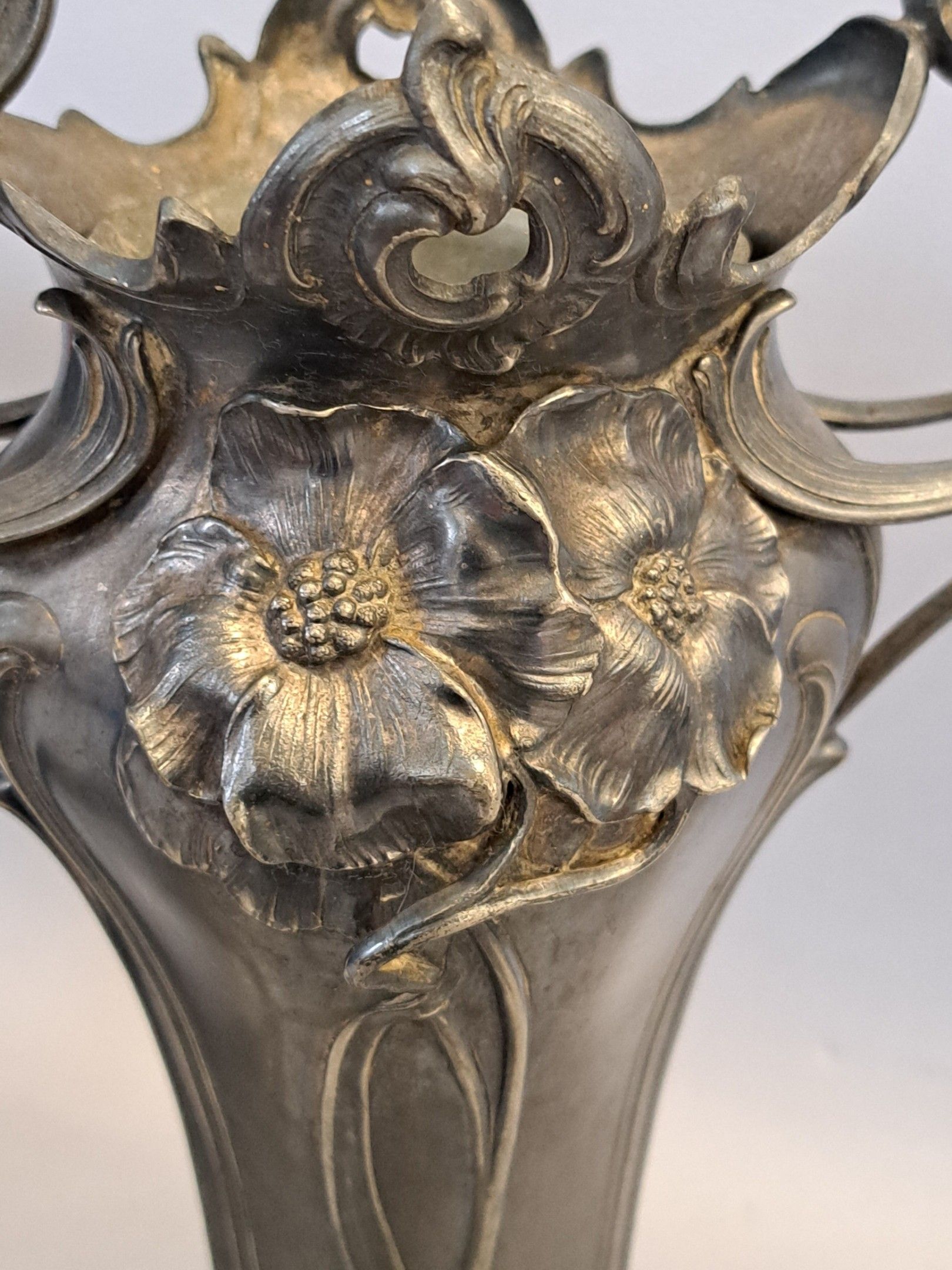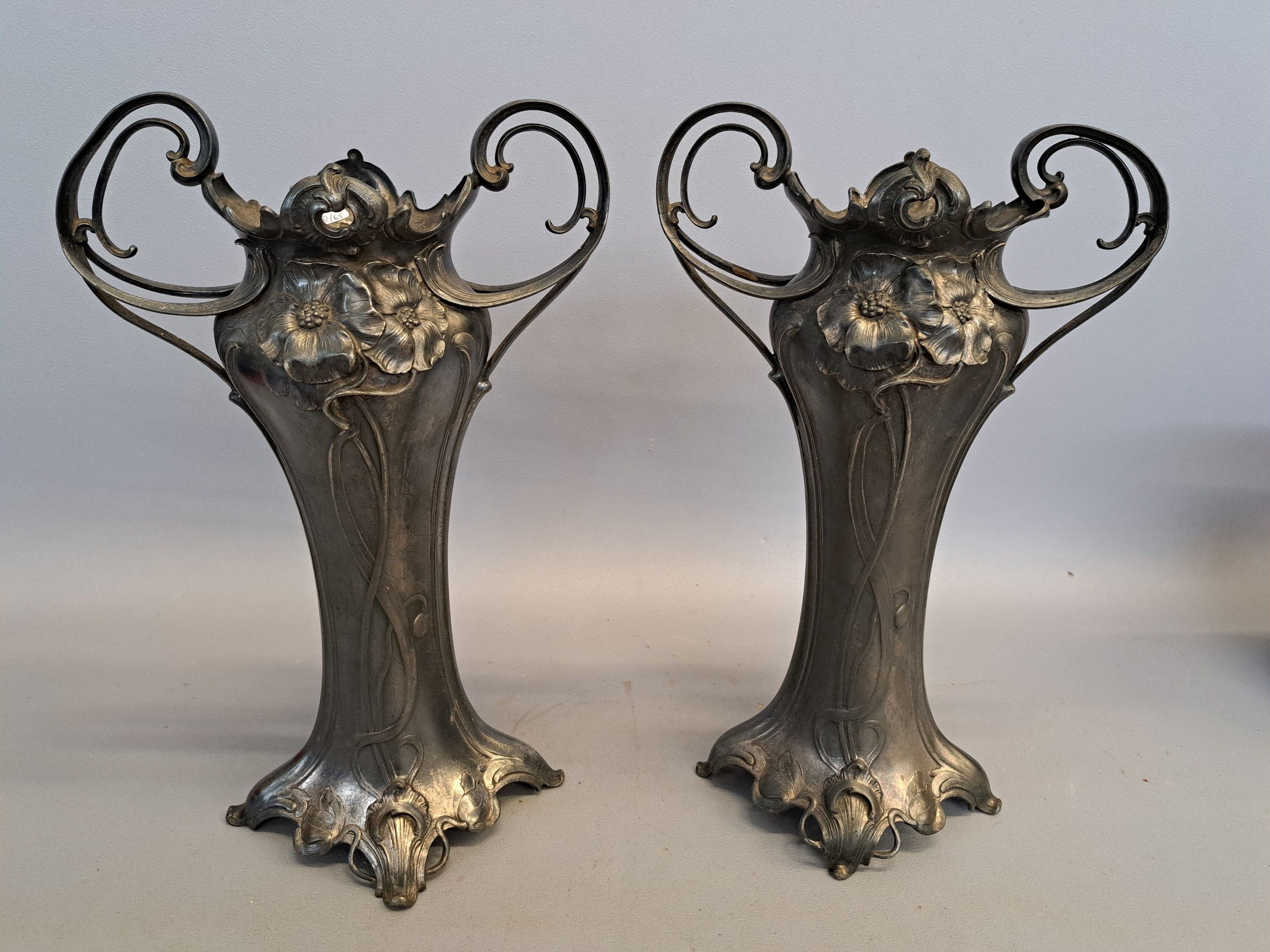 A pair of pewter baluster vases and side handles decorated with flowers. One without its interior. Worked circa 1900. 41 cm.