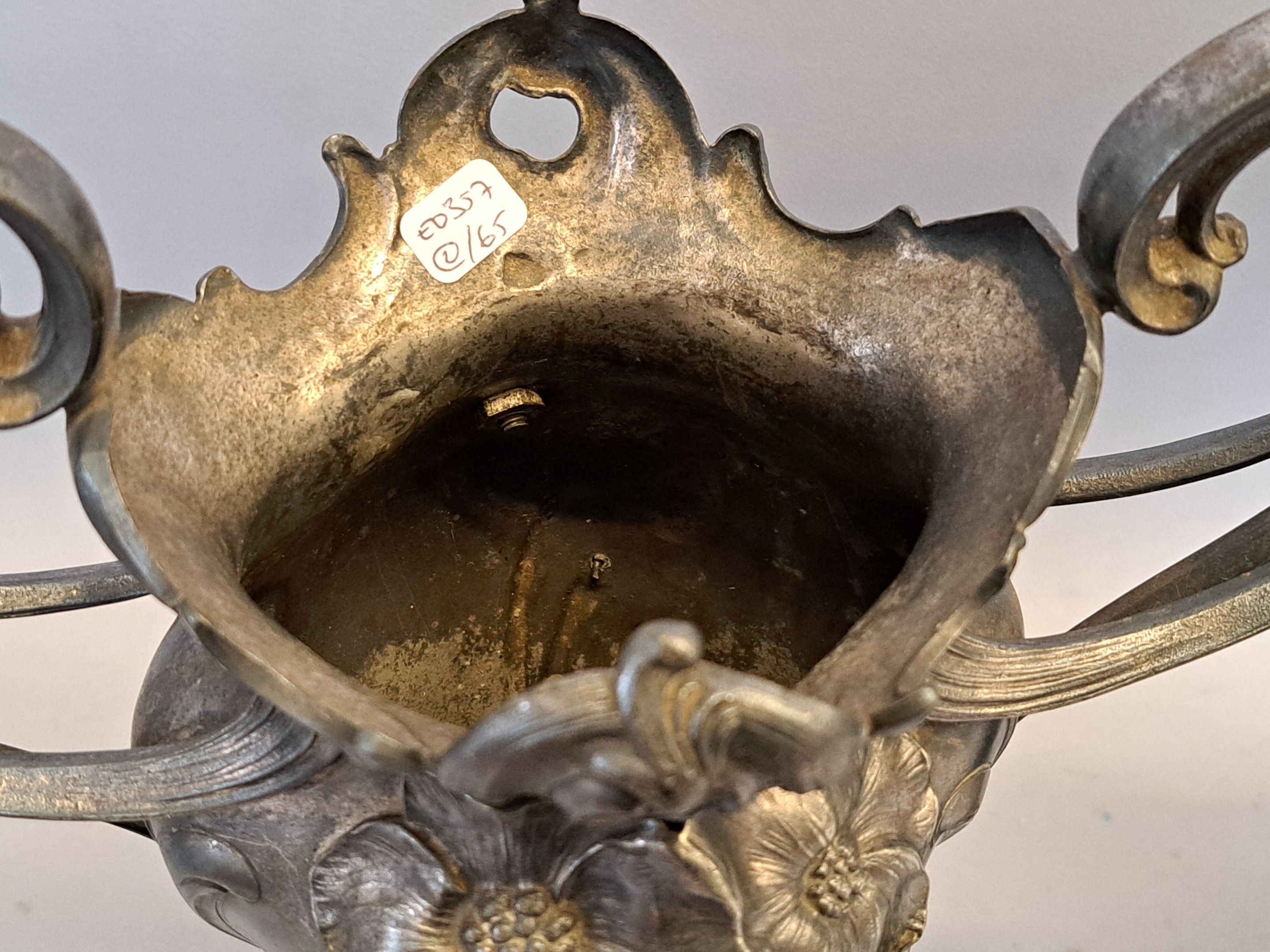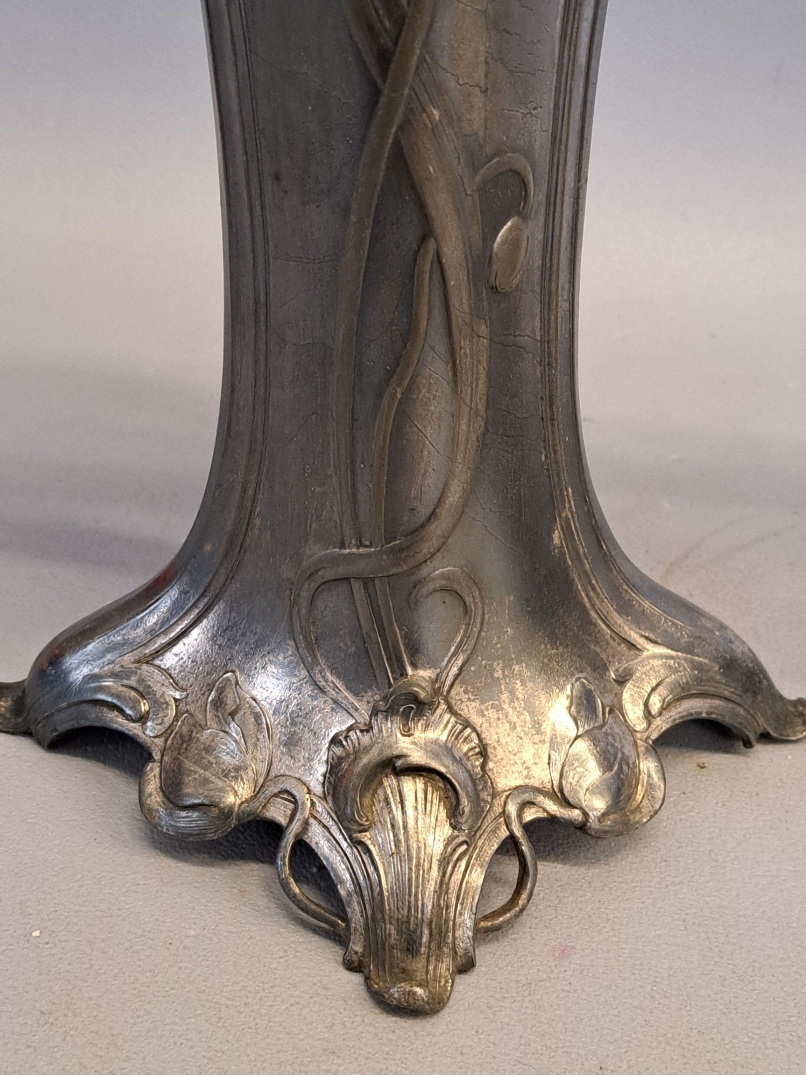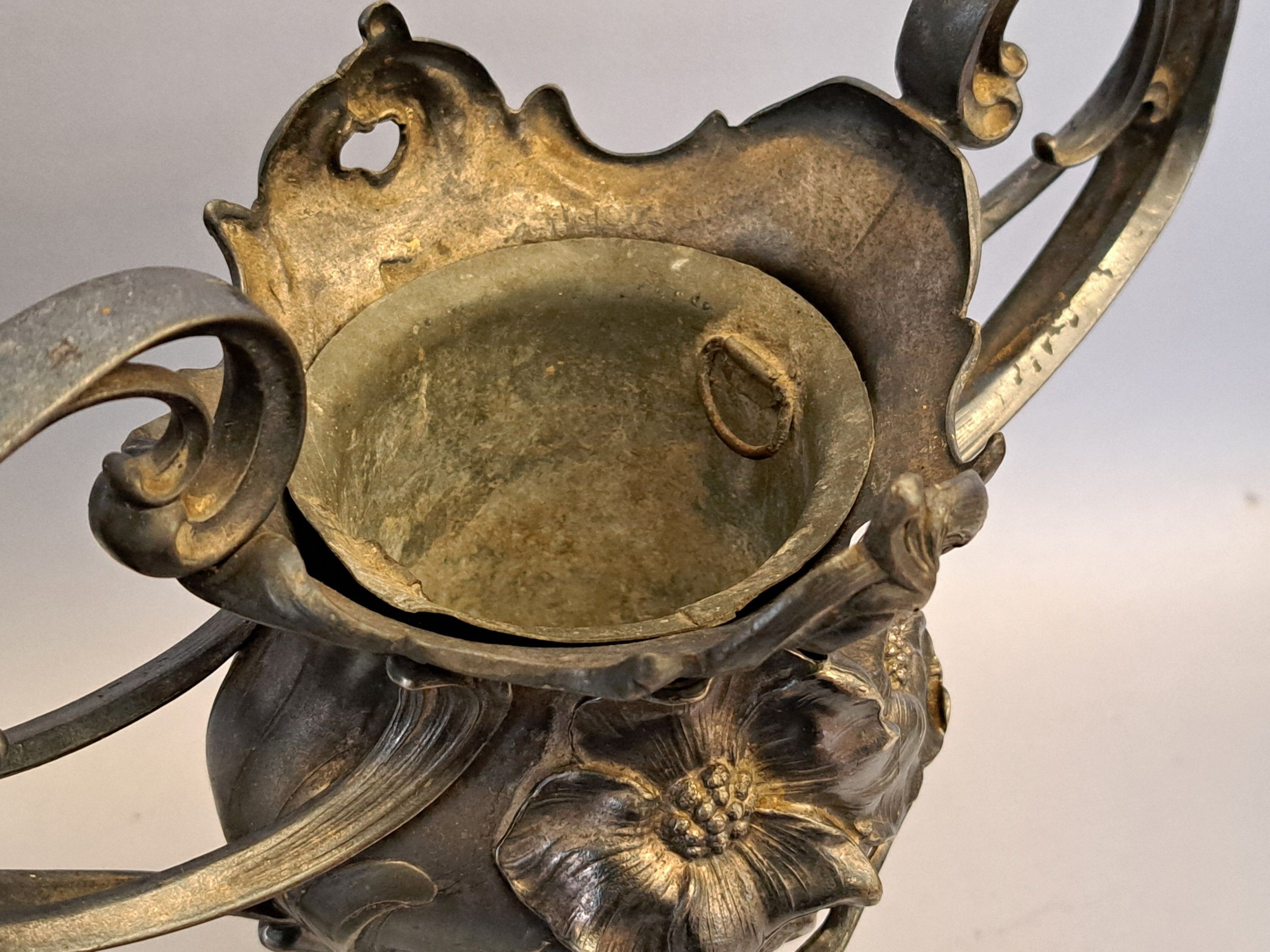 A pair of pewter baluster vases and side handles decorated with flowers. One without its interior. Worked circa 1900. 41 cm.