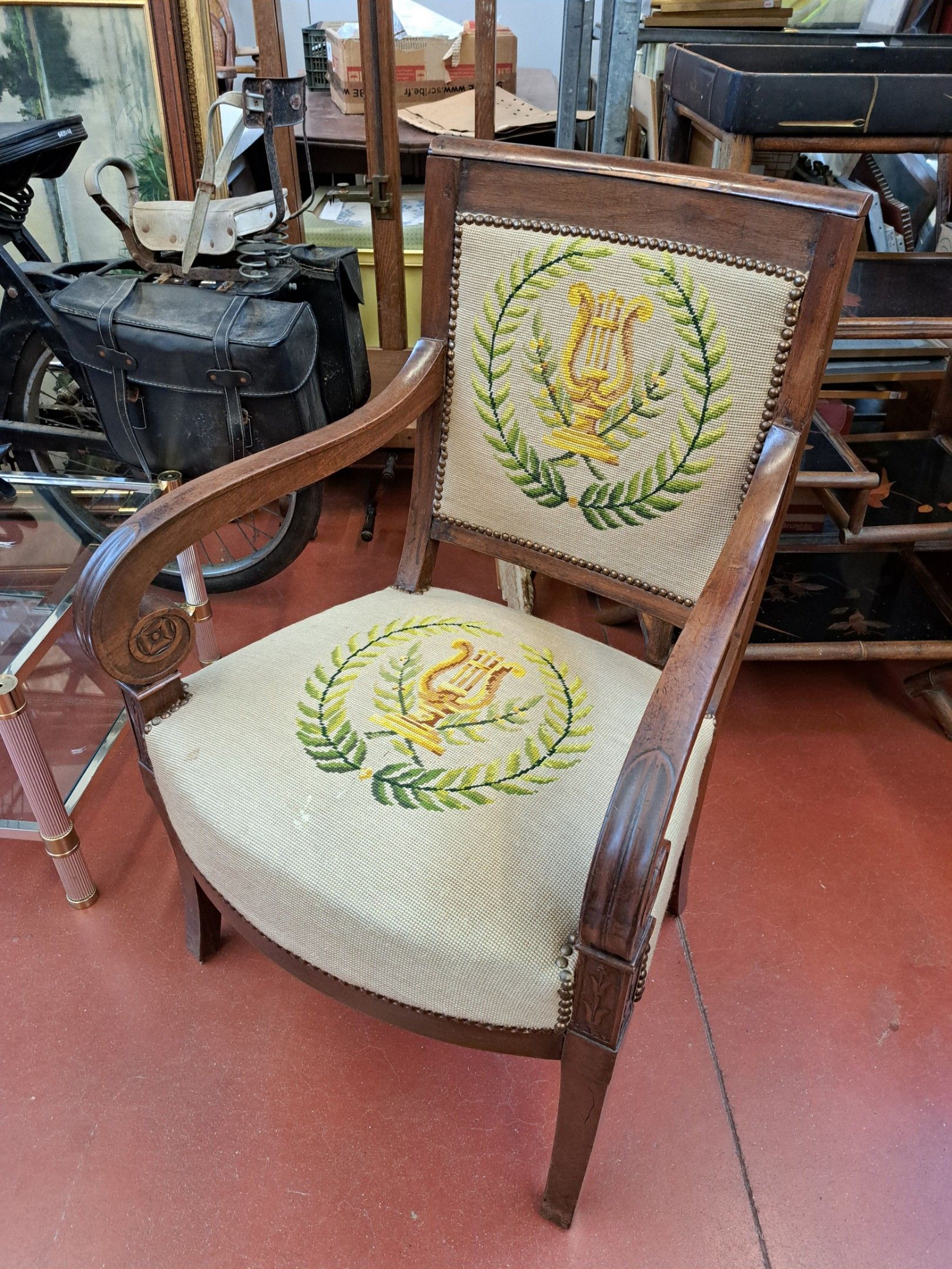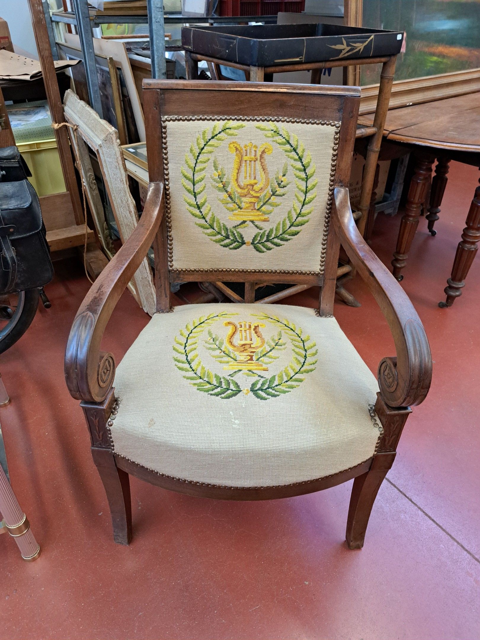 Mahogany and mahogany veneer armchair with richly carved decoration, the sabre-shaped uprights supporting scrolled armrests. Directoire style.