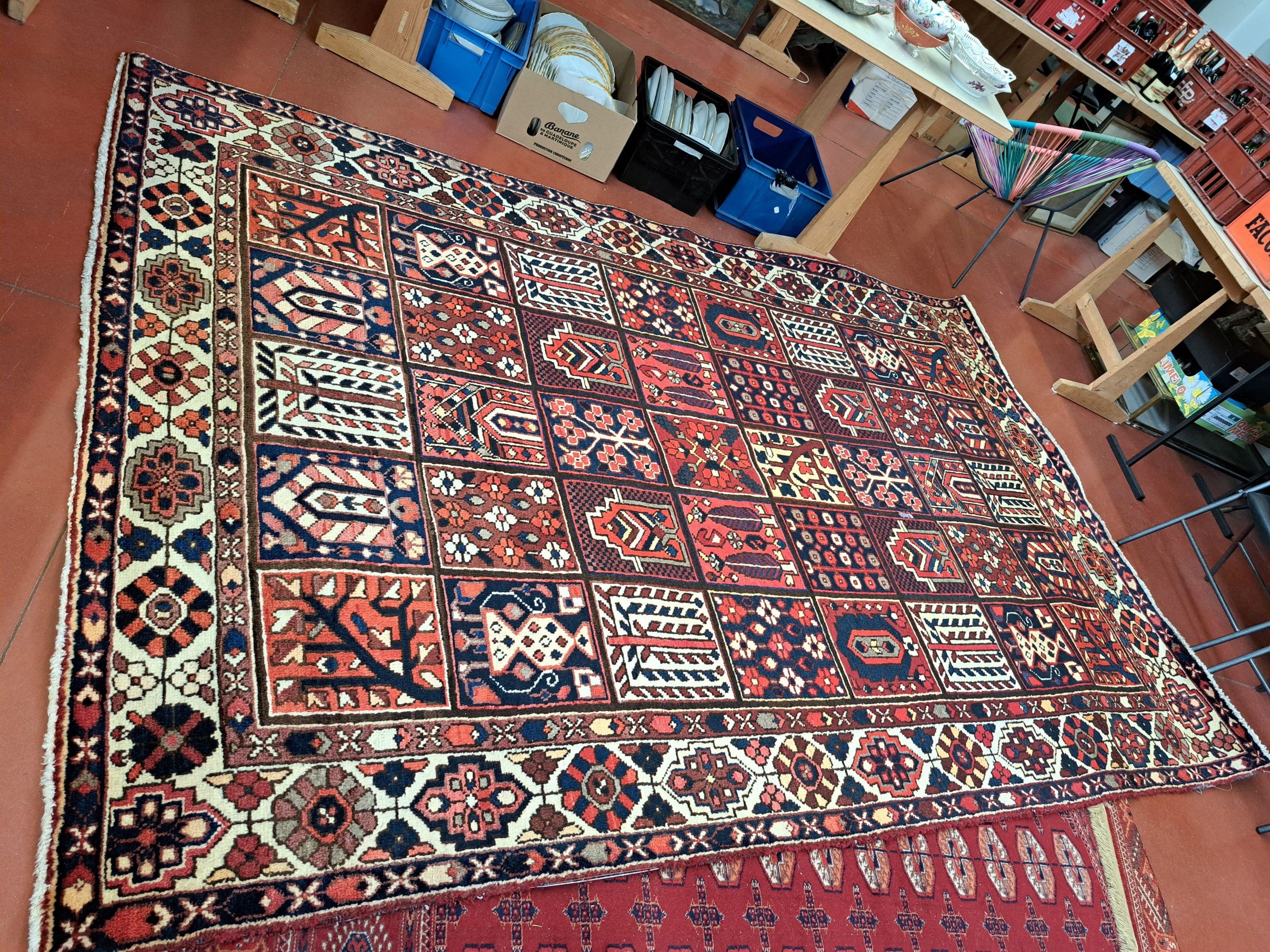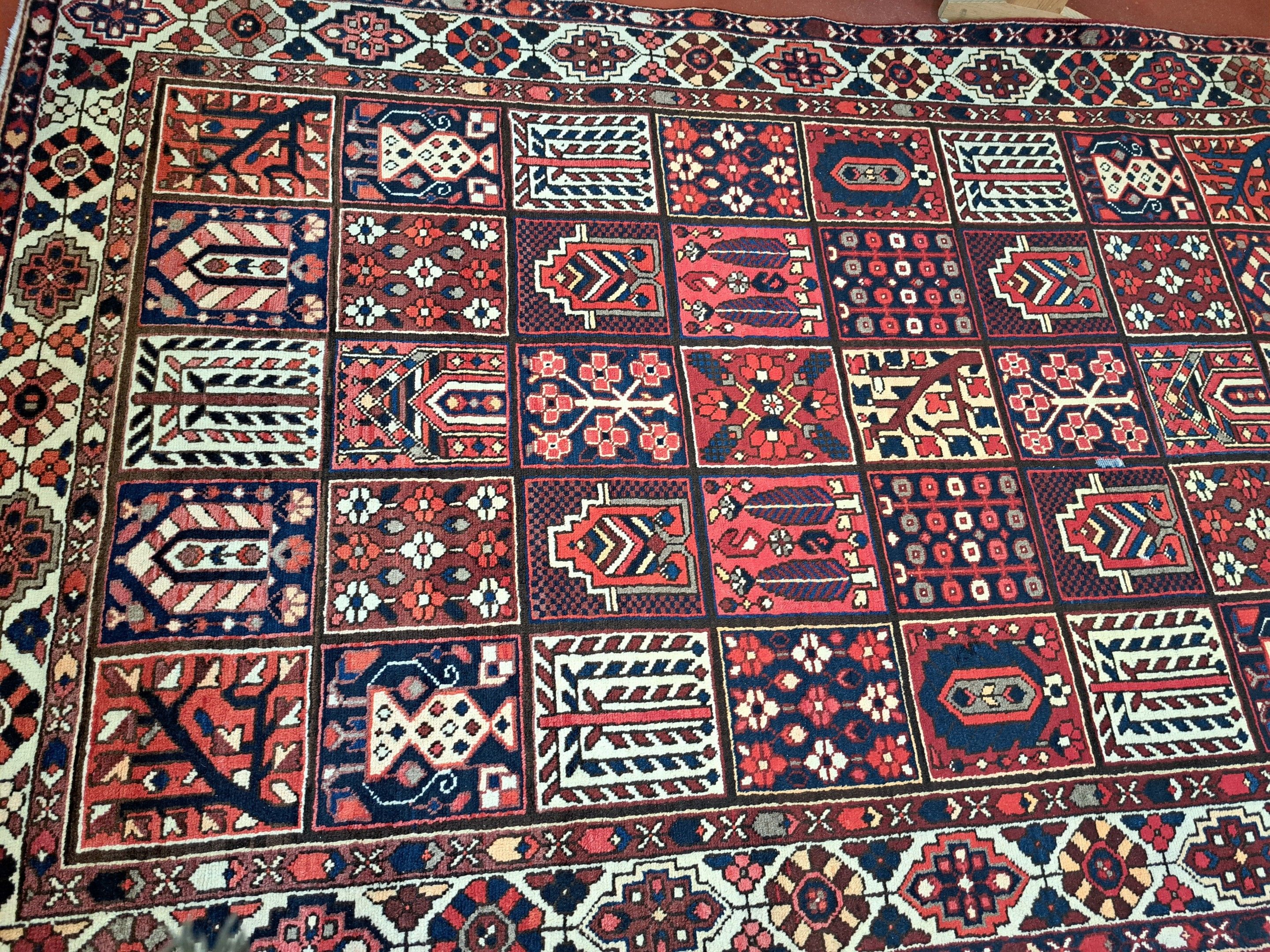 Iran, wool carpet with black, red and white compartmentalized garden design,