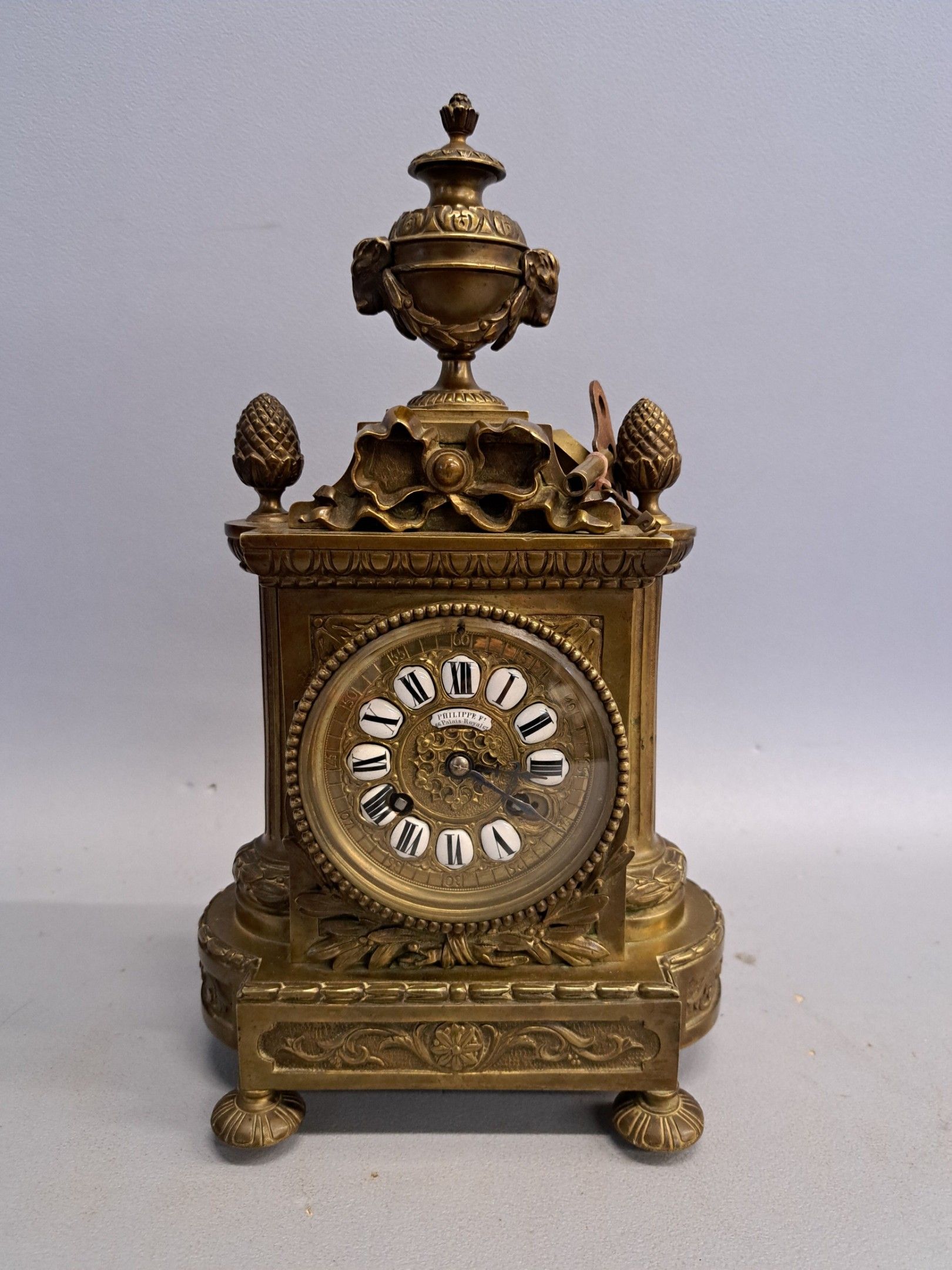 Louis XVI style bronze "Philippe au palais royal" clock, one cartouche missing. Height 36 cm.