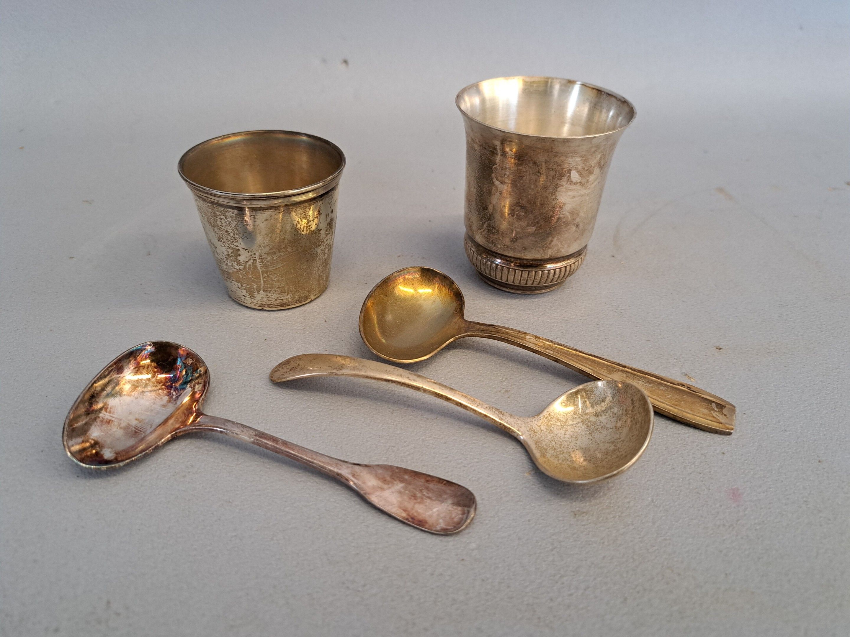 Two silver-plated kettledrums and three silver-plated porridge spoons.