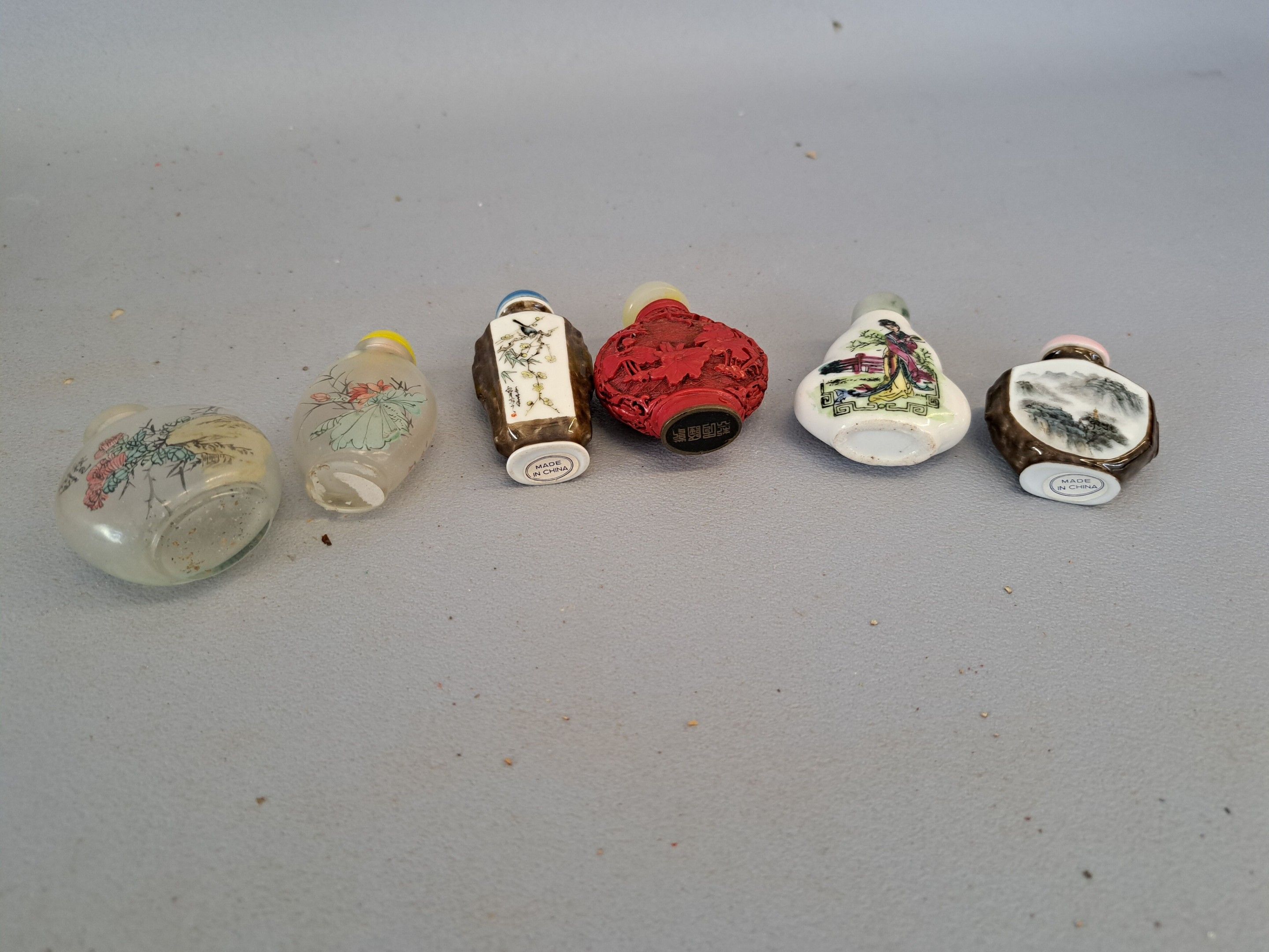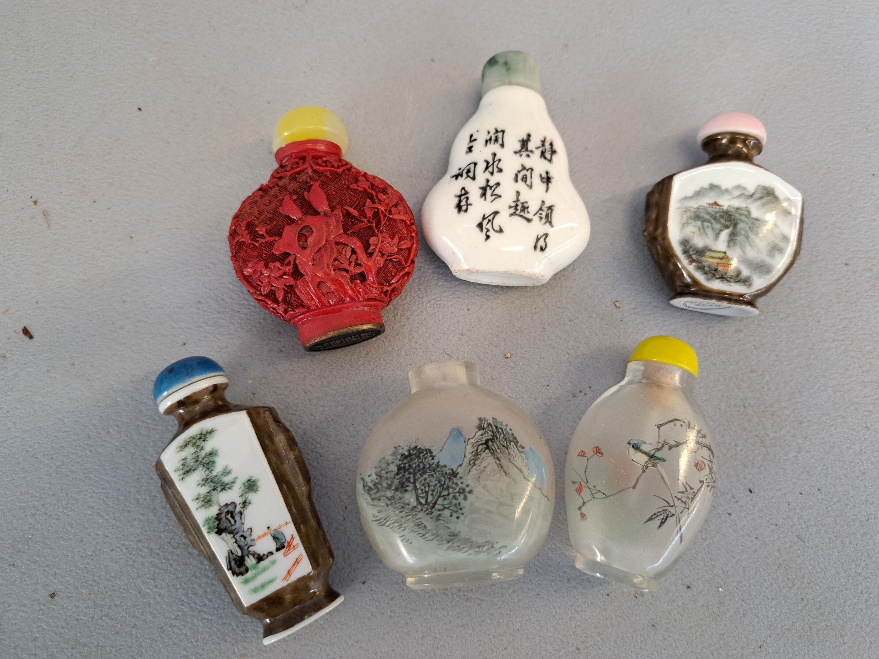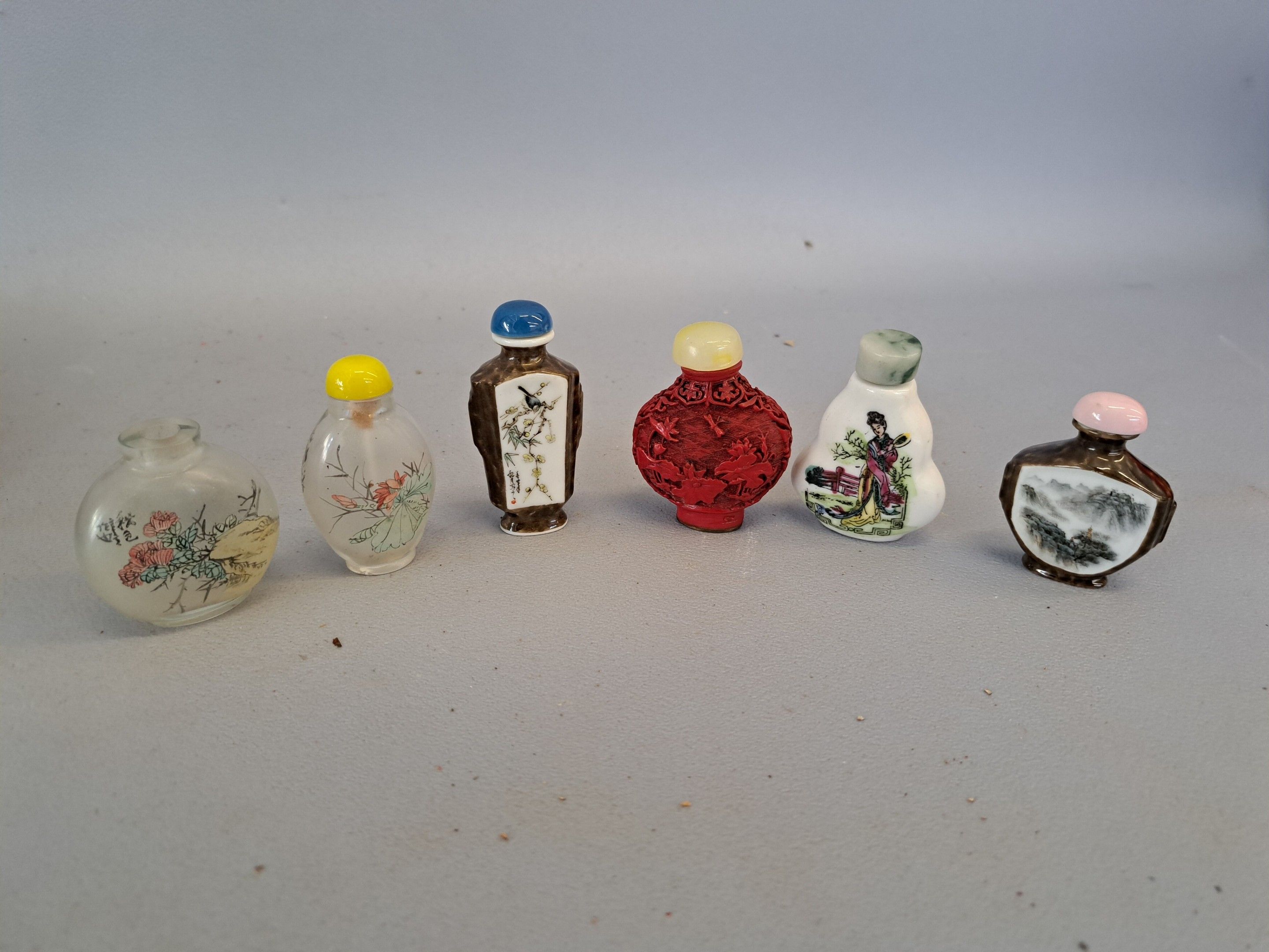 six snuffboxes in painted glass, porcelain or lacquer, with vegetal or animated decoration.