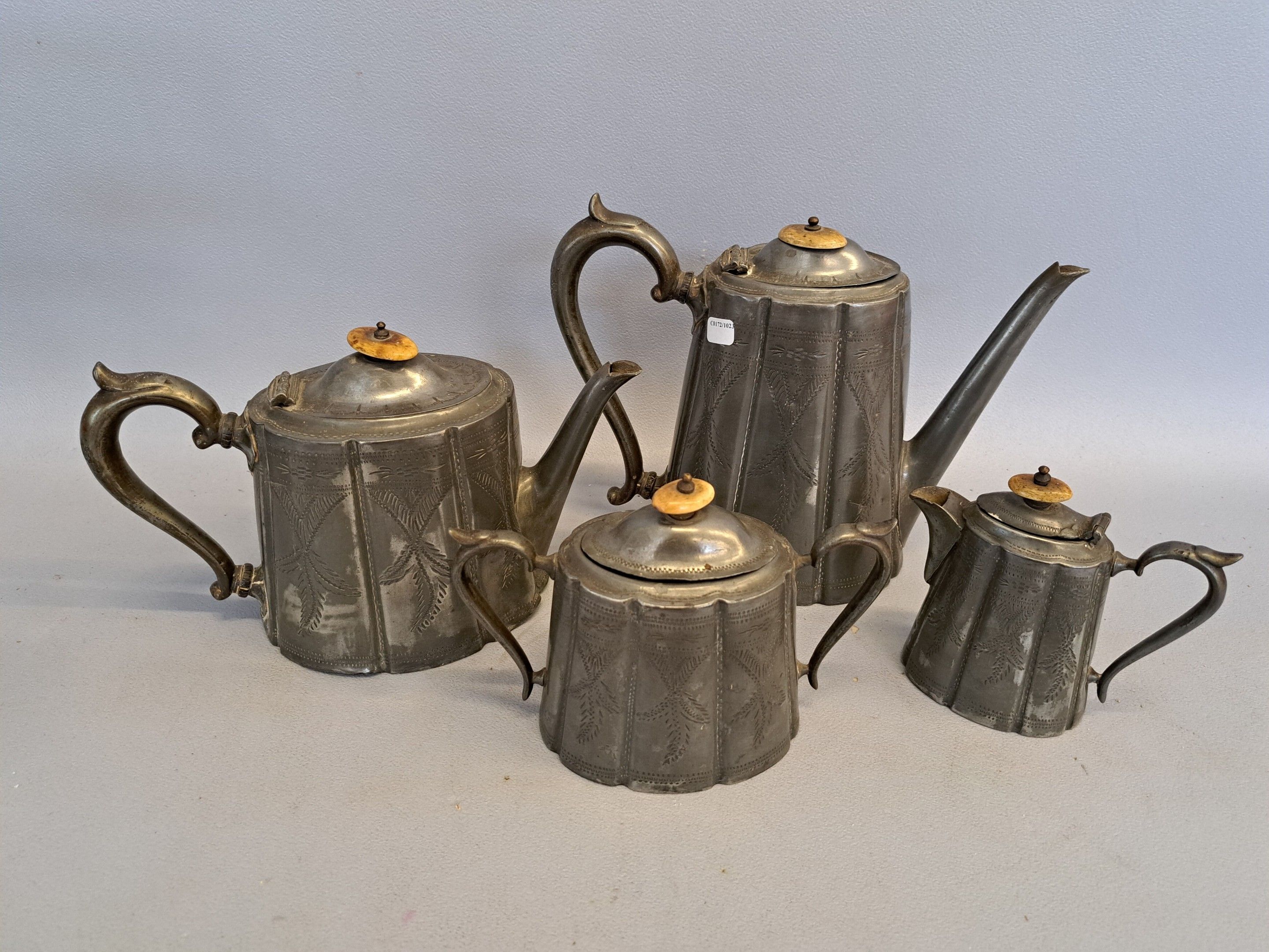 Pewter tea and coffee set with incised motif, horn handle, including two jugs, milk jug and sugar bowl.