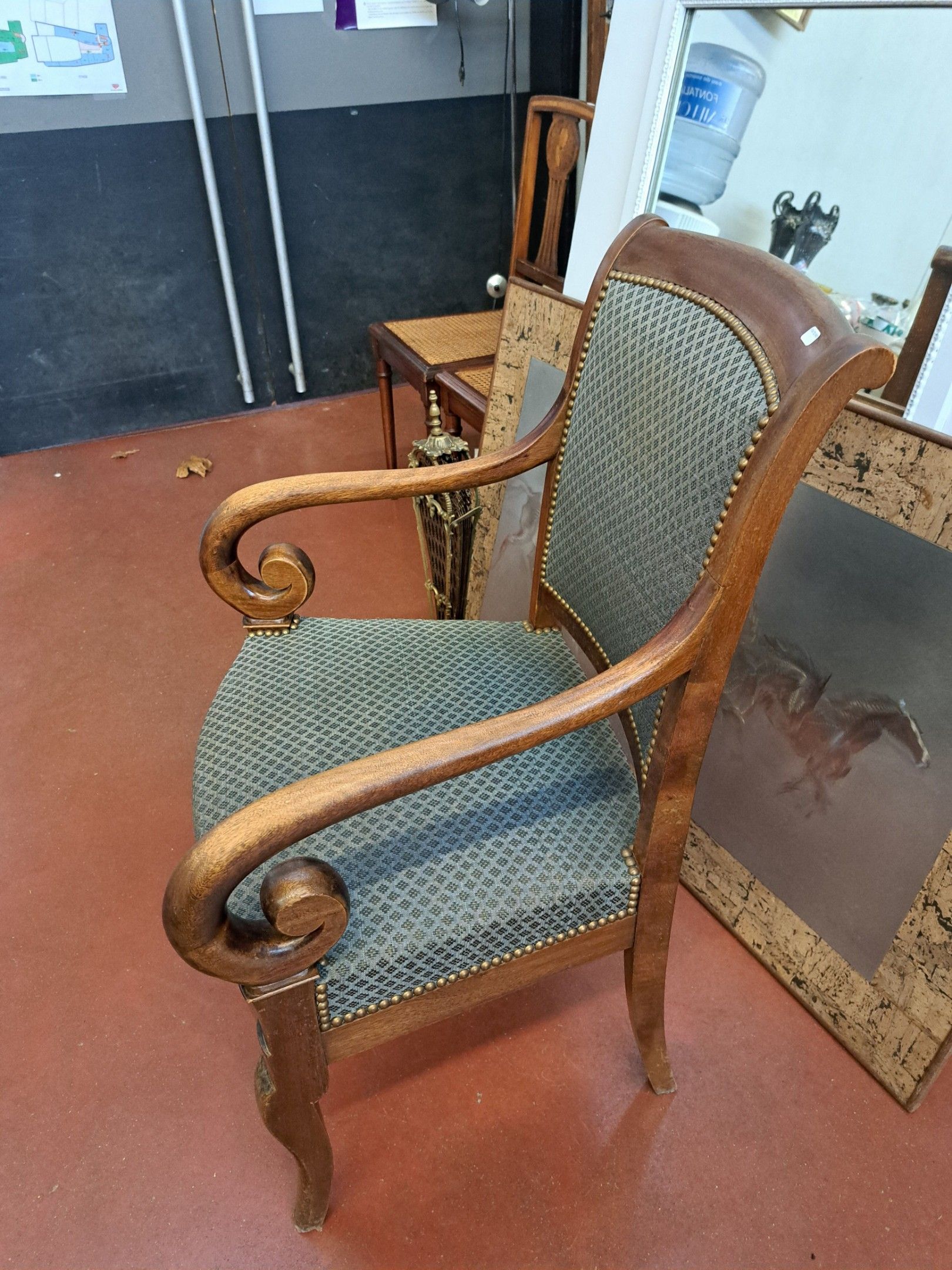 Mahogany and mahogany veneer armchair with rich carved decoration, scrolled armrests. Directoire style.