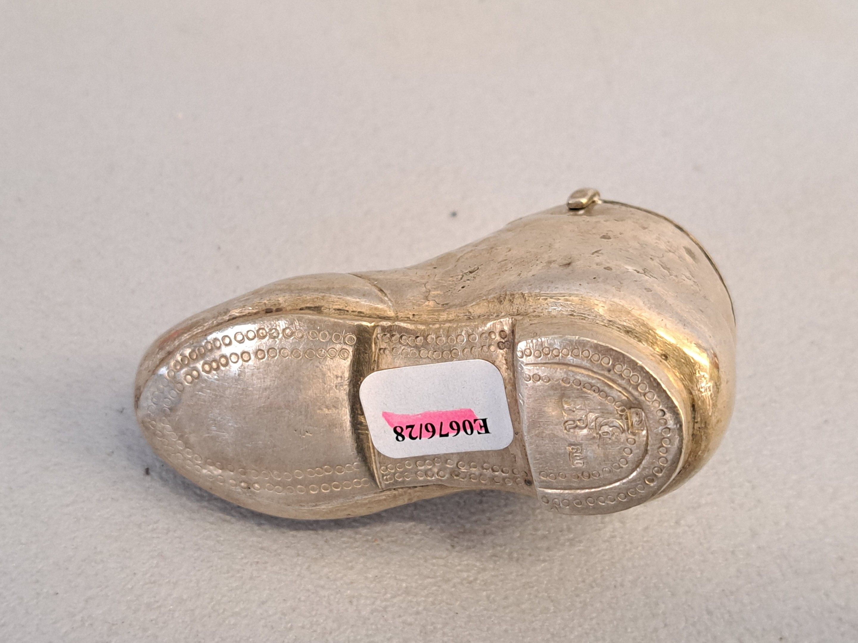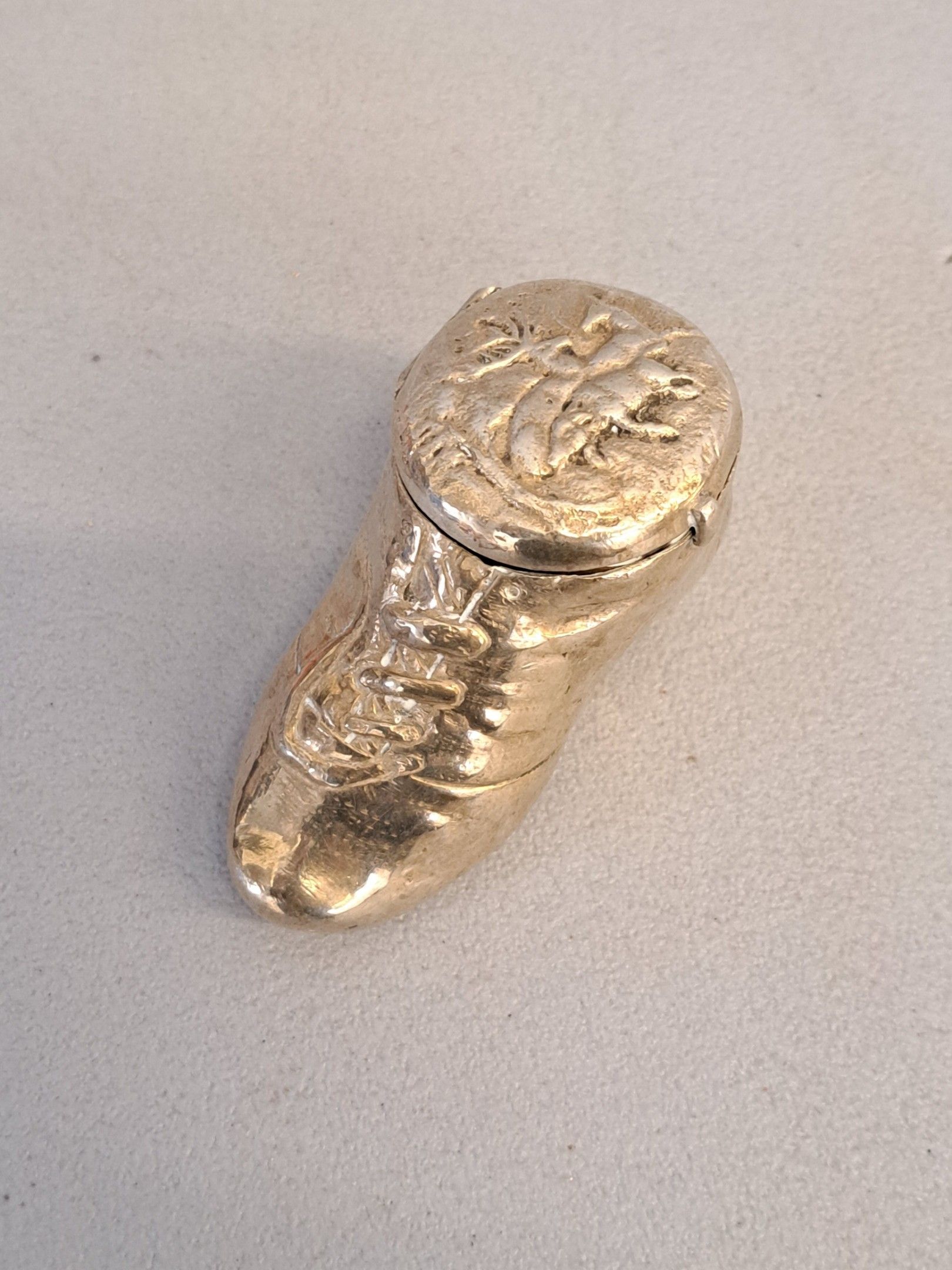 Snuffbox in silver 800 thousandths (hallmark charançon) in the shape of a shoe. Foreign work Late 19th - Early 20th century.