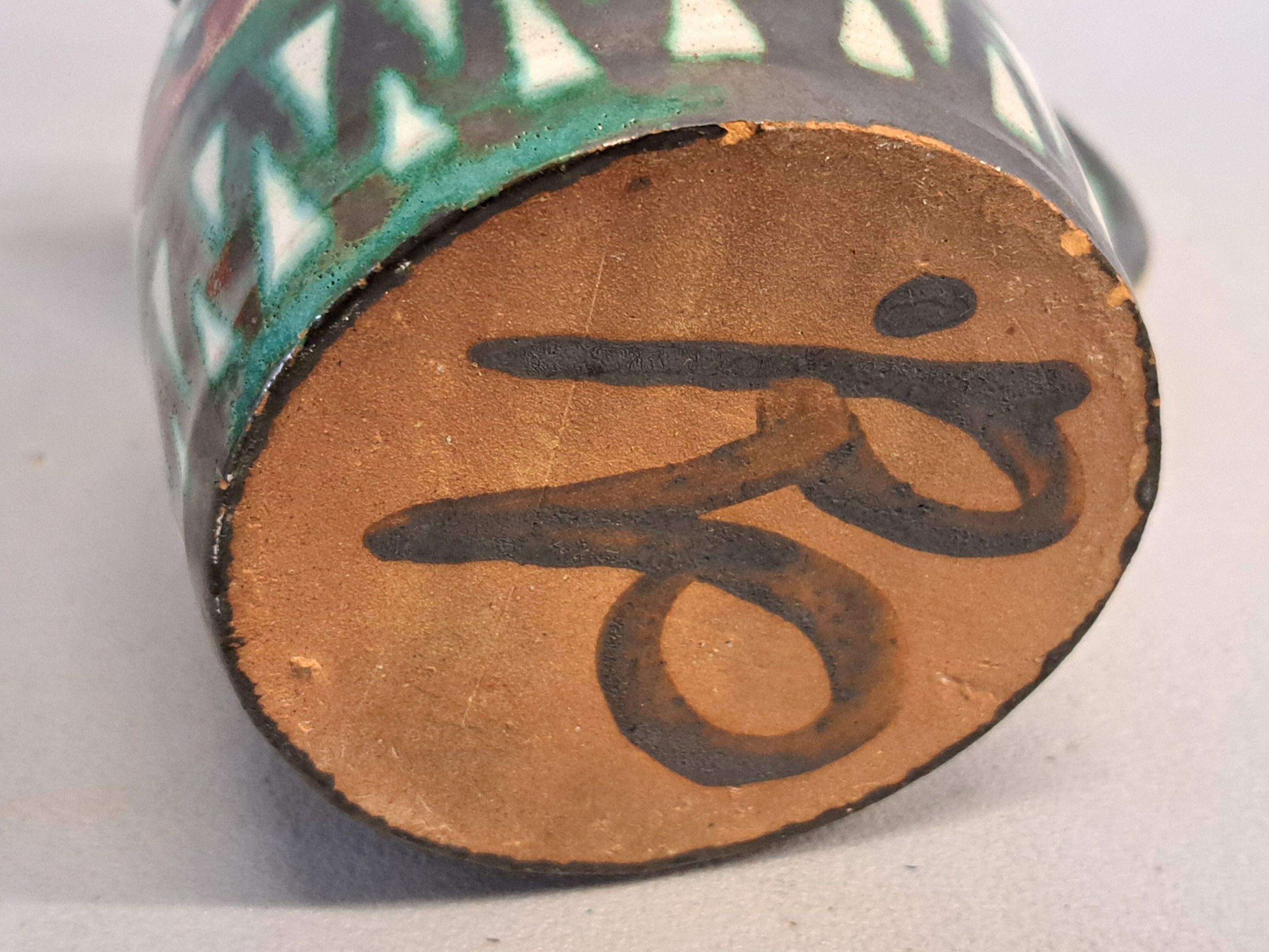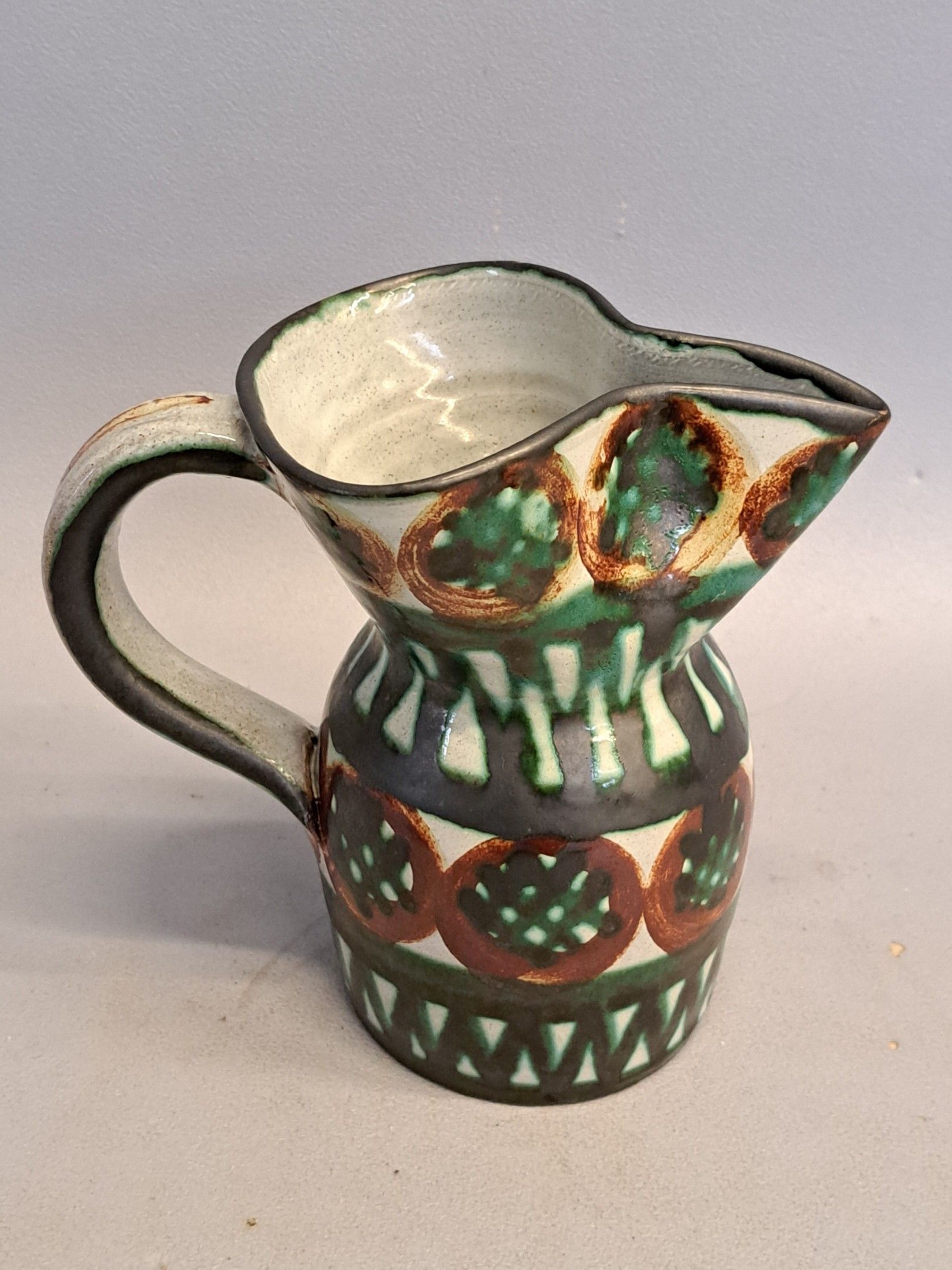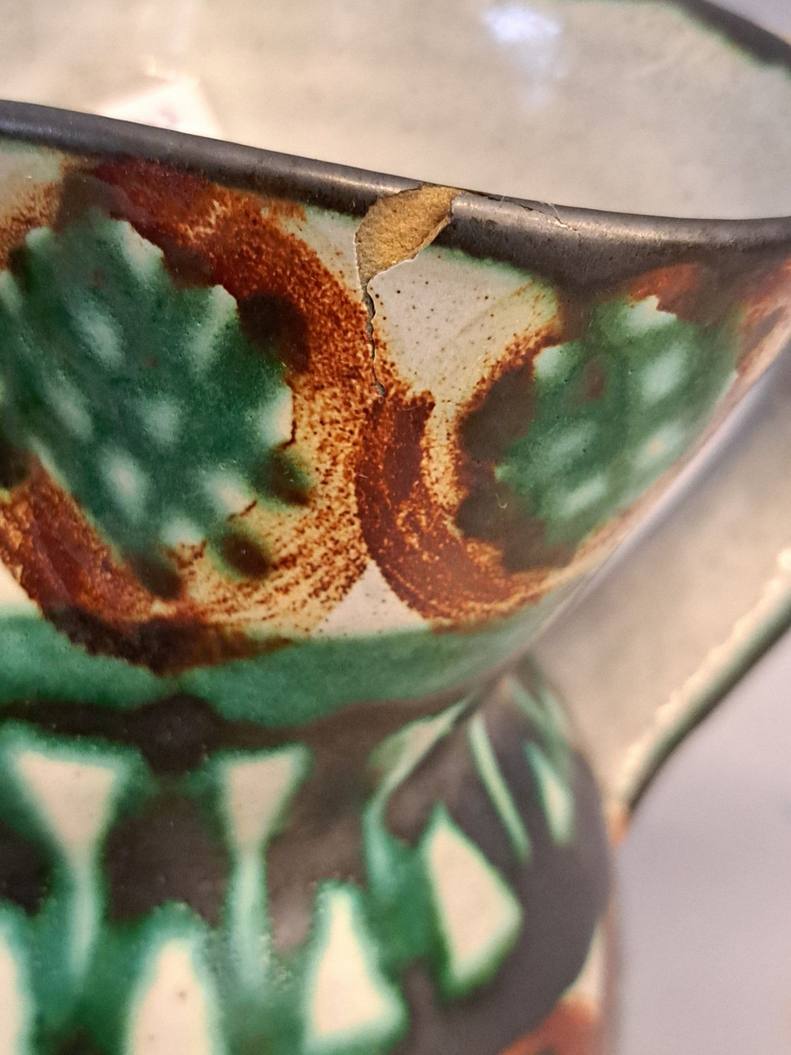 Brown and green glazed earthenware jug. Height: 18 cm.