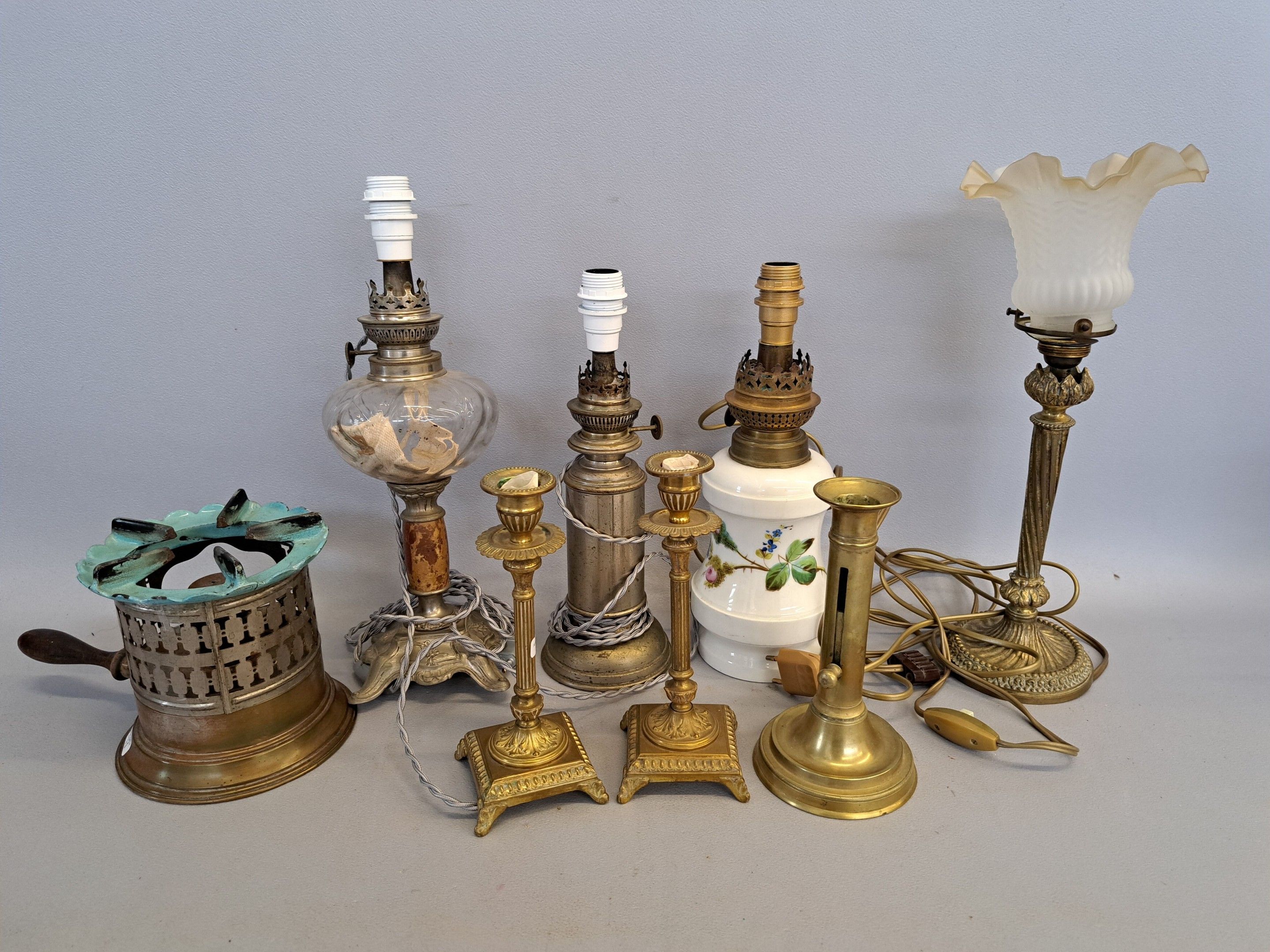 Three spirit lamps and four candleholders, one of which is mounted as a lamp. Circa 1900.
