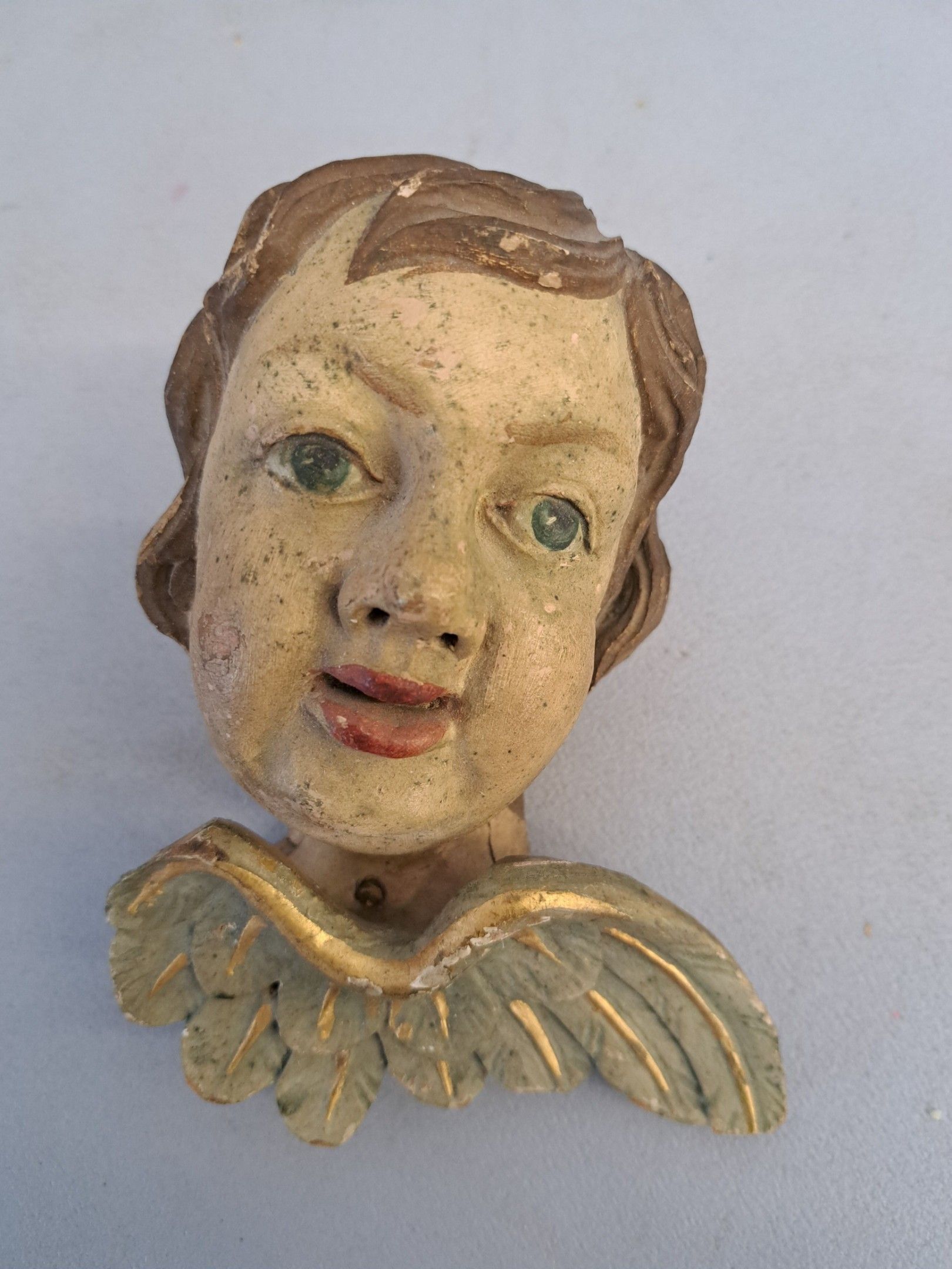 Polychrome carved wooden cherub.