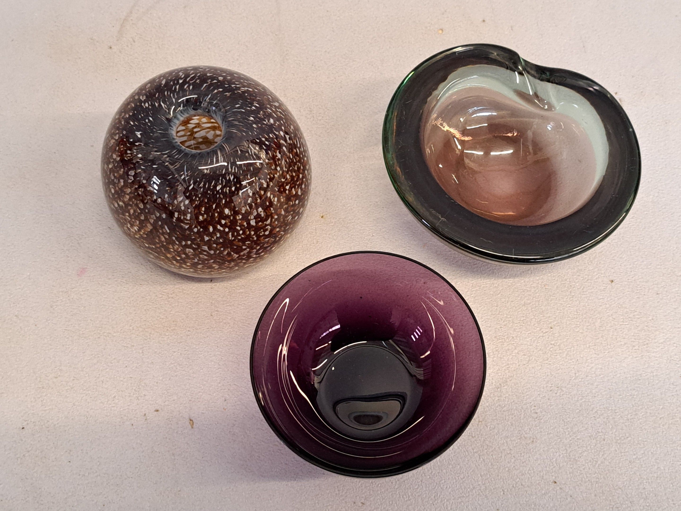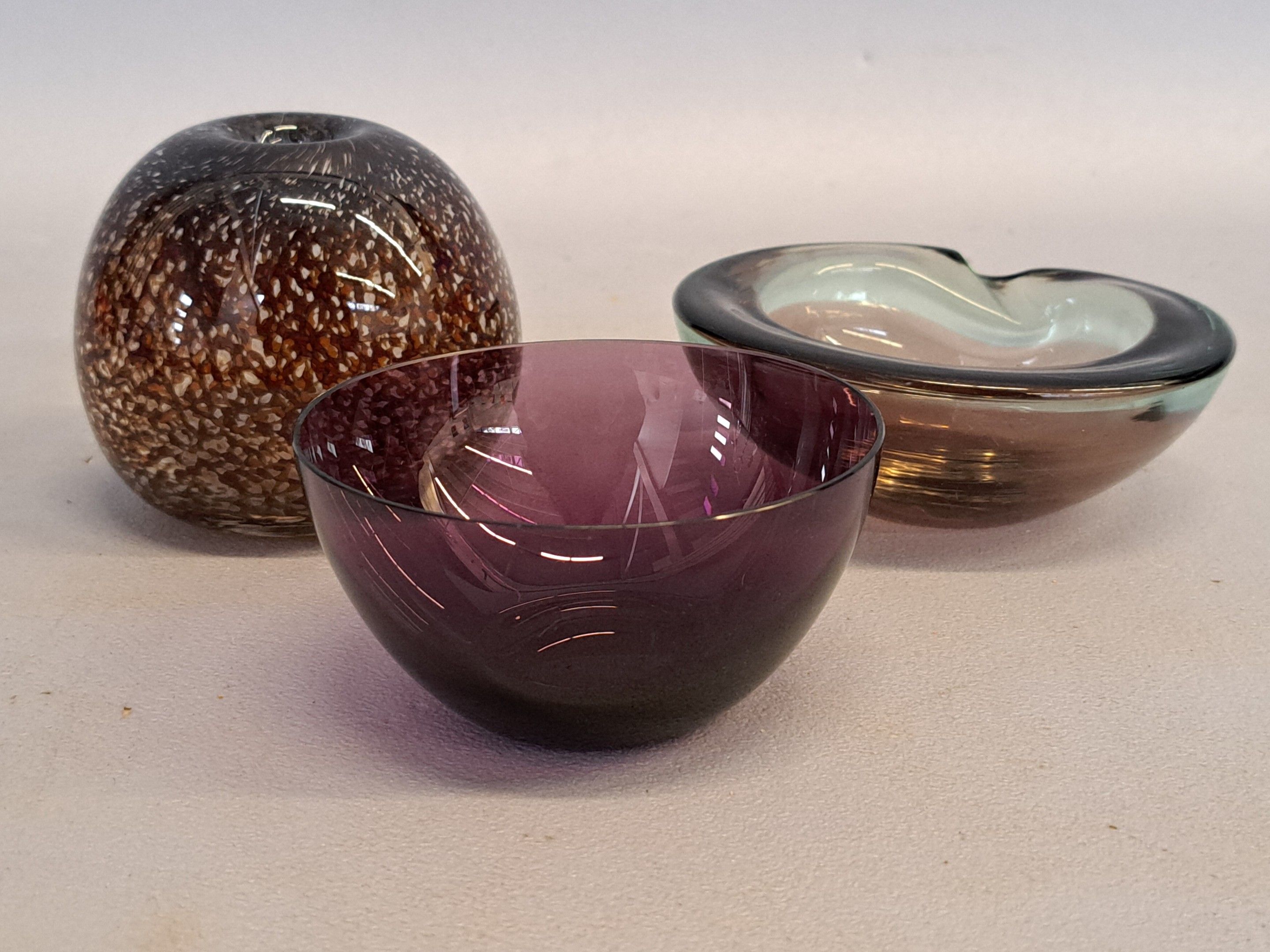A mottled glass soliflore vase and a mauve glass ashtray.