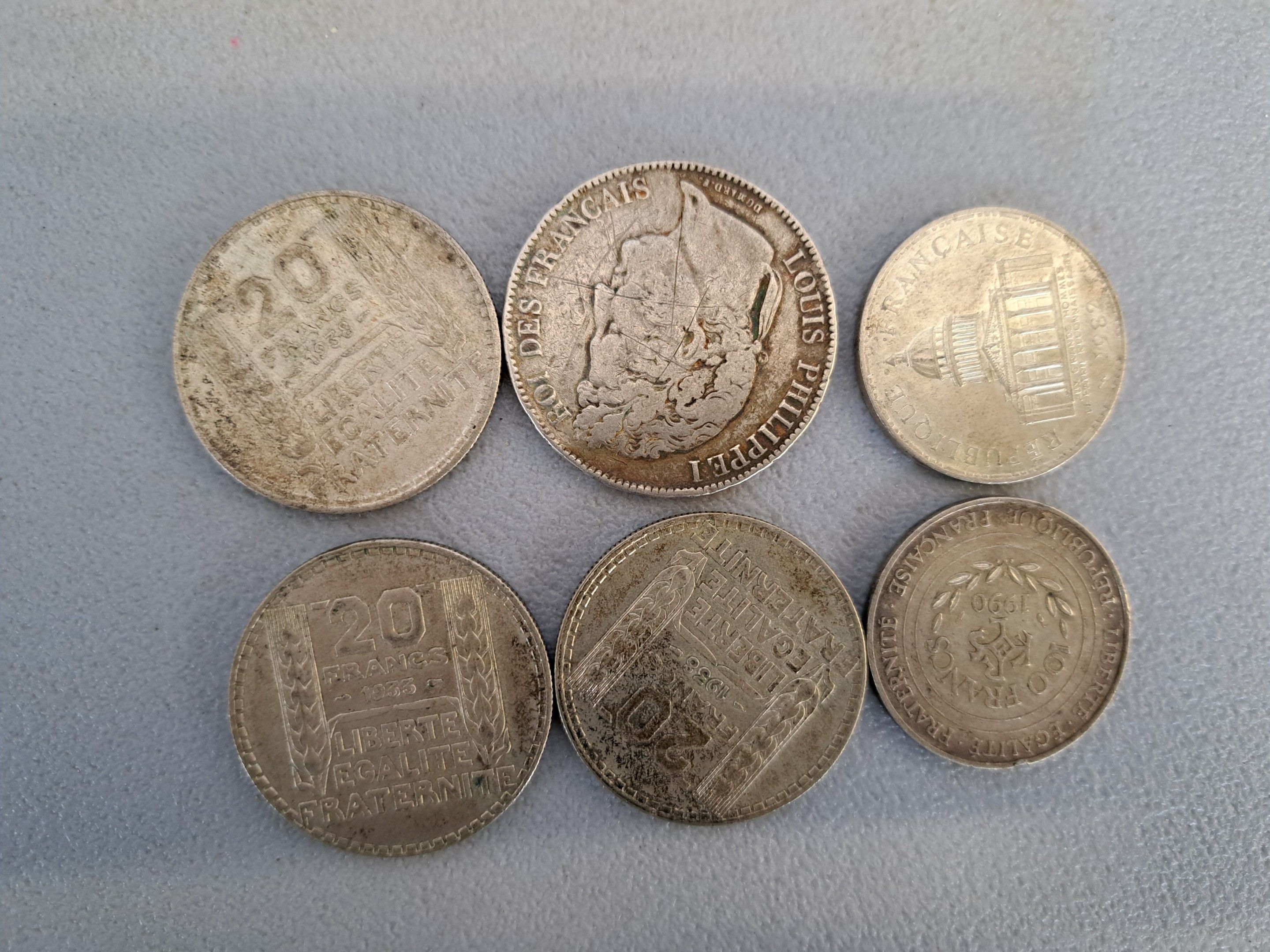 Six silver coins including three 20 franc coins from 1933 and 1938. Wear and tear.