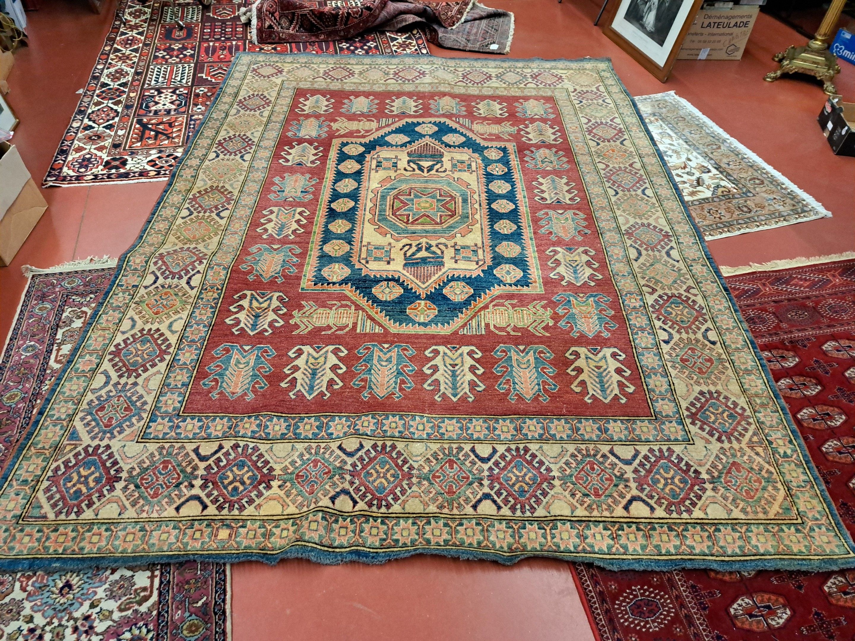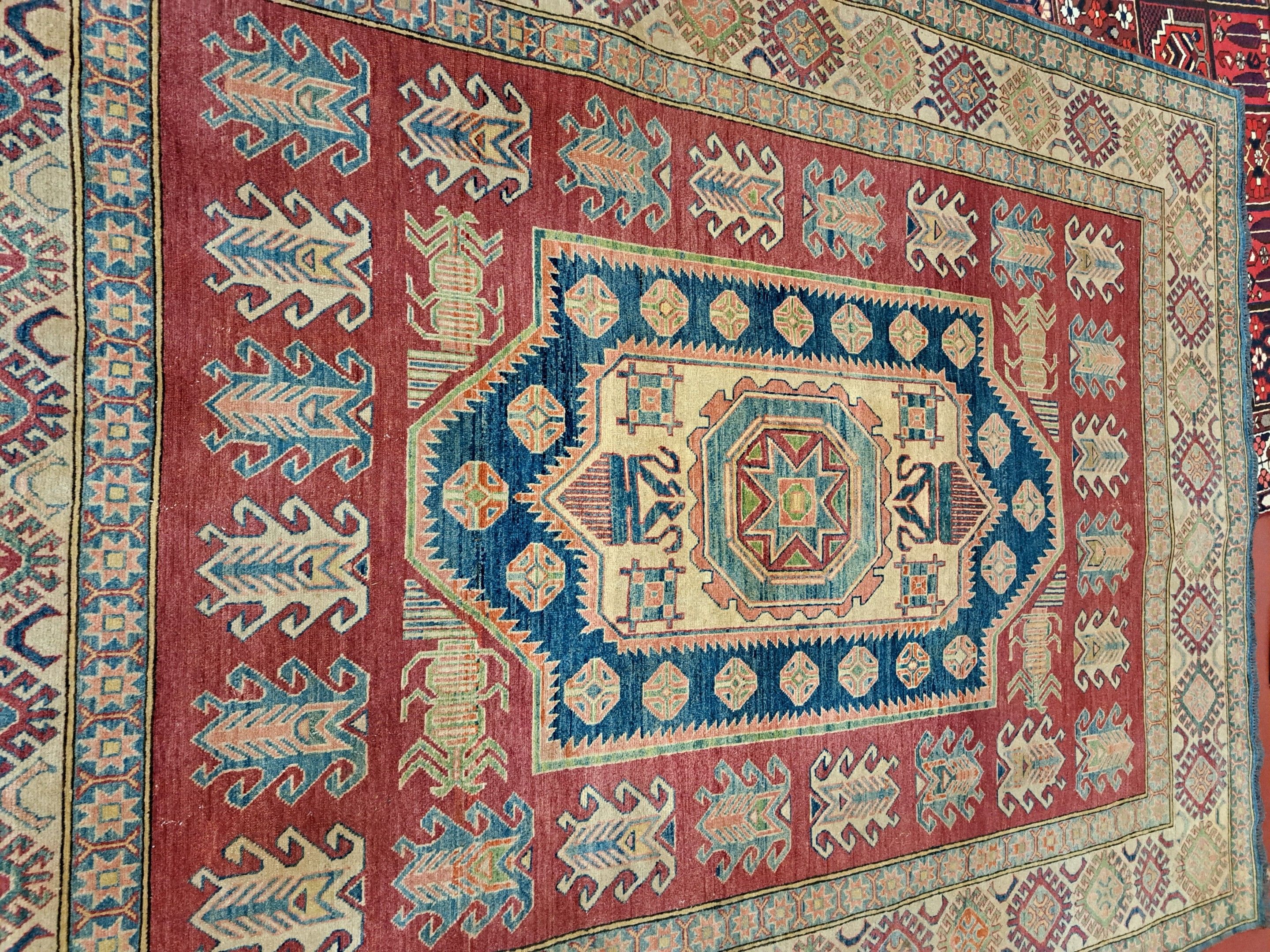 Caucasus Large red carpet decorated with geometric motifs.