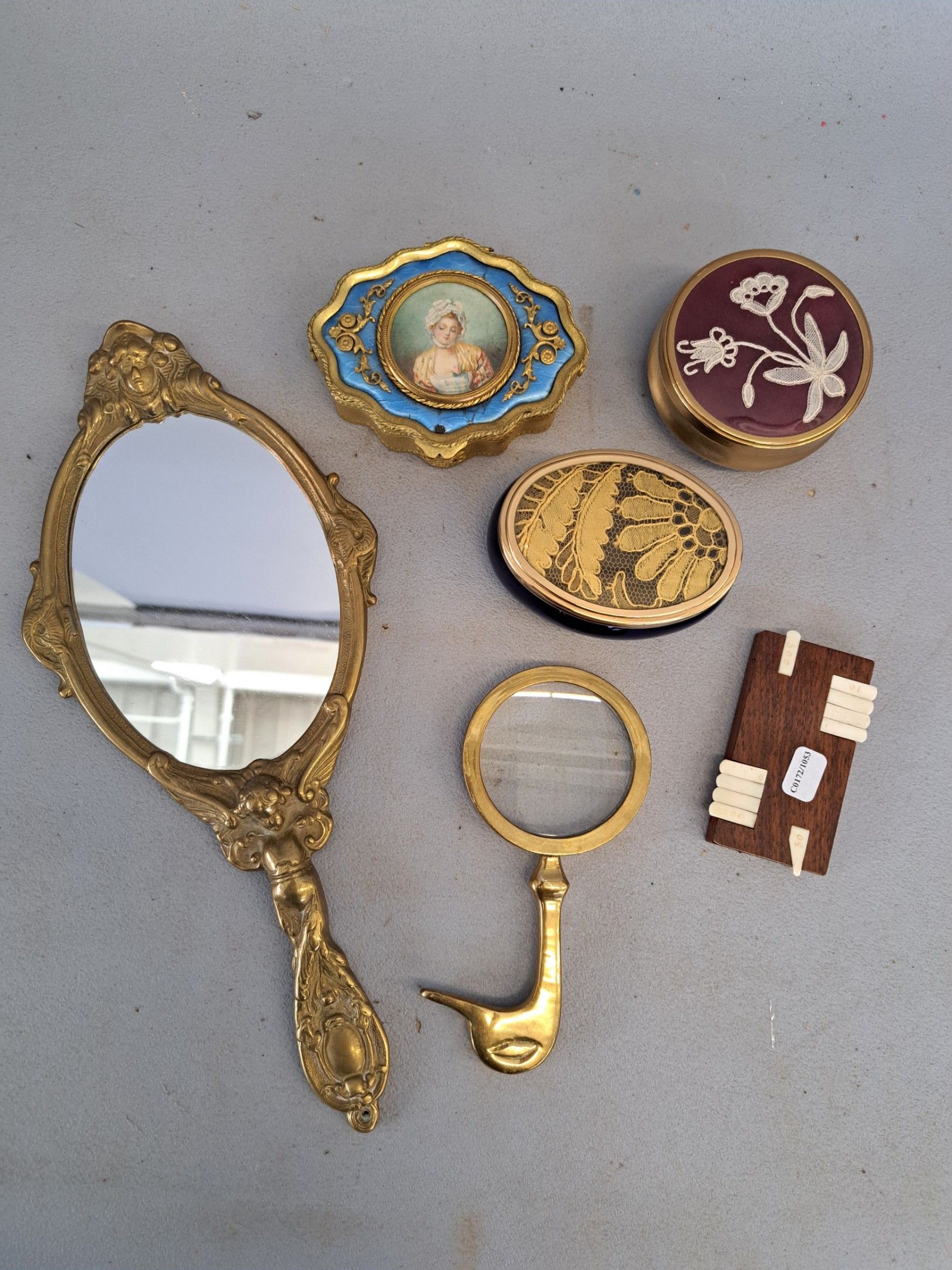Display cabinet items: gilded brass face with cherub decoration, three boxes with embroidery or miniature decoration, magnifying glass and magnifying glass stitch counter.