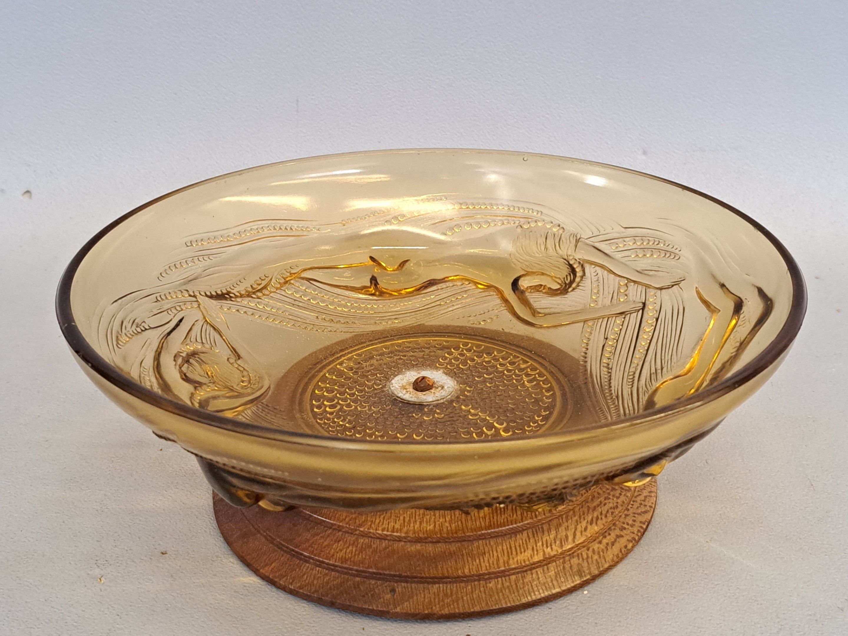 Yellow moulded glass bowl decorated with Naiads, pierced and mounted on a wooden base. Diameter: 25.3 cm (small bubbles and slight chips).