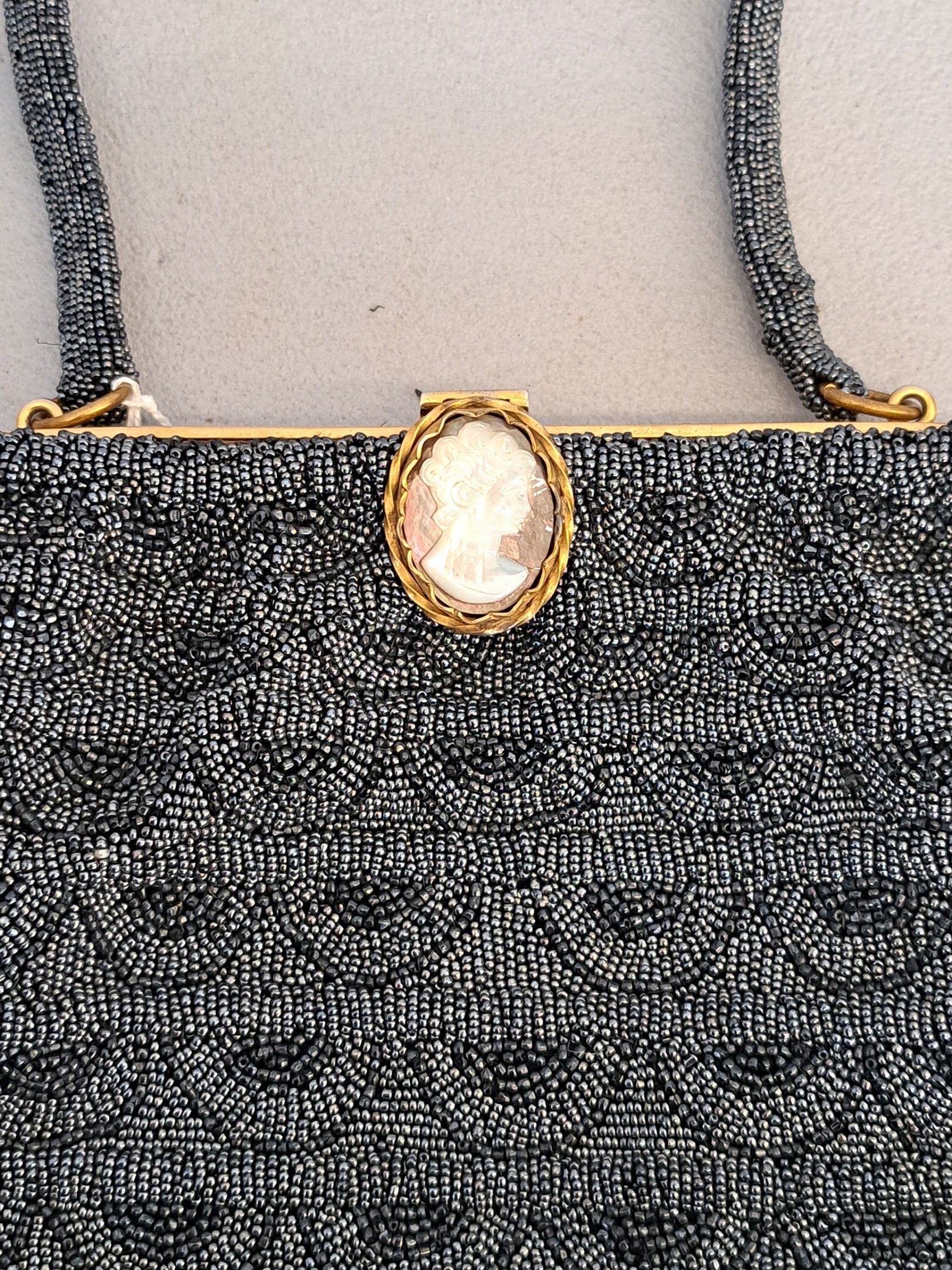 Small evening bag in grey and black pearls with a scale motif, the clasp adorned with a cameo.