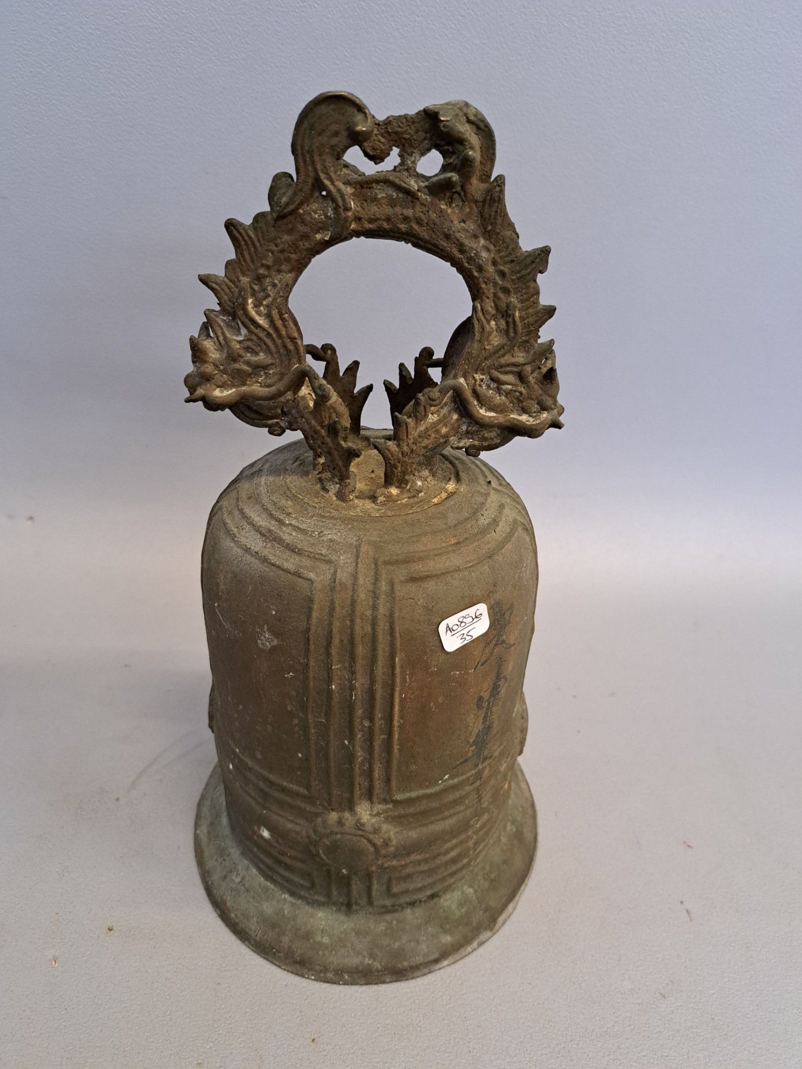 Bronze pagoda bell with geometric decoration and inscriptions, surmounted by two dragons (minor wear).
