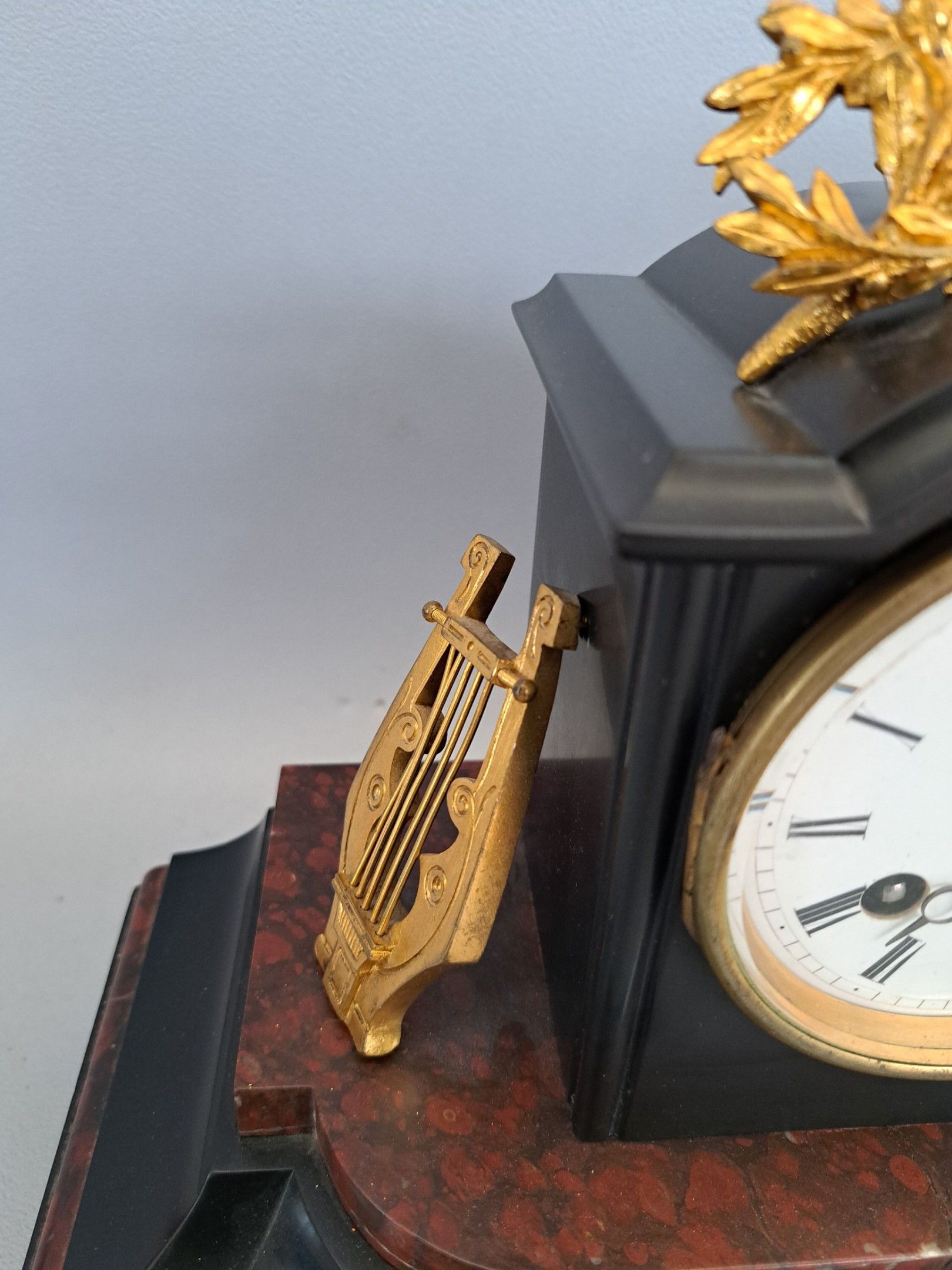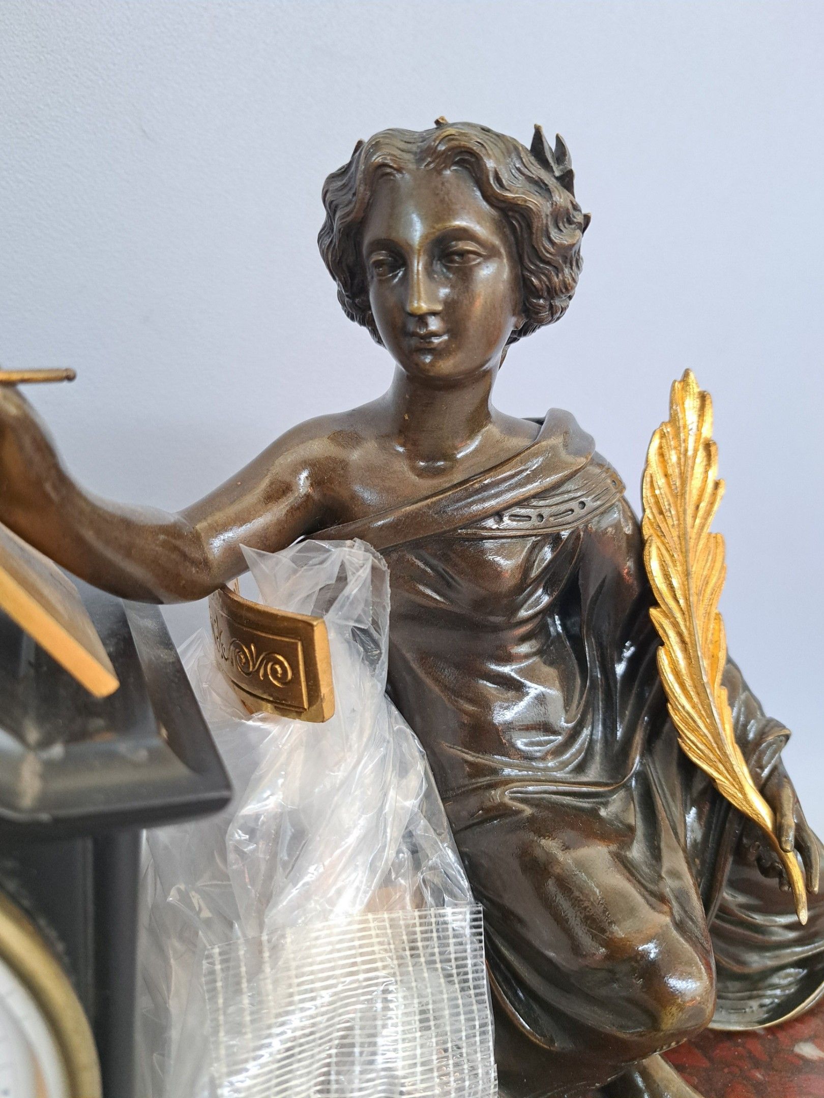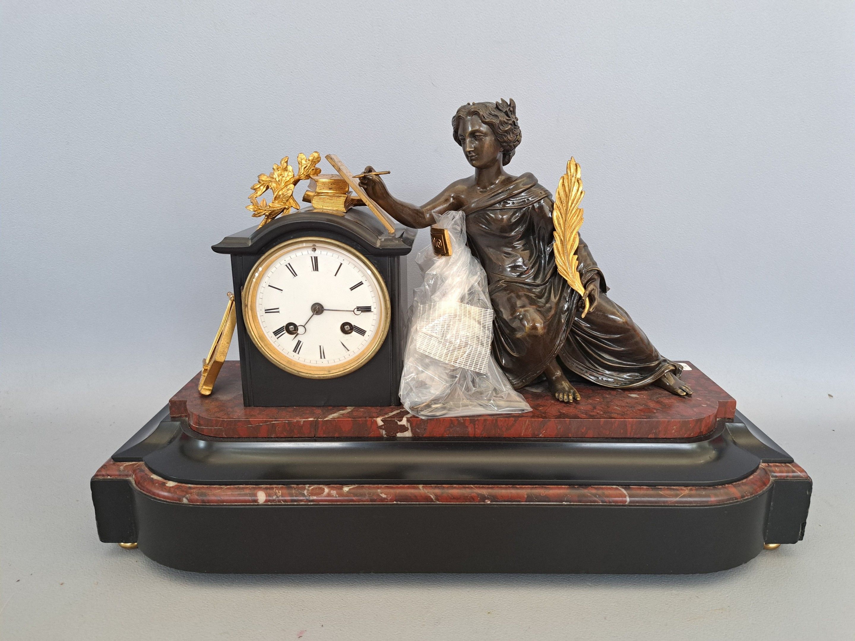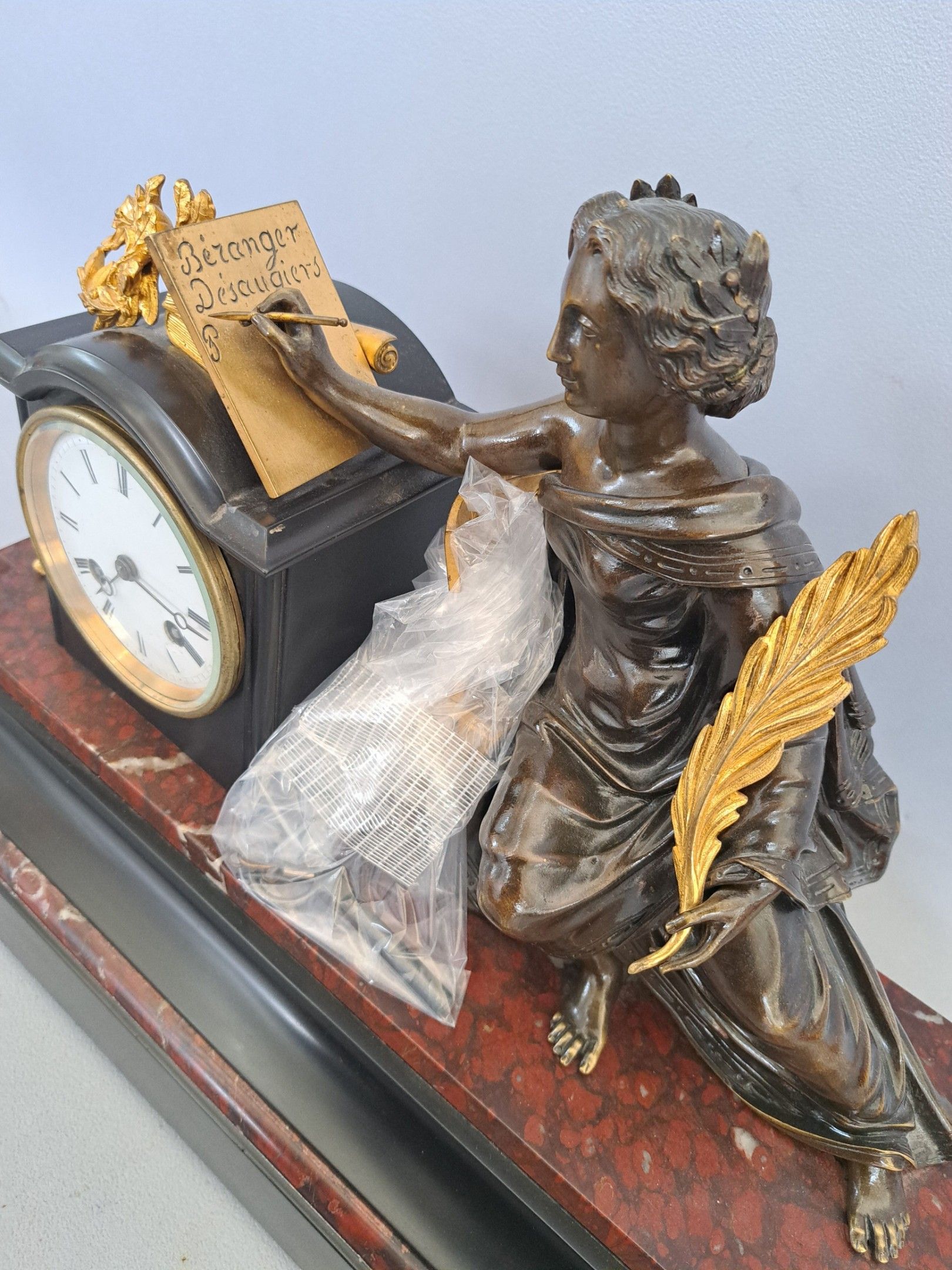 Clock with a black and red marble base decorated with a subject in bronze with a gold and brown patina, writing a list in pen Béranger, Désaugiers, dial with white enamelled background, Bréguet type hands. Late 19th century (marble crack and one accident).