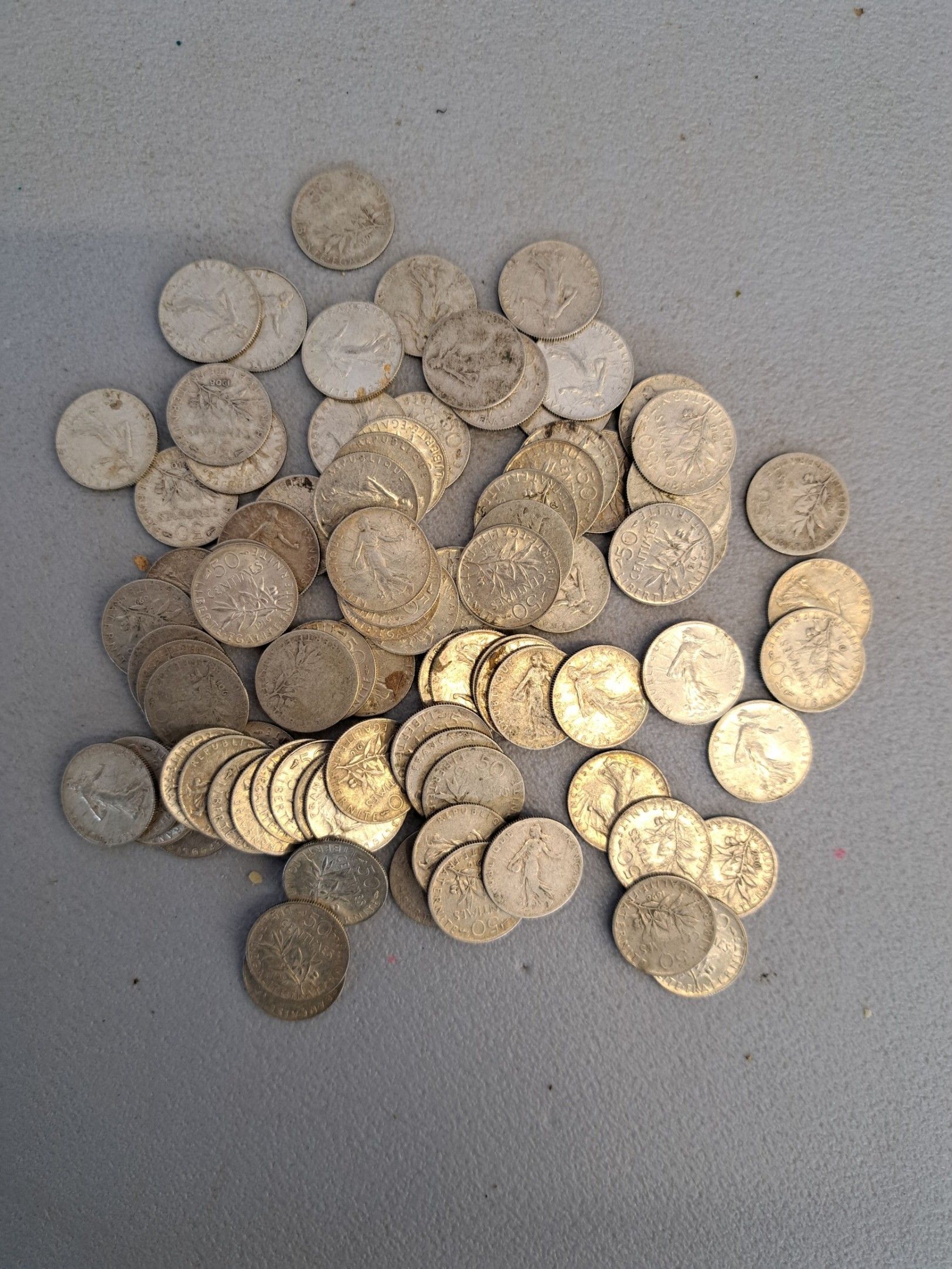 Approximately 90 silver 50 centime coins. Wear and tear.