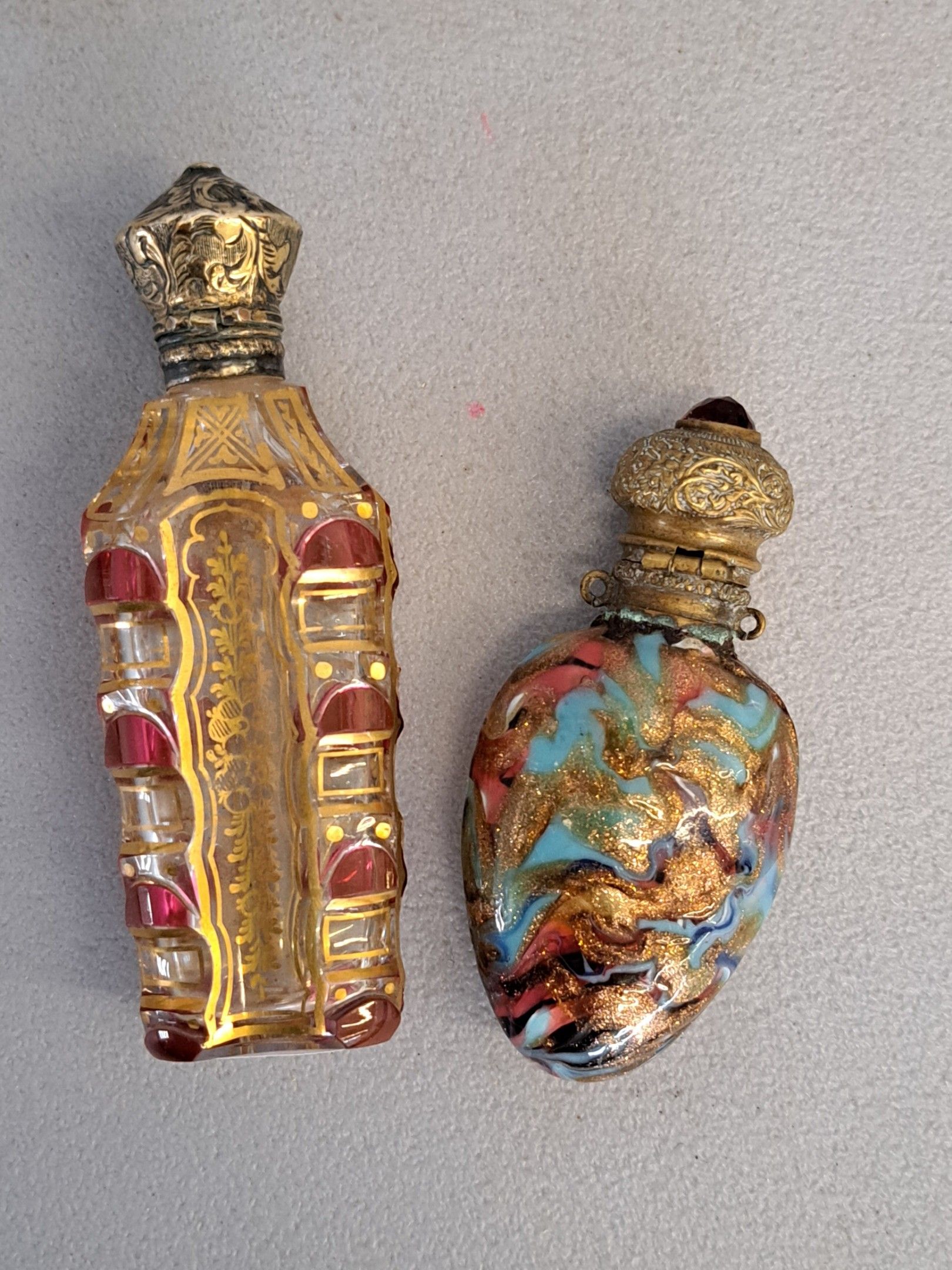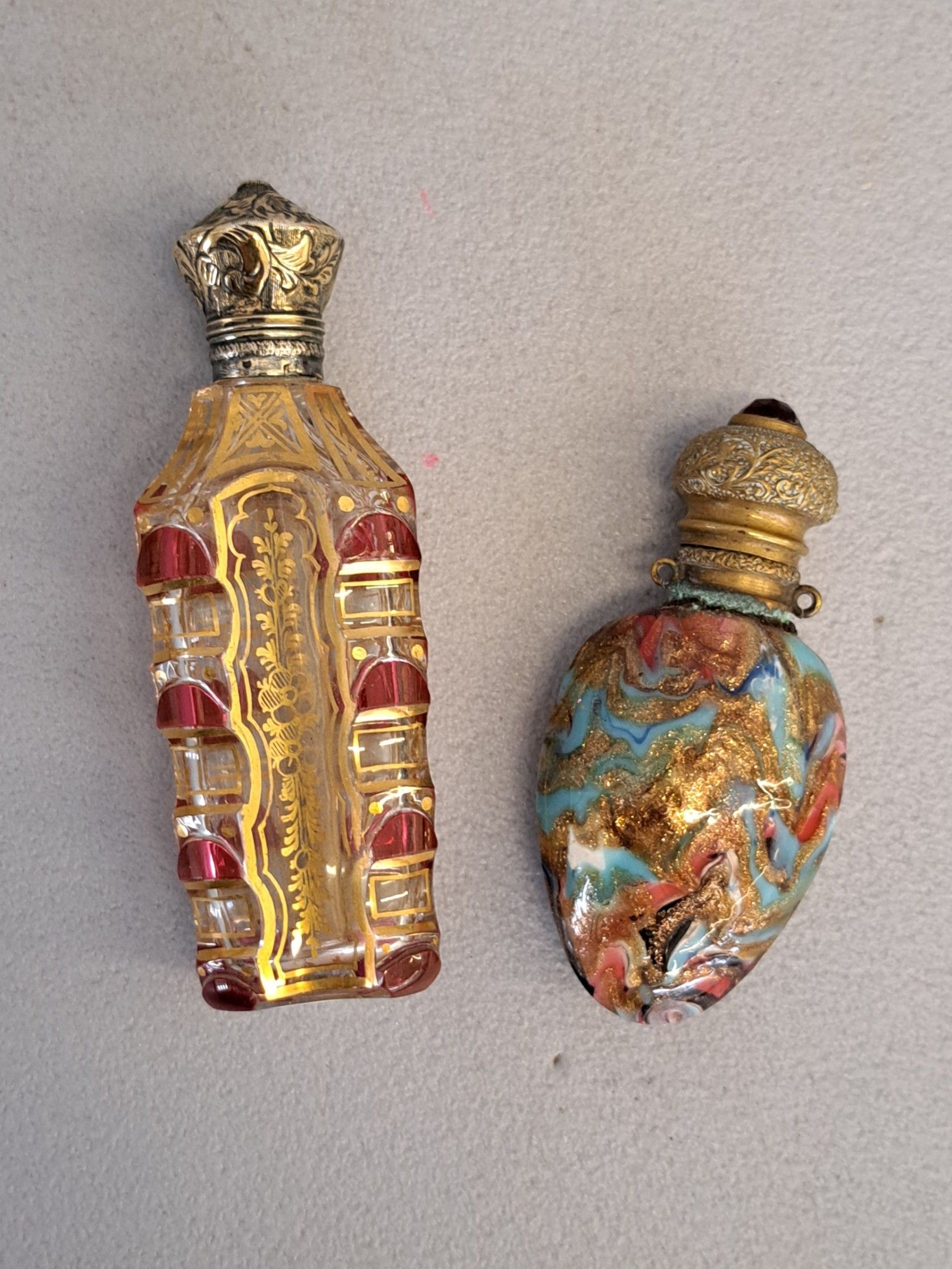 Two perfume bottles, one in crystal with gold and rose decoration, mounted in silver 800/1000 (gross weight: 69.58 g.), the second in multicoloured glass with gold flakes.