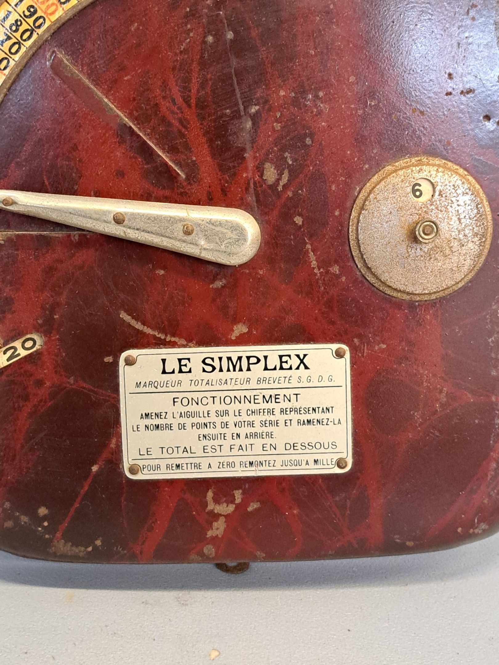 Simplex, wall-mounted sheet metal billiard counter with three needles. (Oxidations). 56 x 27 cm.