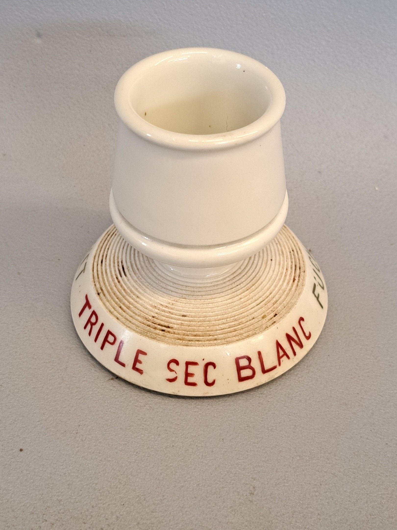 Porcelain pyrogen with red lettering on a white background for Fuchet triple sec blanc, crême de Cacao.