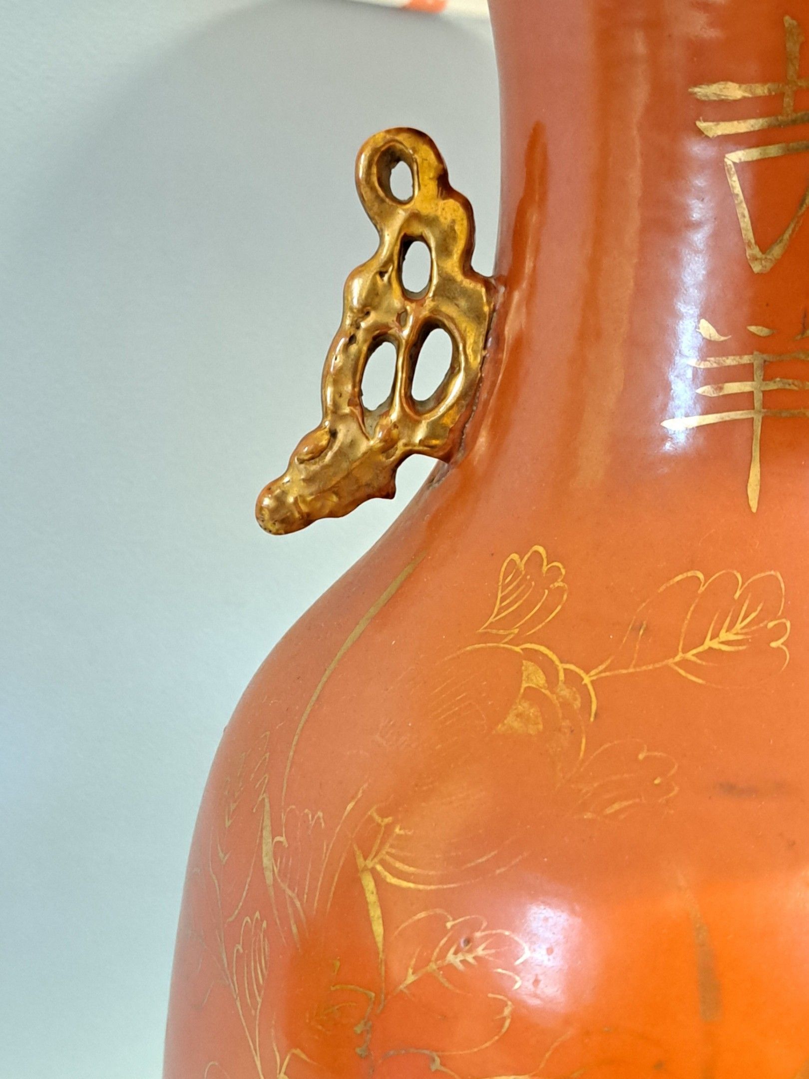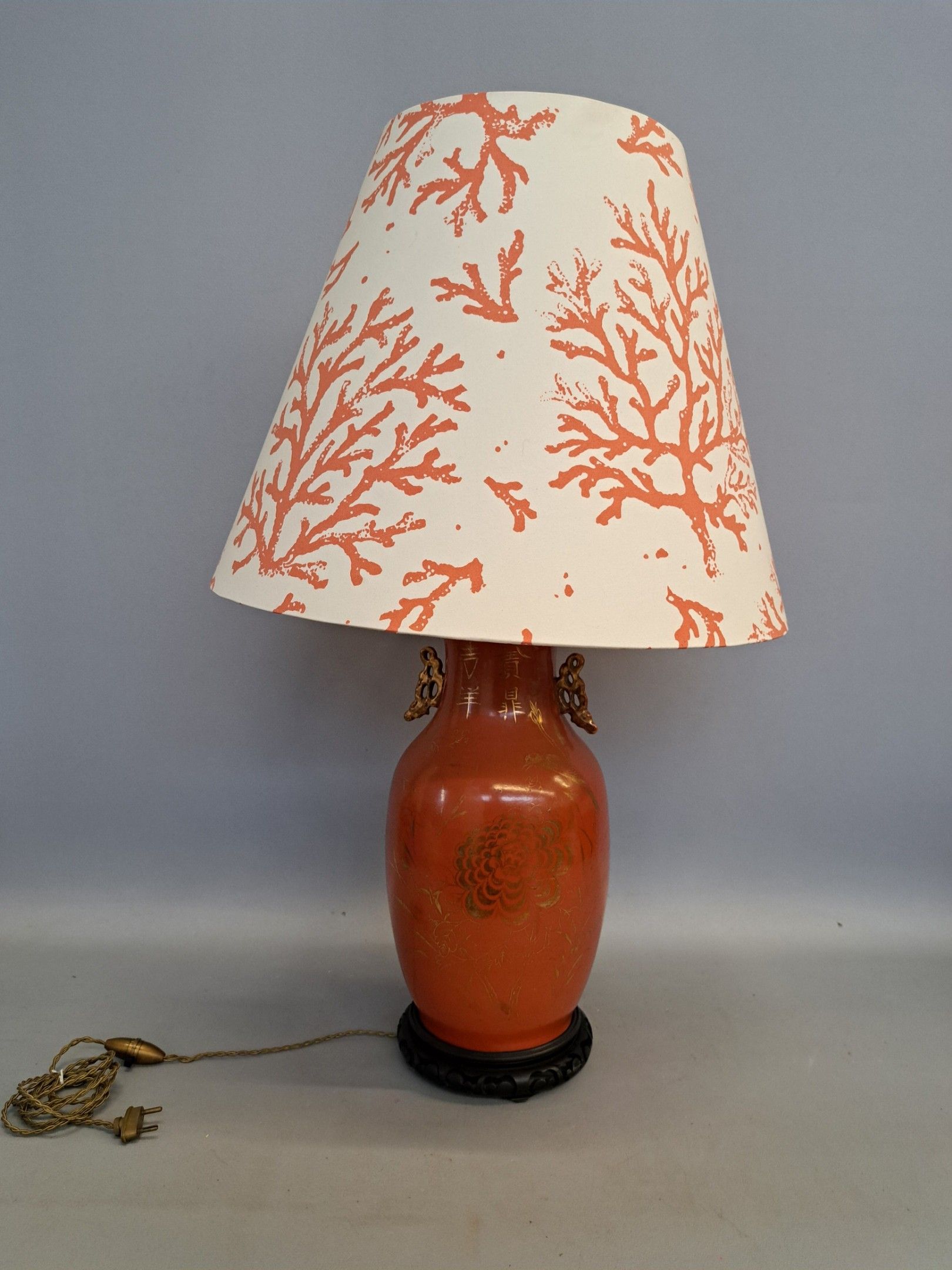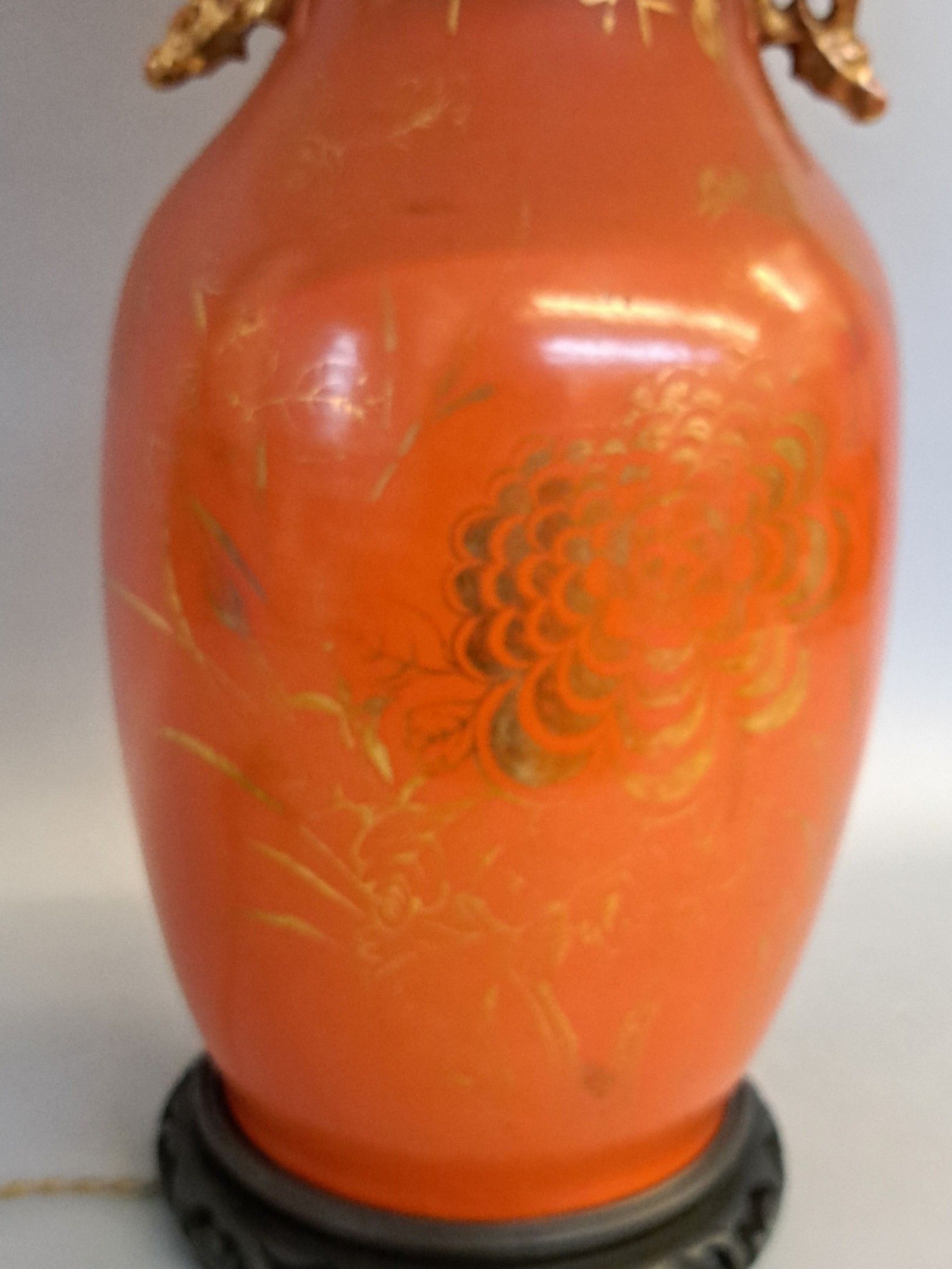 Large coral-red porcelain lamp base vase with gilt decoration of flowers, on a blackened wooden base.