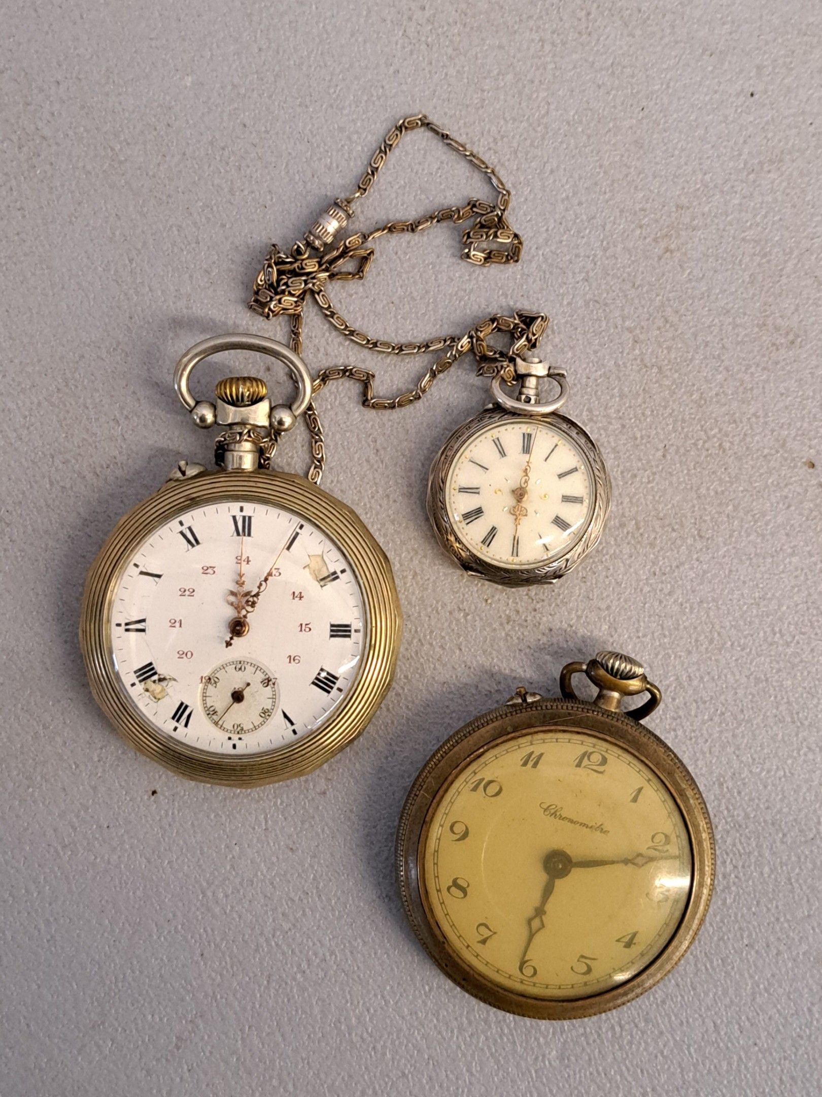 Two metal pocket watches and a silver collar watch with chain (gross weight: 20g).