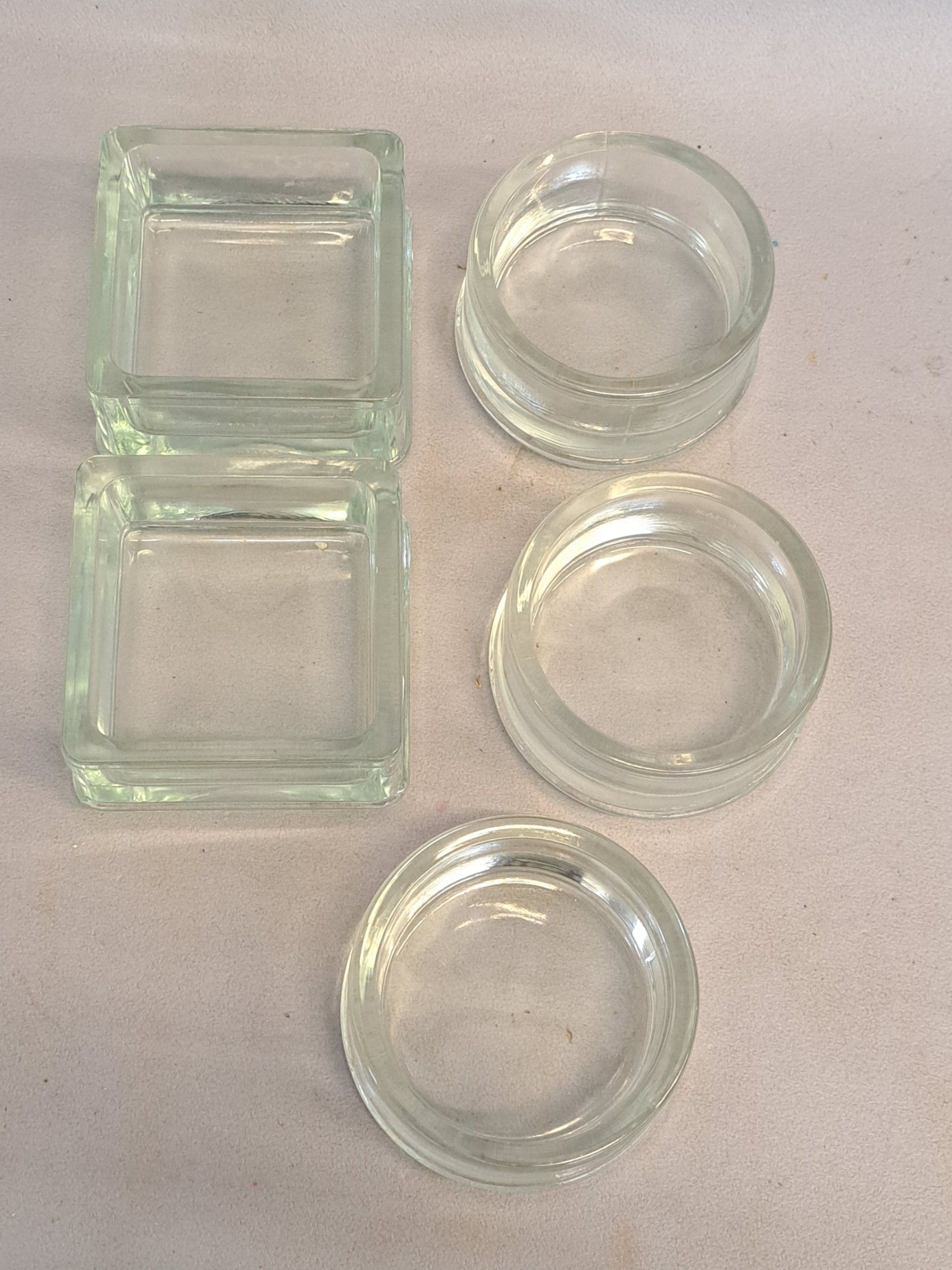 Lumax, five glass storage trays: two square and three circular. Max. height 6 cm.