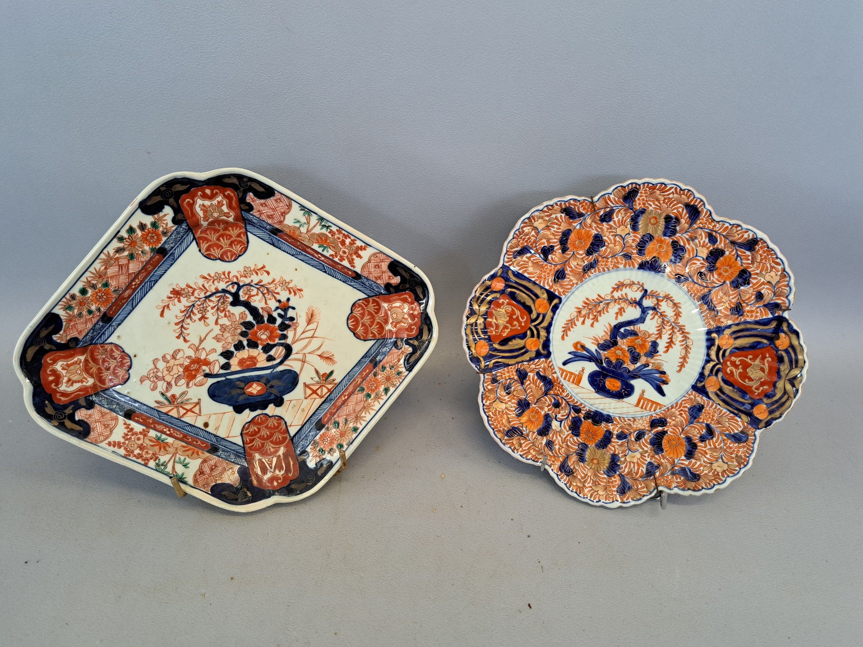 IMARI, two decorative porcelain dishes, bonsai decoration, one diamond-shaped, the other poly-lobed, L. max. 33 cm.