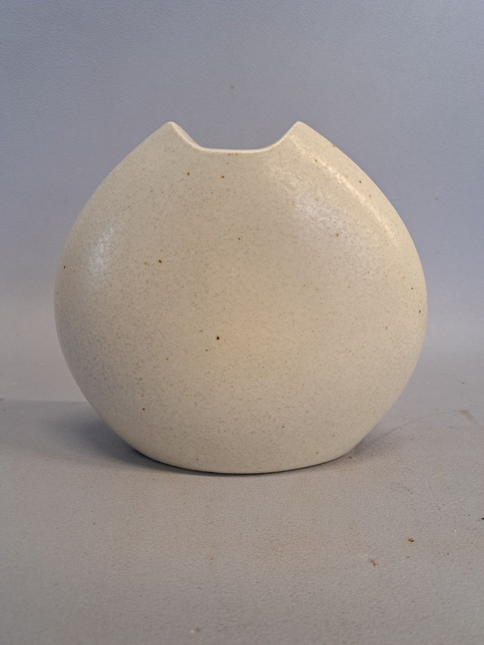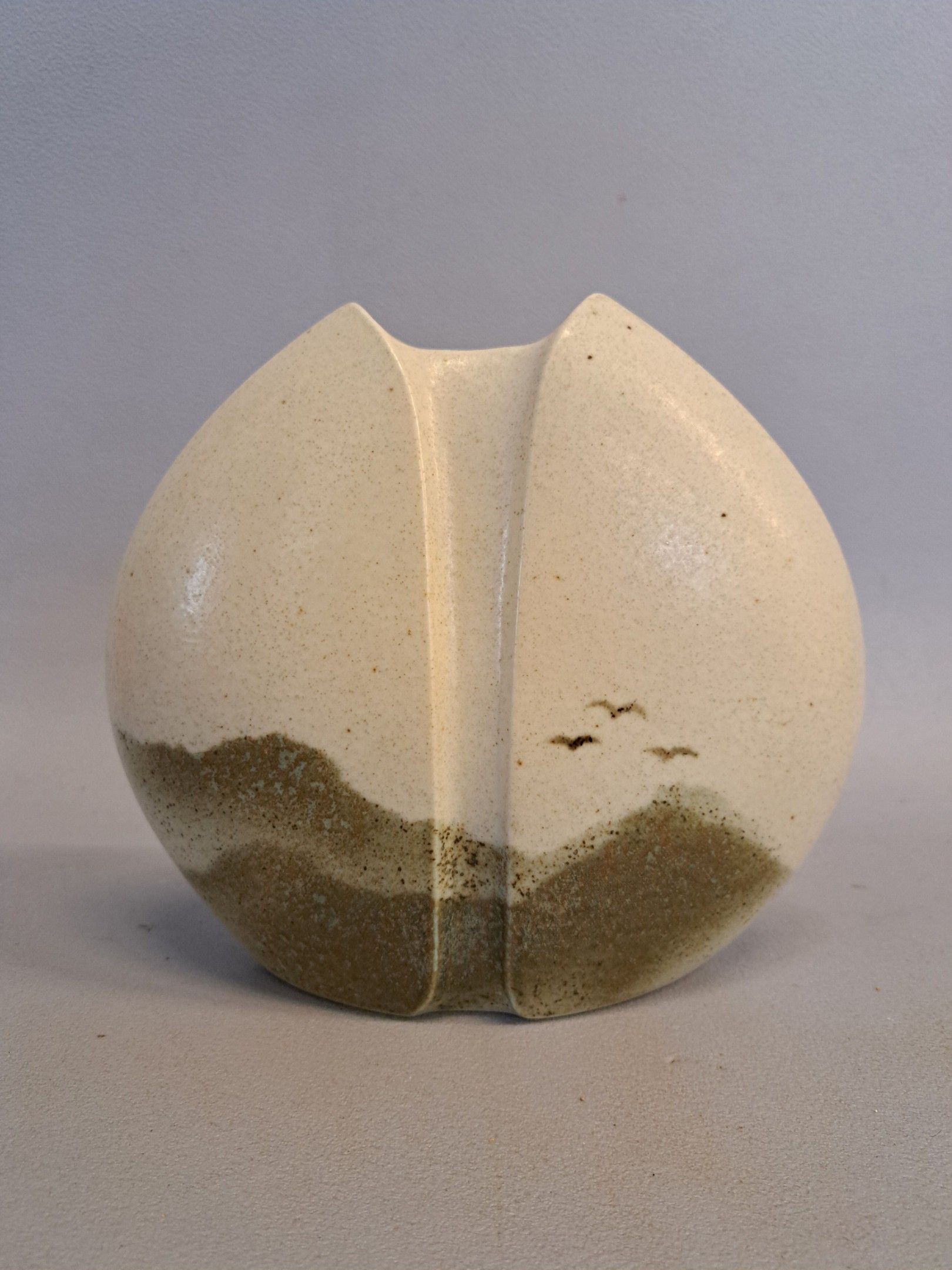 Circular porcelain vase with flattened body decorated with a landscape with birds.