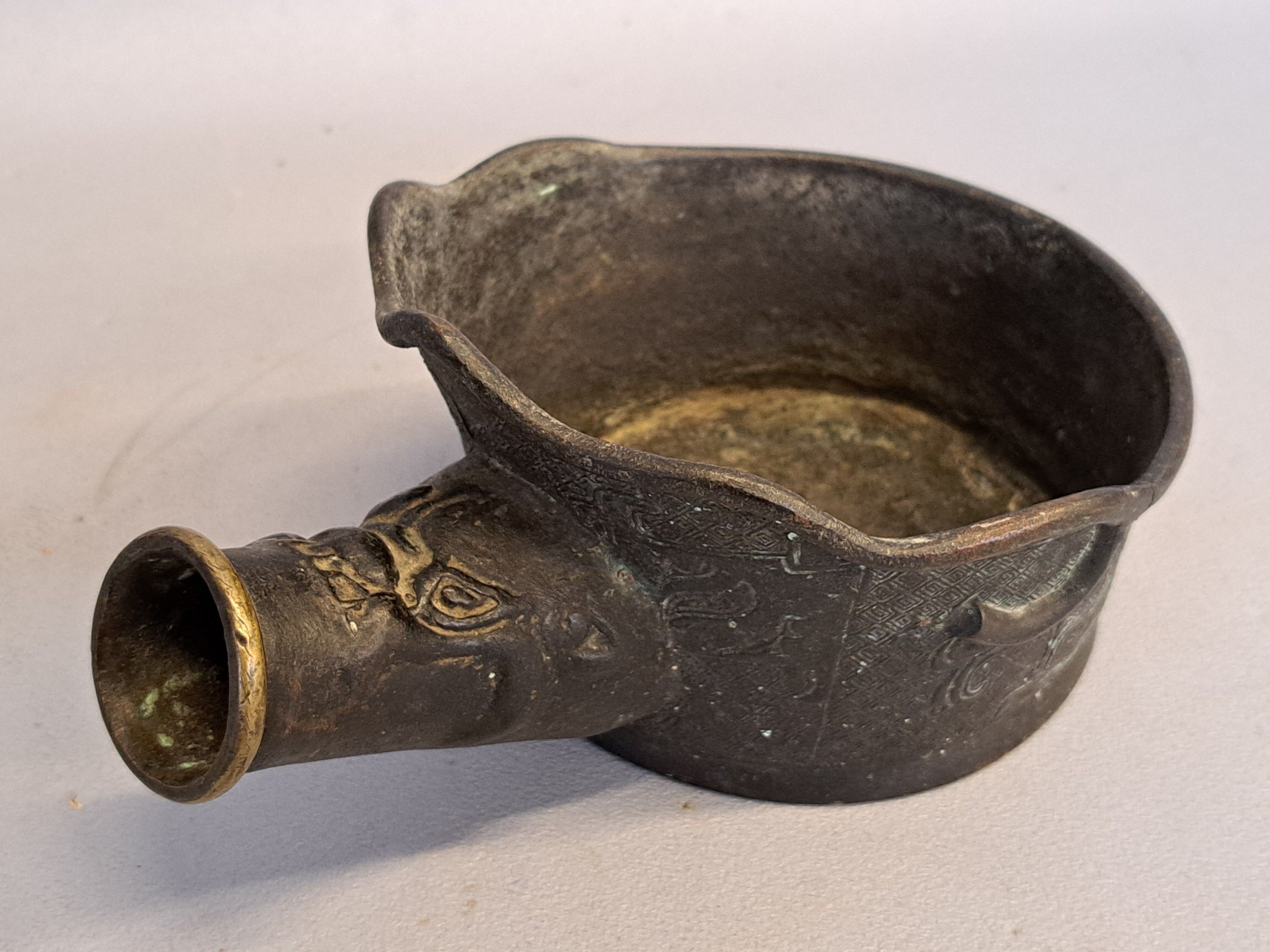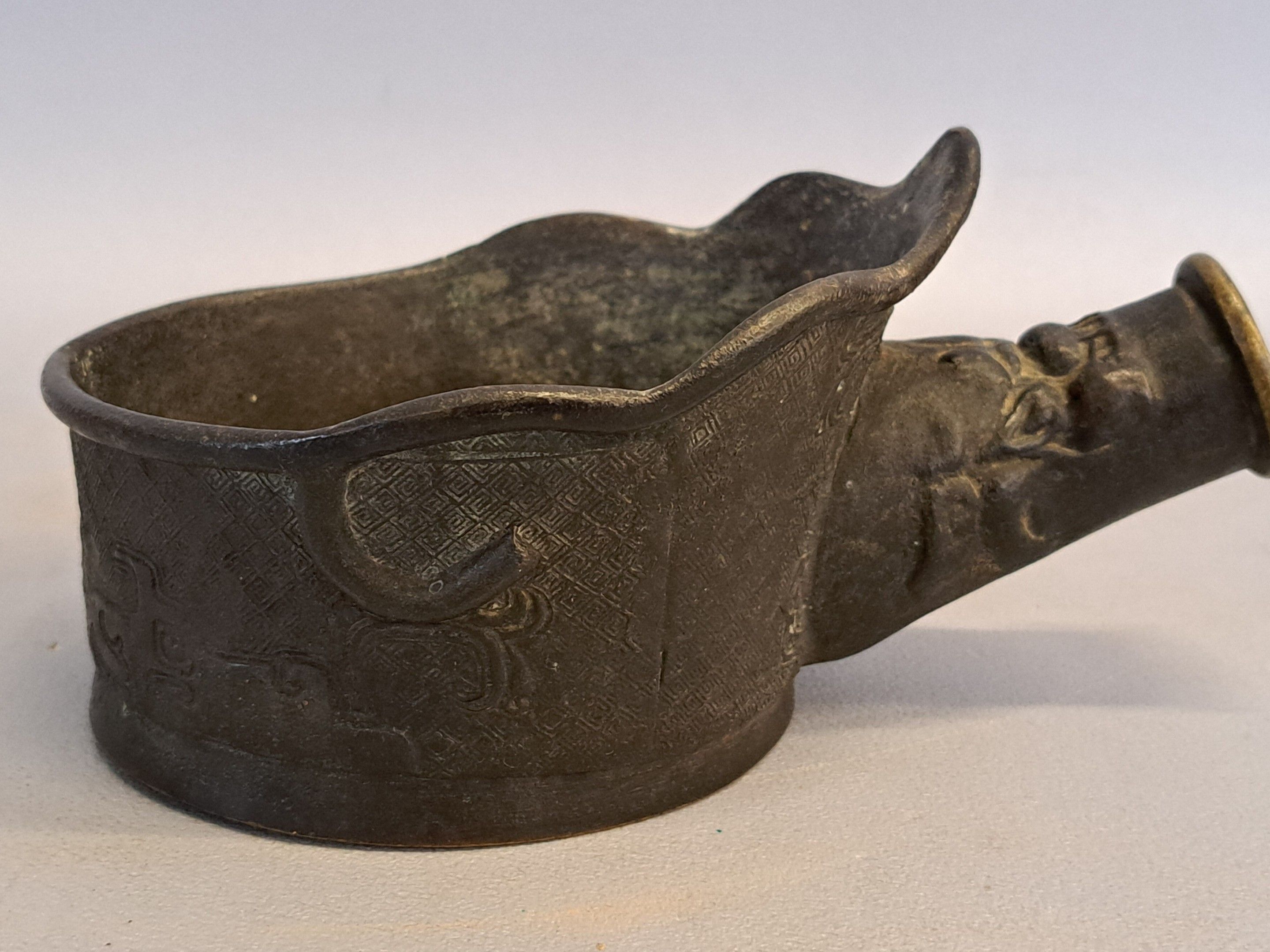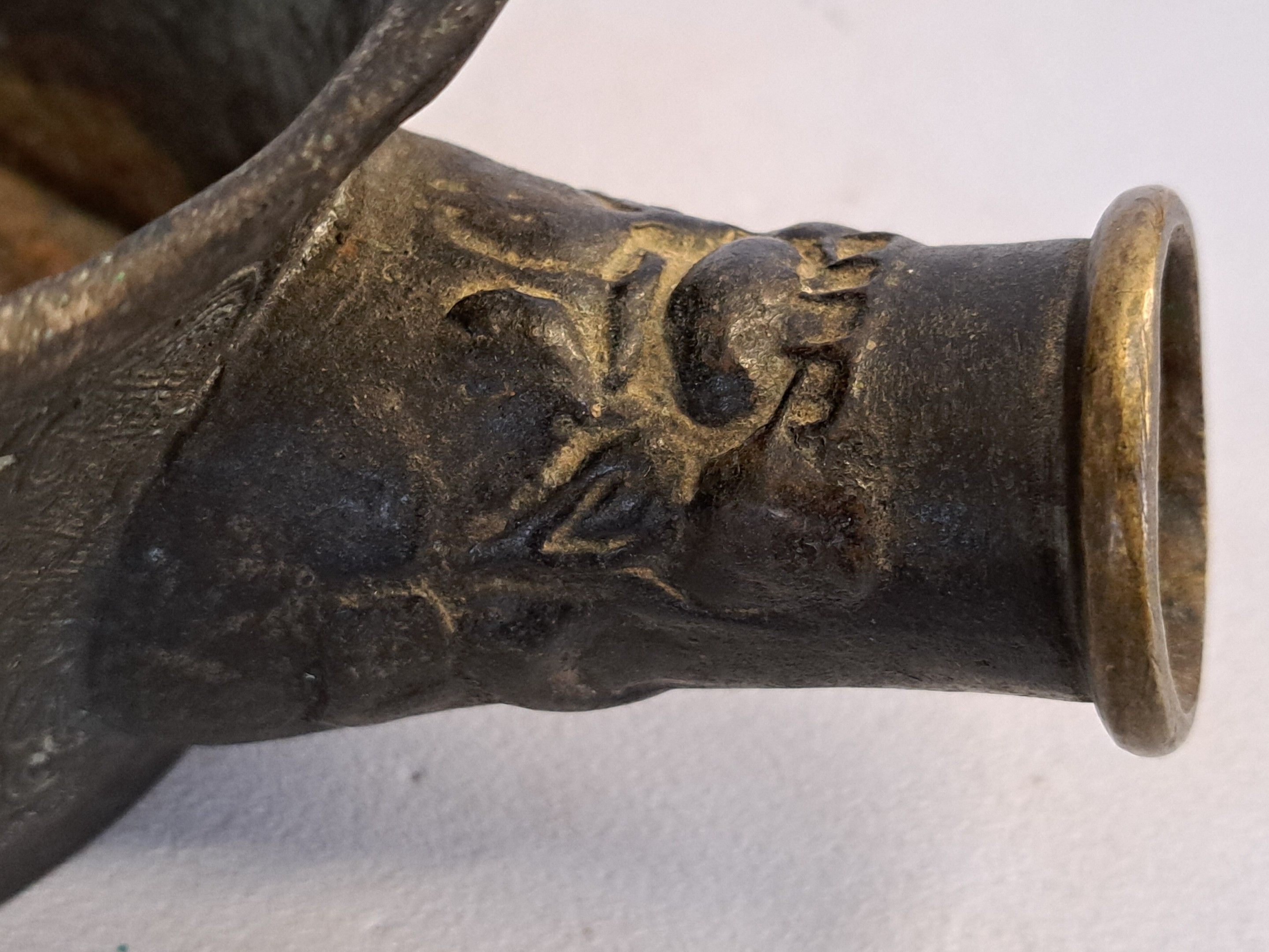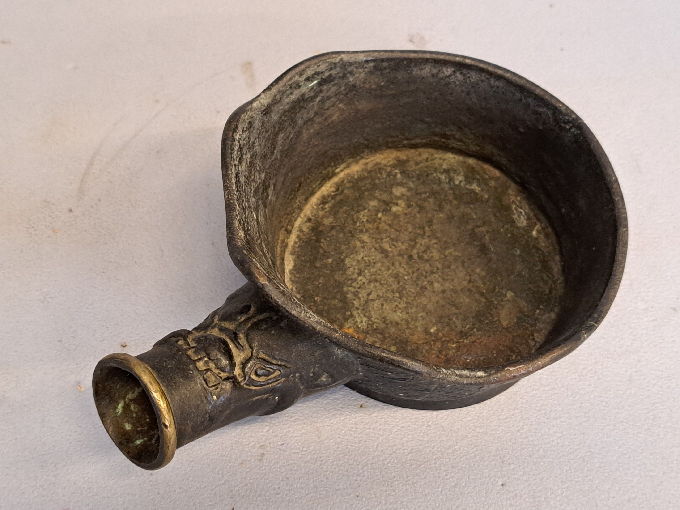 Indochina ? Bronze iron decorated with geometric motifs. The handle is missing.