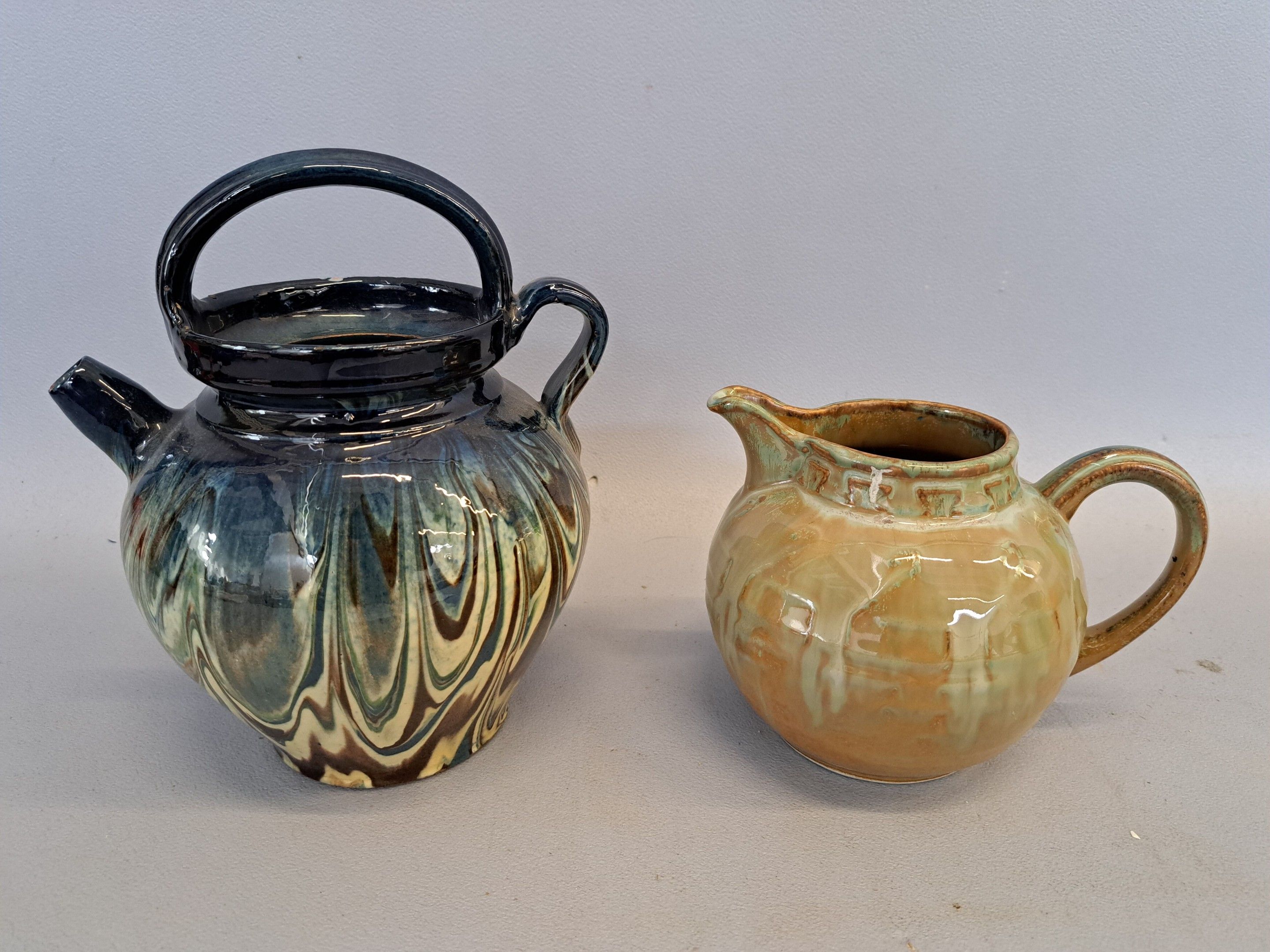 Chevrette and an au pot in stoneware with drips. Maximum height 23 cm. Damage.