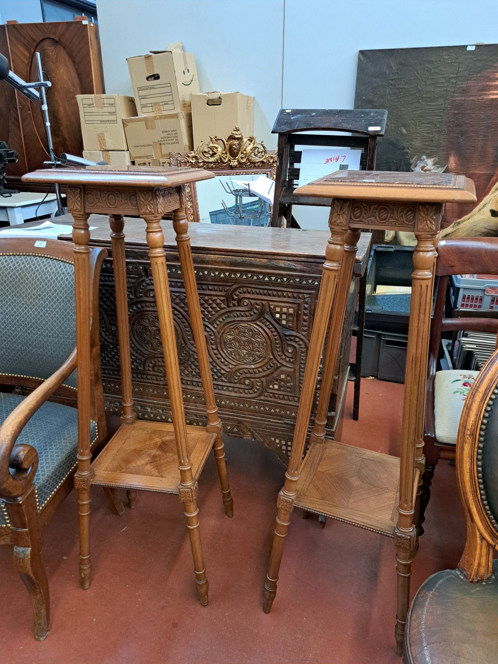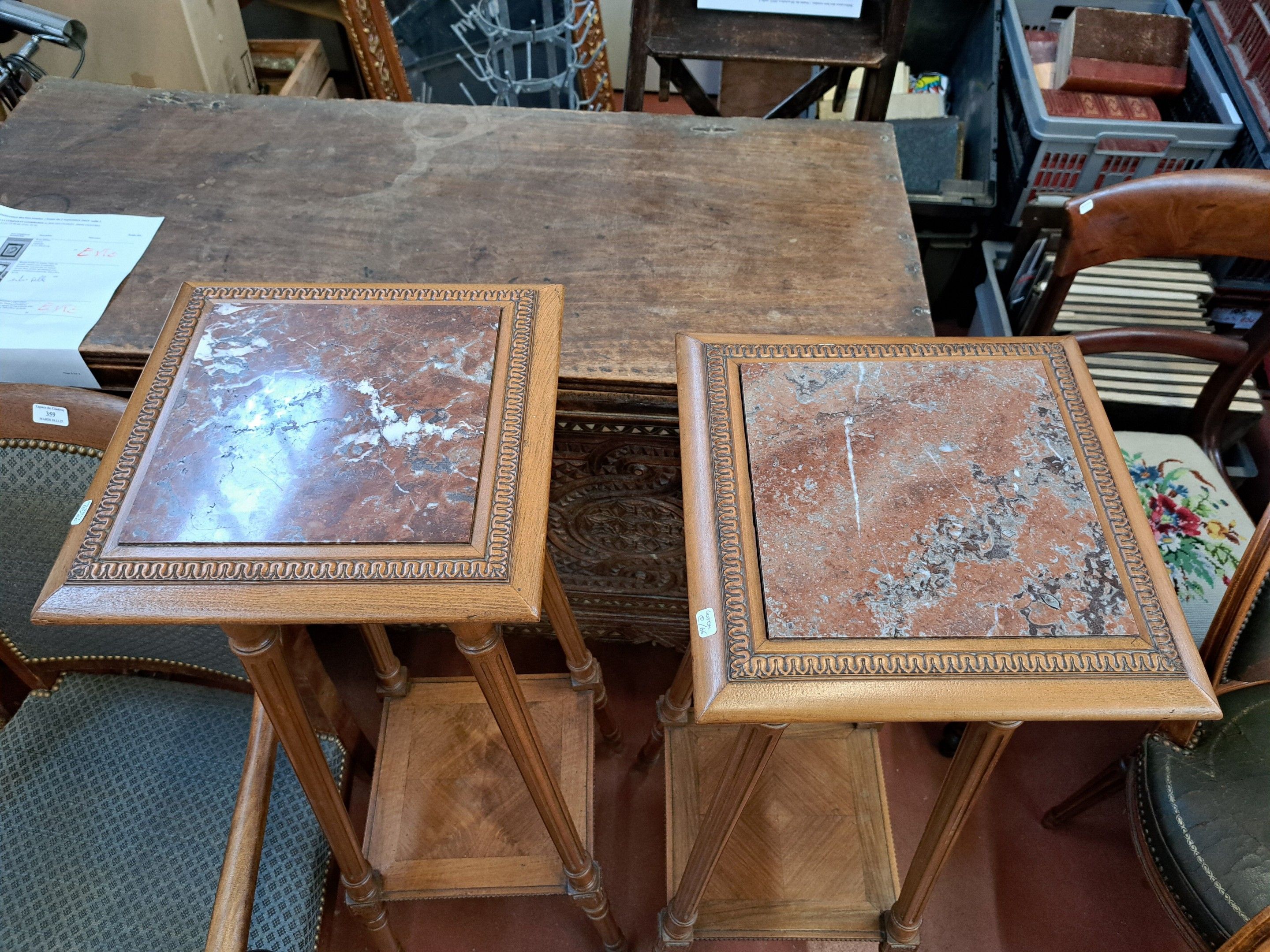 Pair of beech and walnut veneered saddles, moulded and carved. Top set with red marble. Circa 1900.