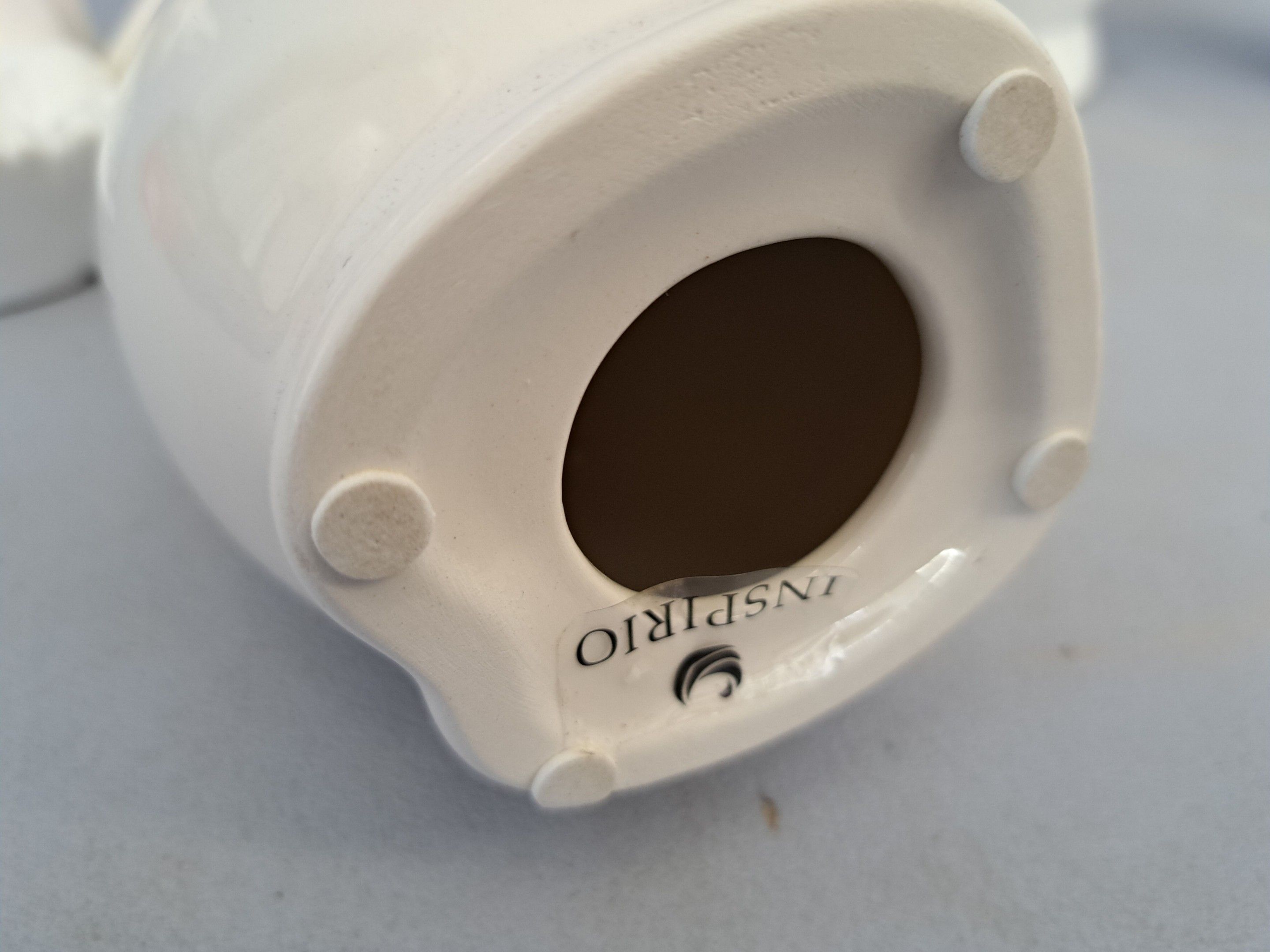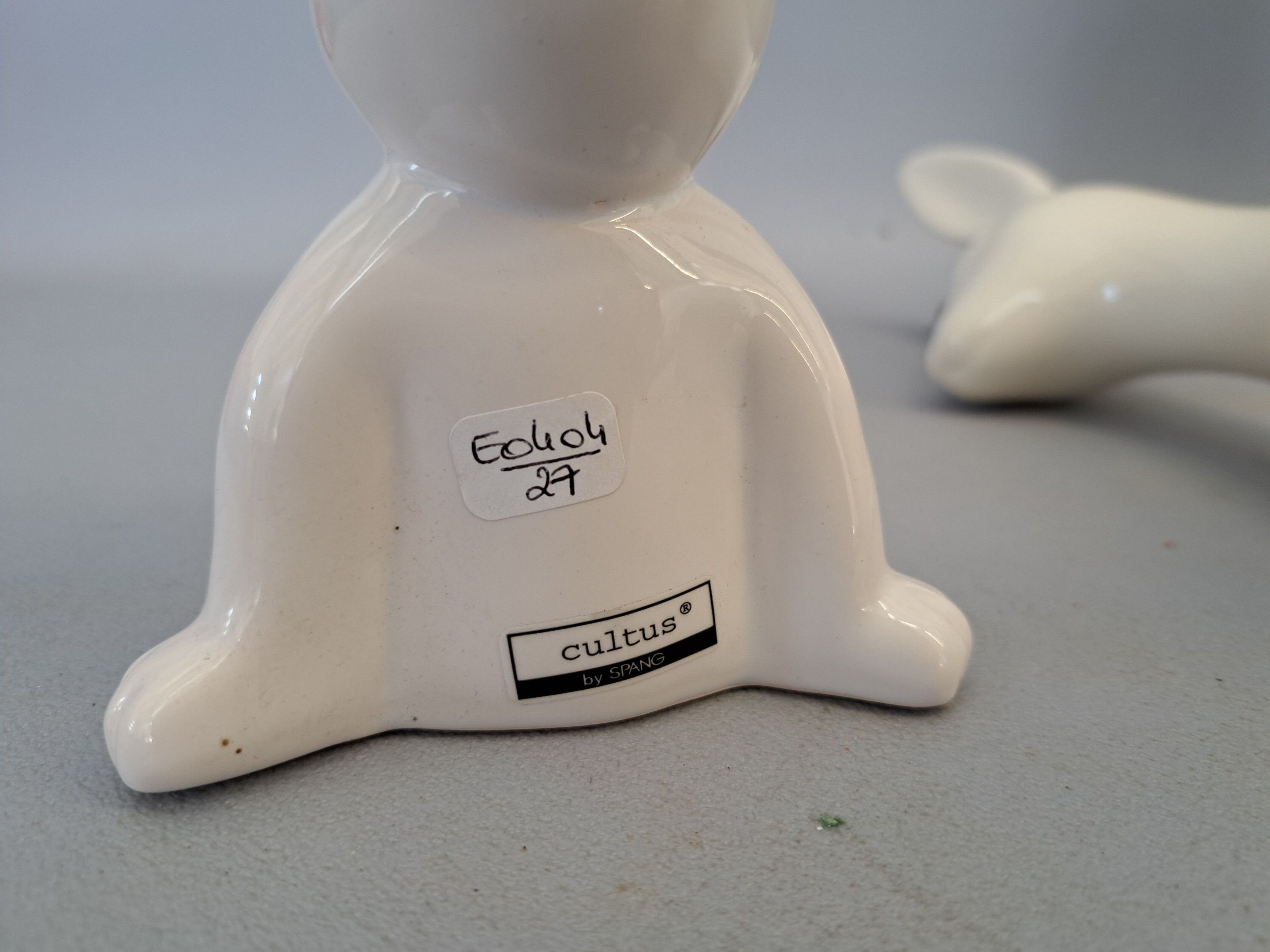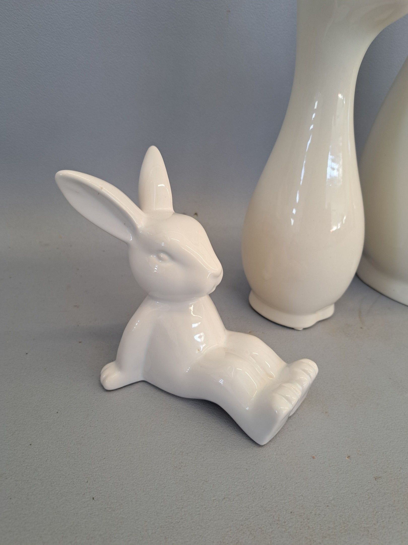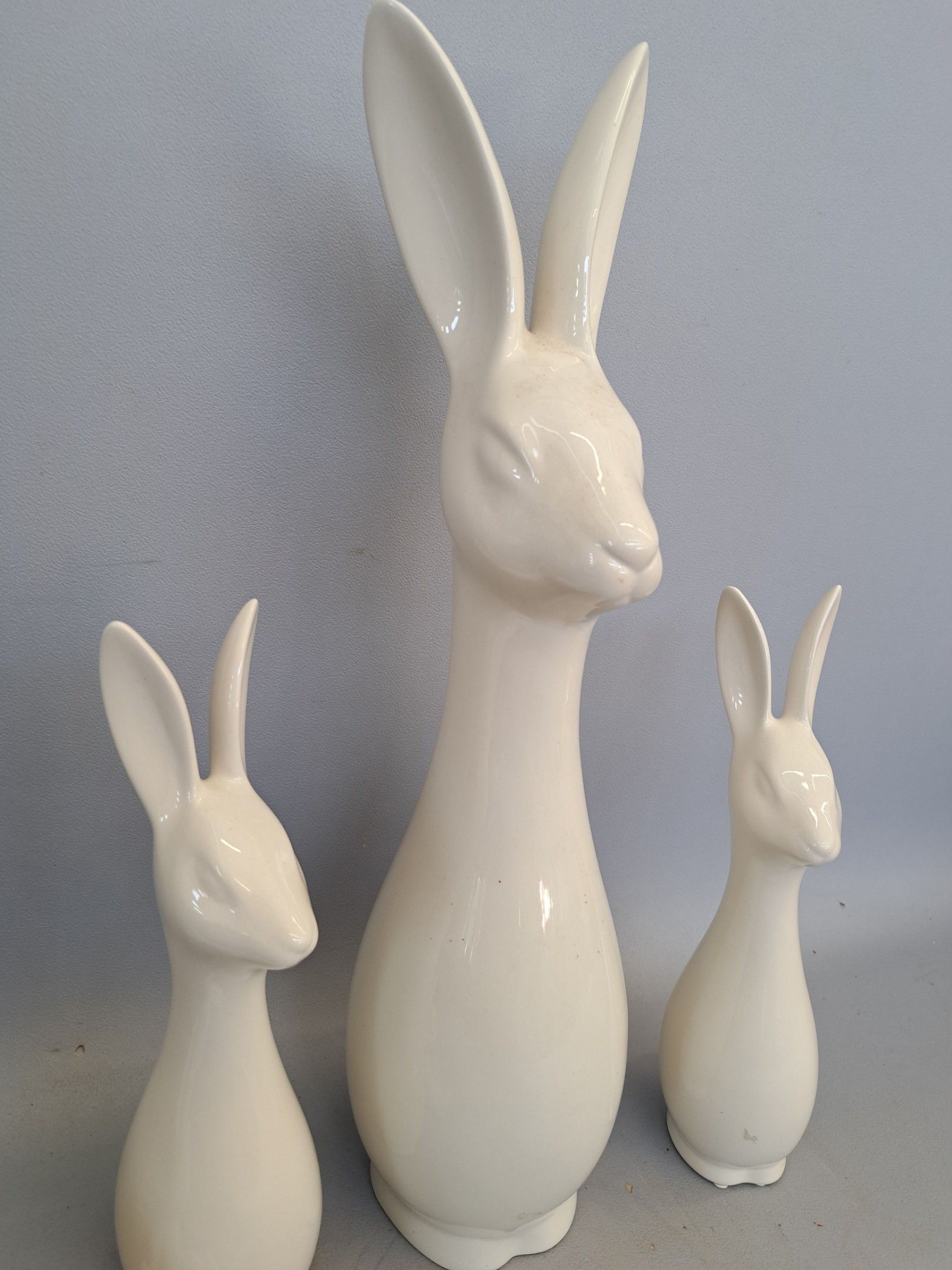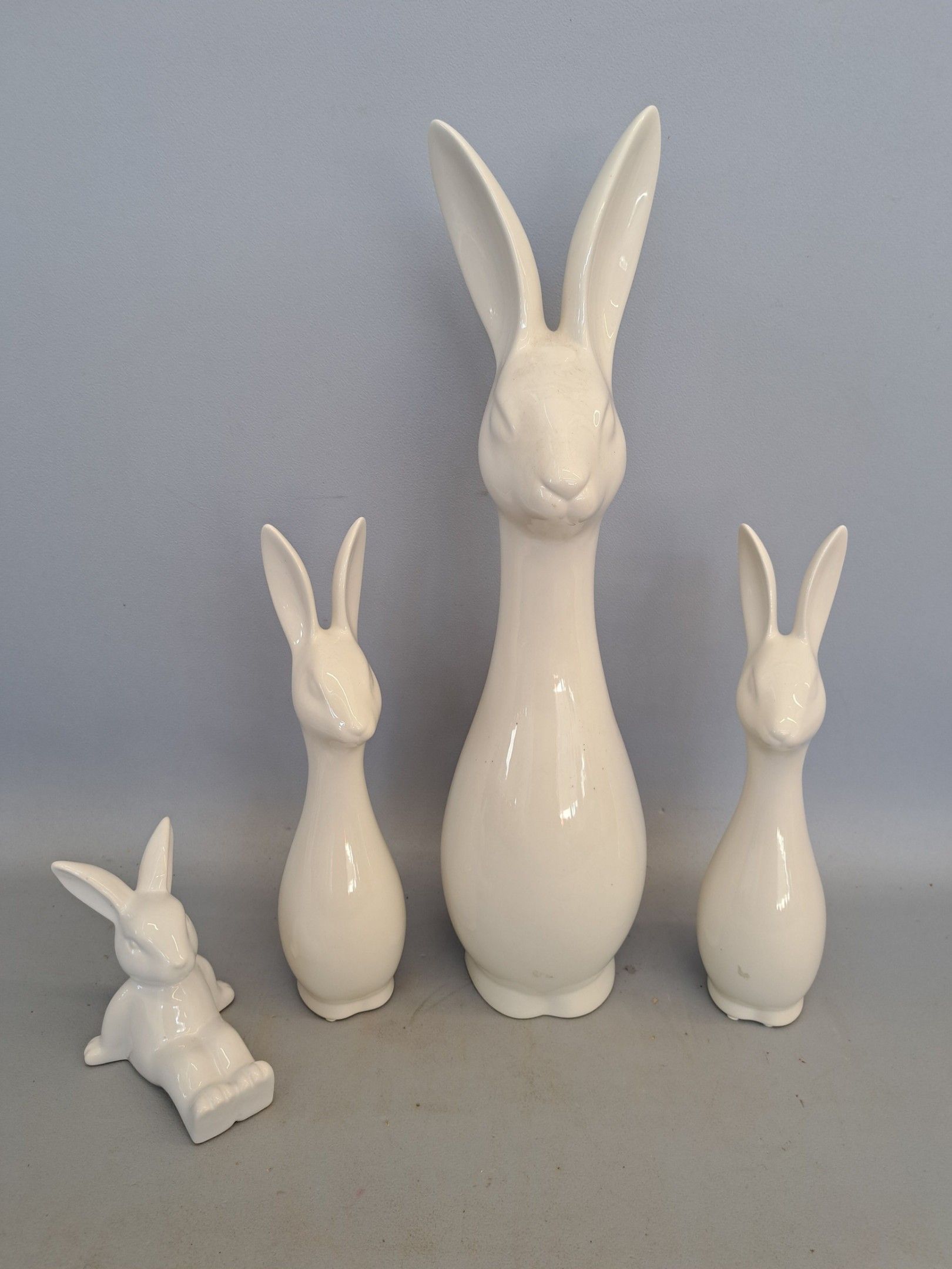 Three earthenware rabbits including a pair of small ones (chipped ear). Inspirio label. A small sitting rabbit is included.