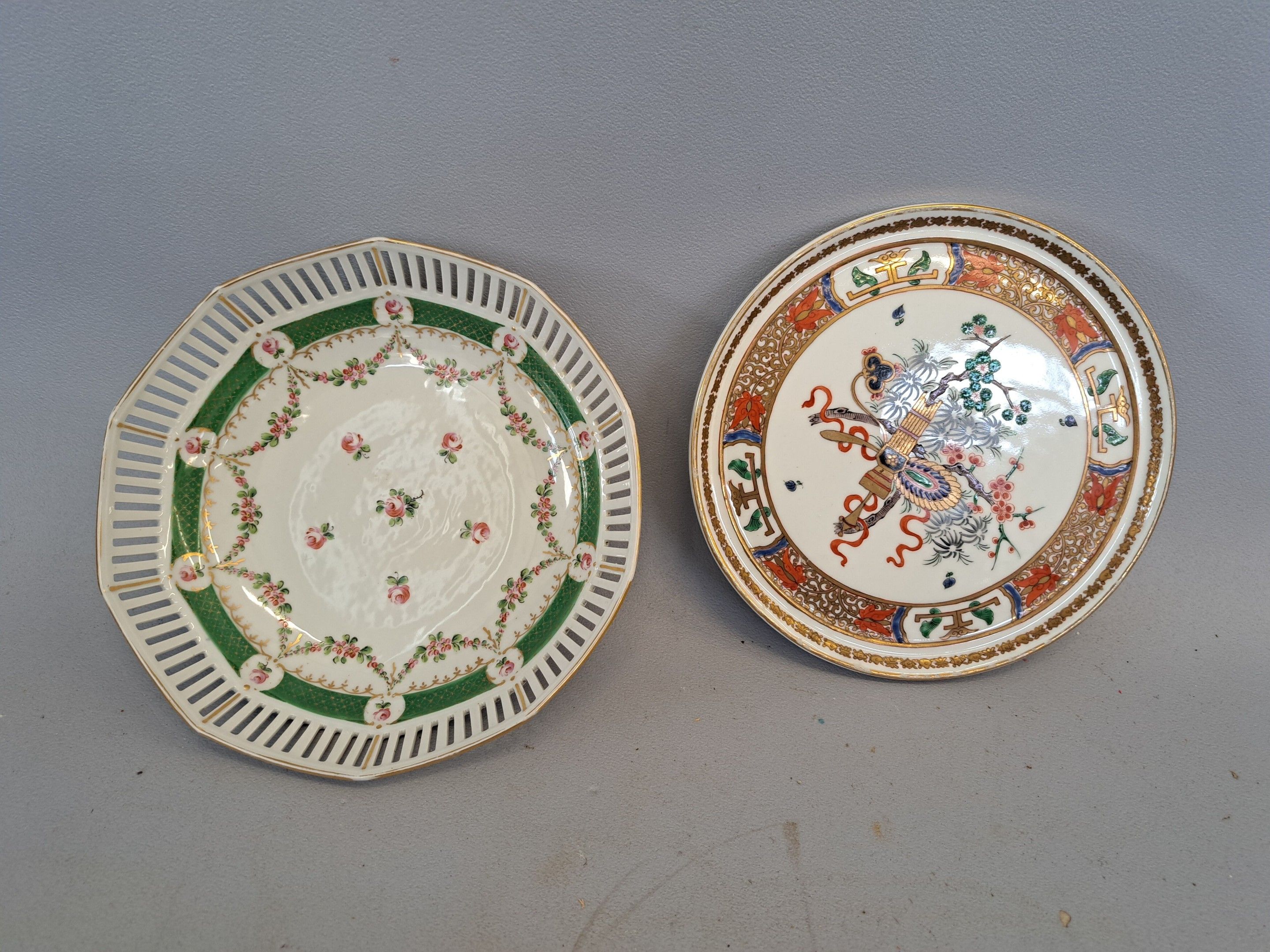 A white openwork porcelain bowl with painted garlands of ros…