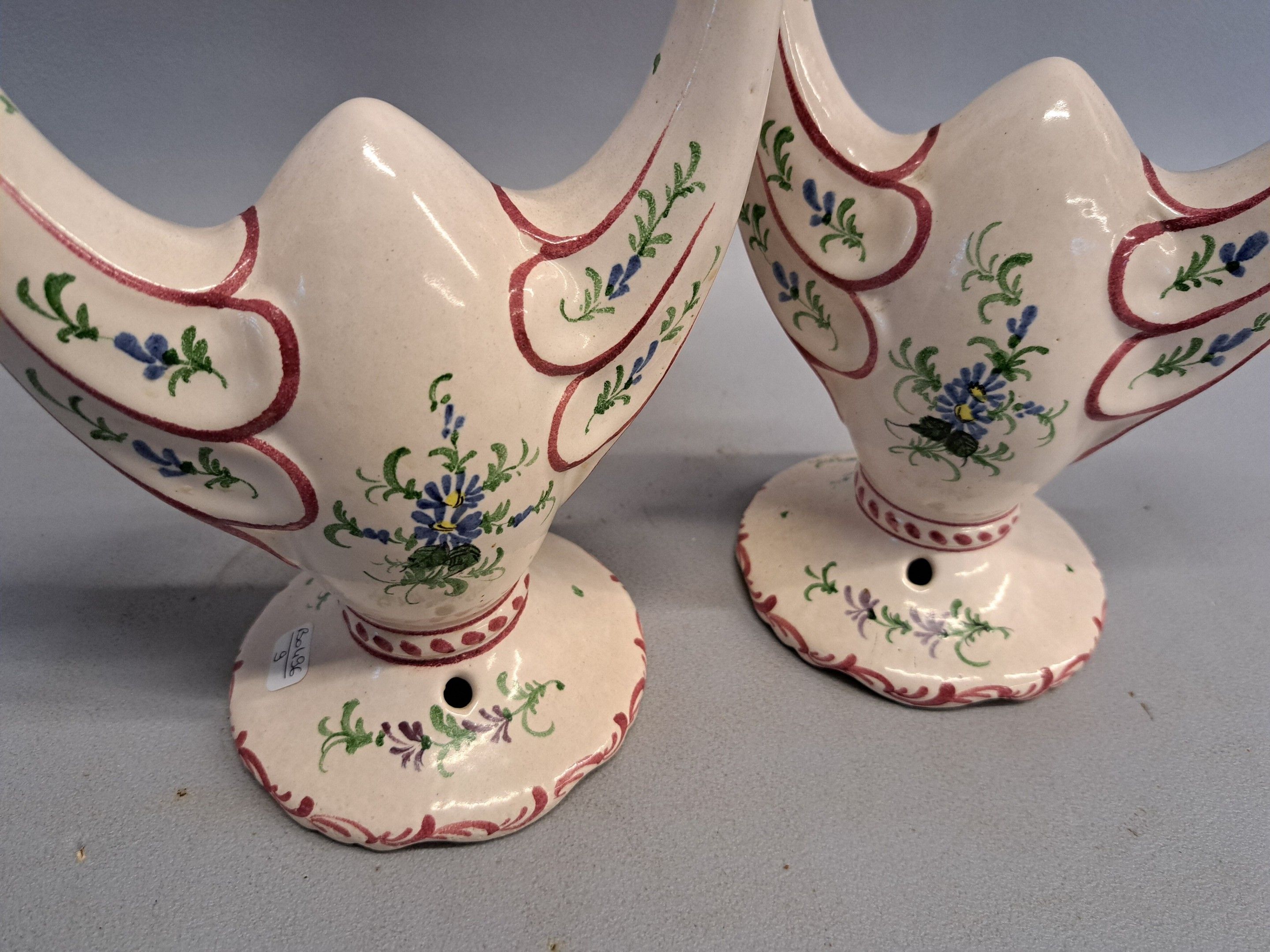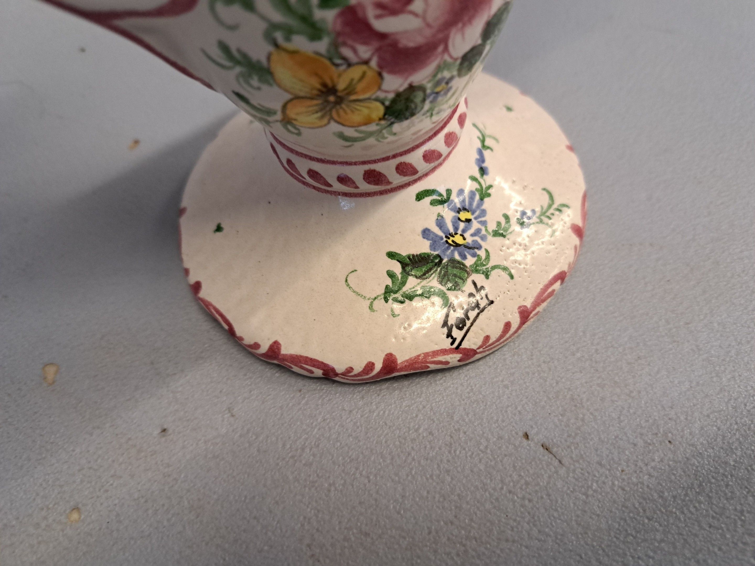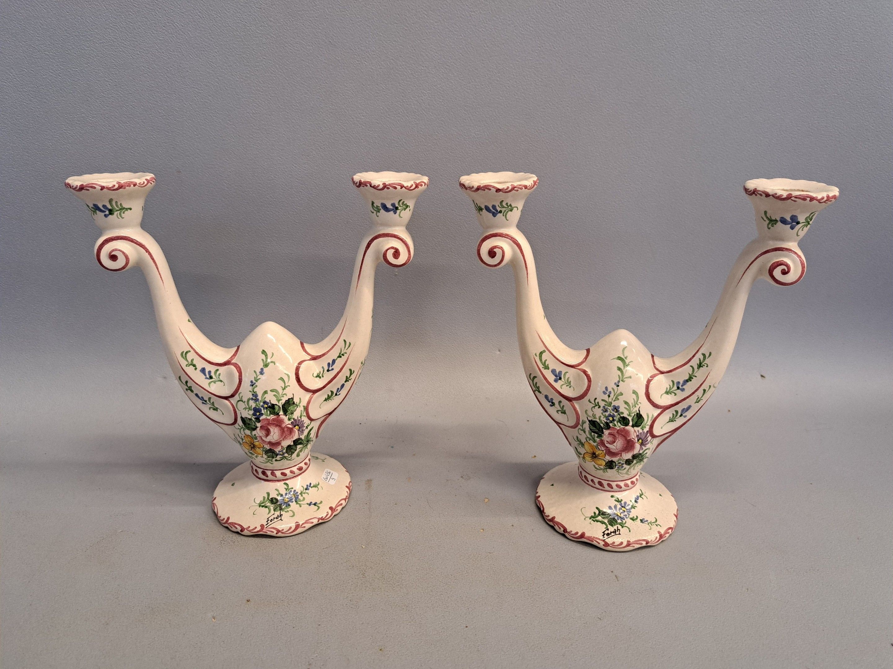 In the Marseille style, two earthenware two-light candelabras with polychrome decoration of flowering branches and birds, pink fillets. Modern work. Signed Forah.
