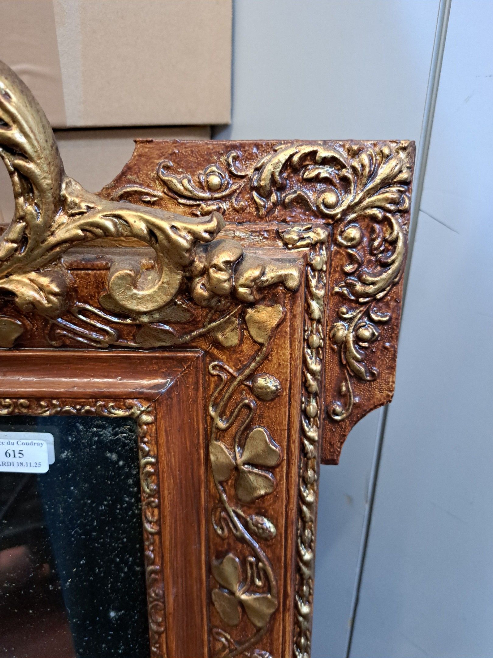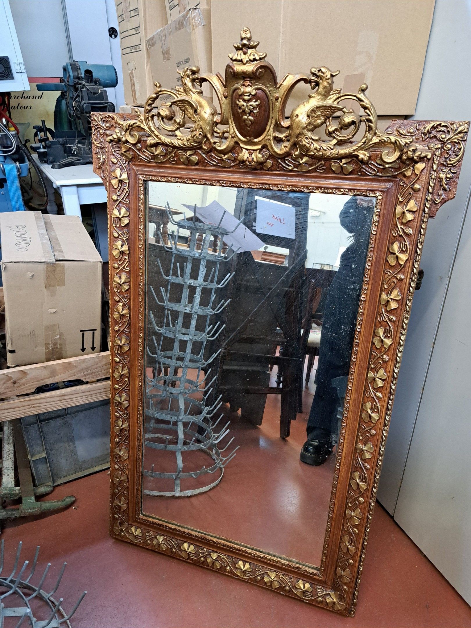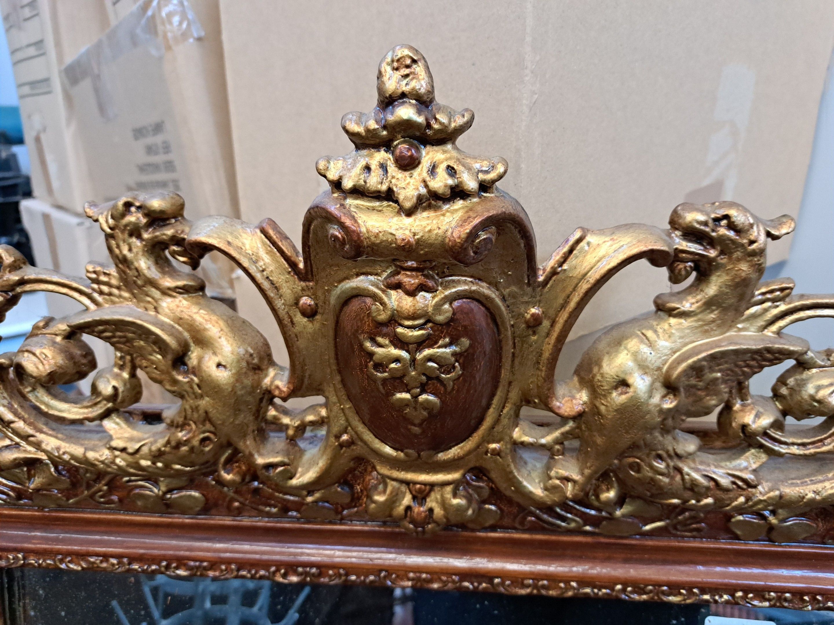 with gilded decoration of shamrocks, chimeras and a gilded coat of arms on a wood-effect background,