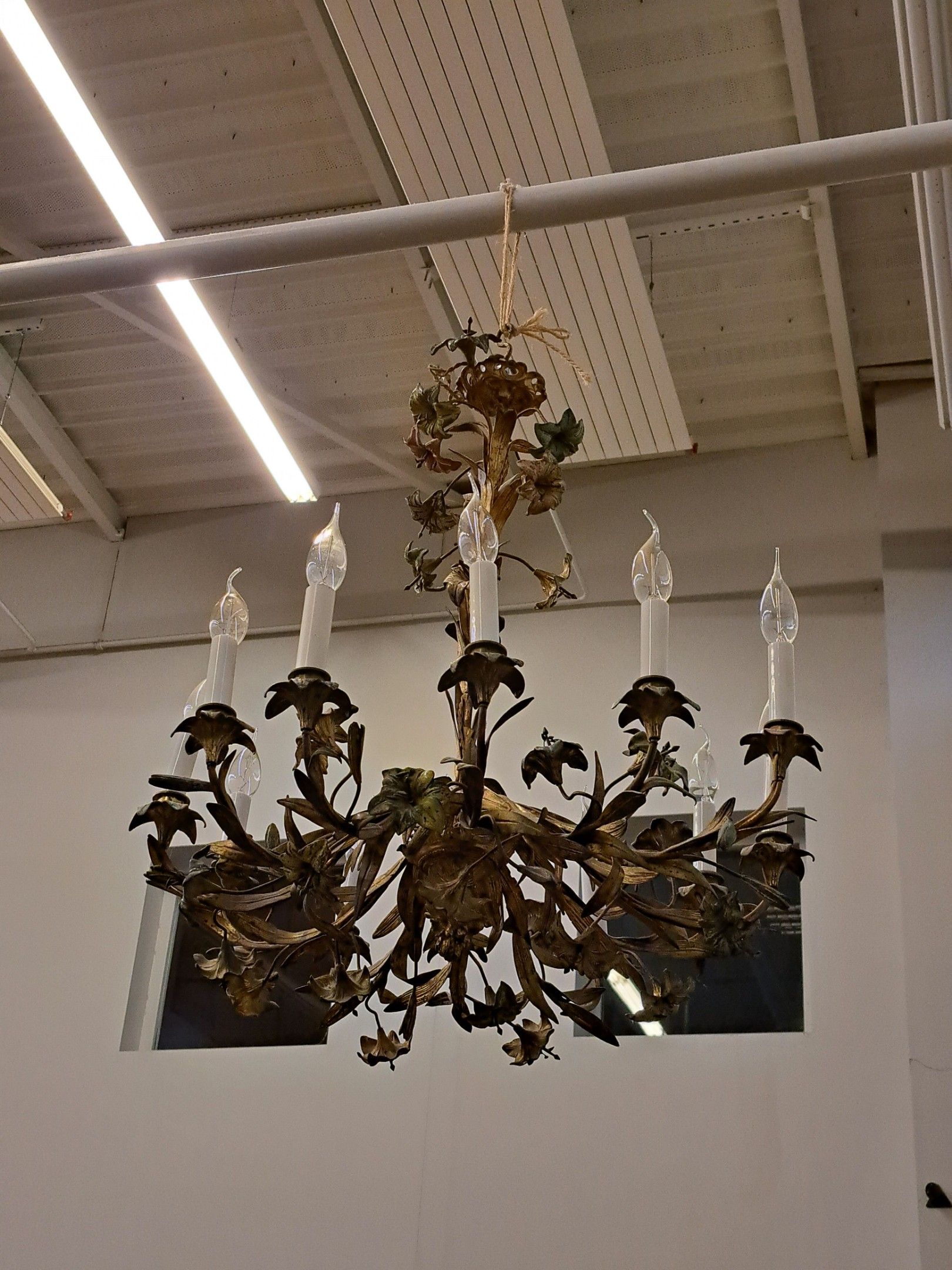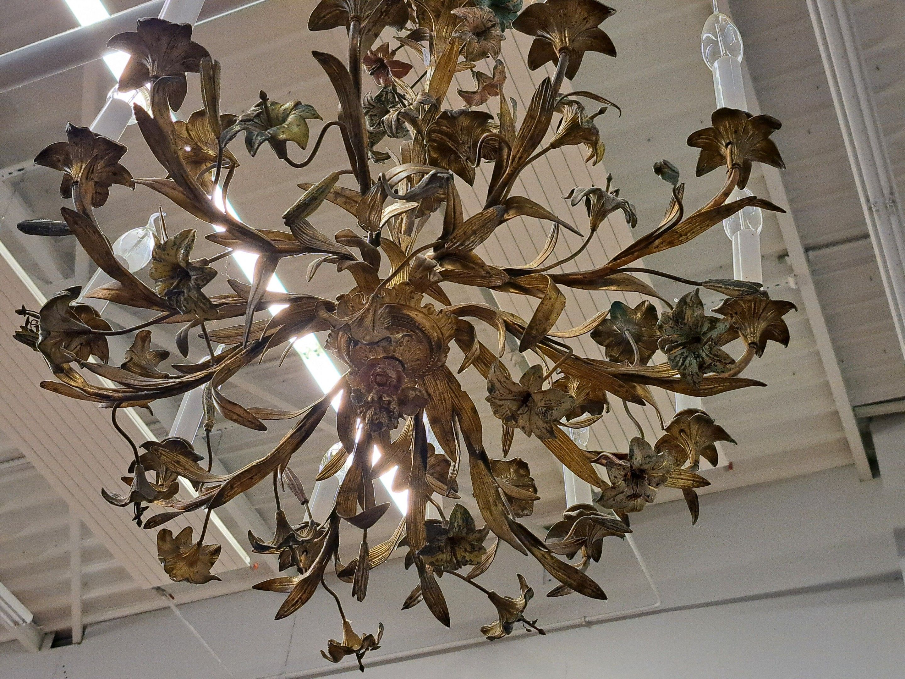 A 12-light ormolu chandelier with polychrome remains, decorated with lilies.