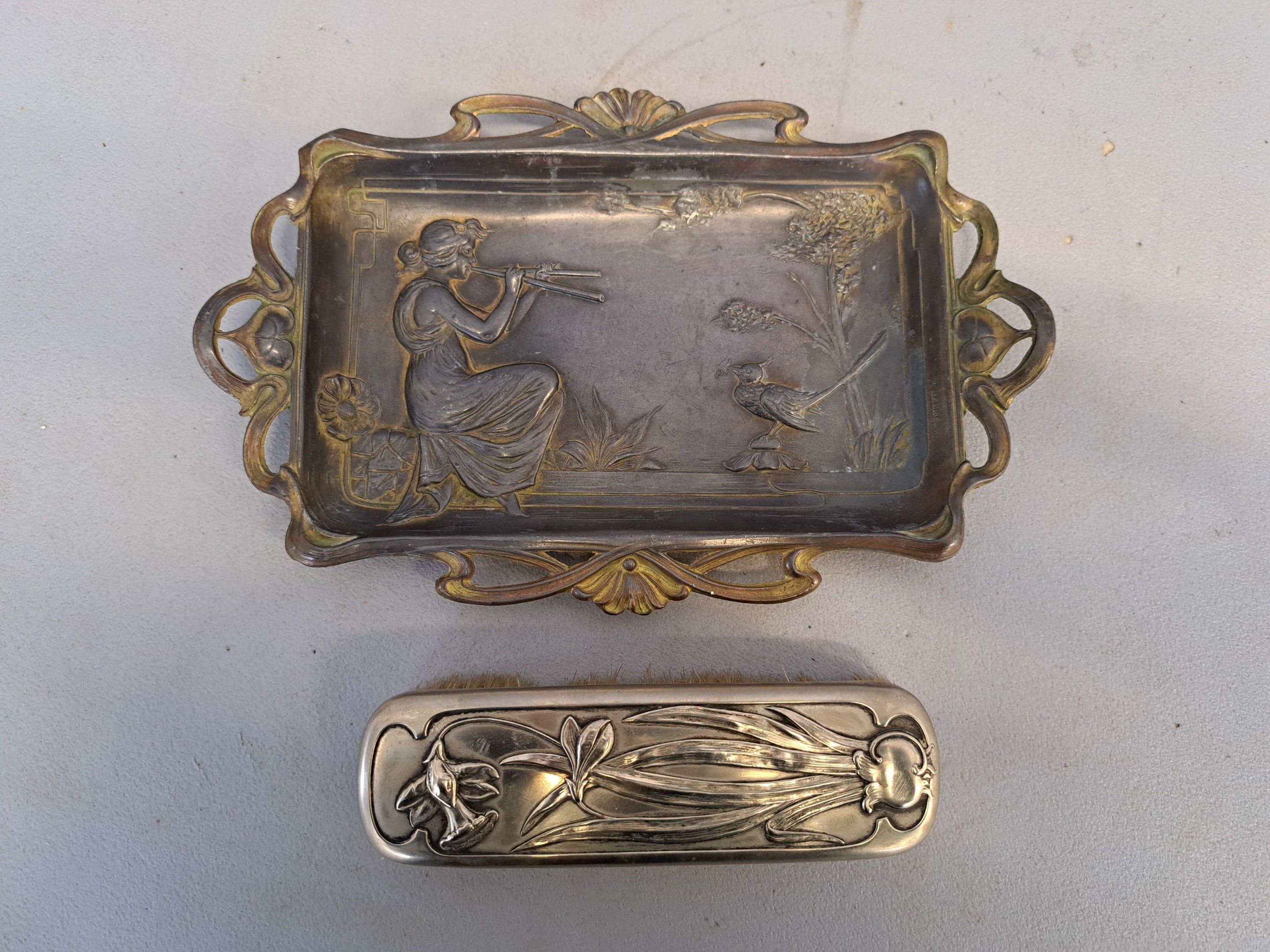 Small Art Nouveau style metal tray. Size 26.5x17.5 cm.