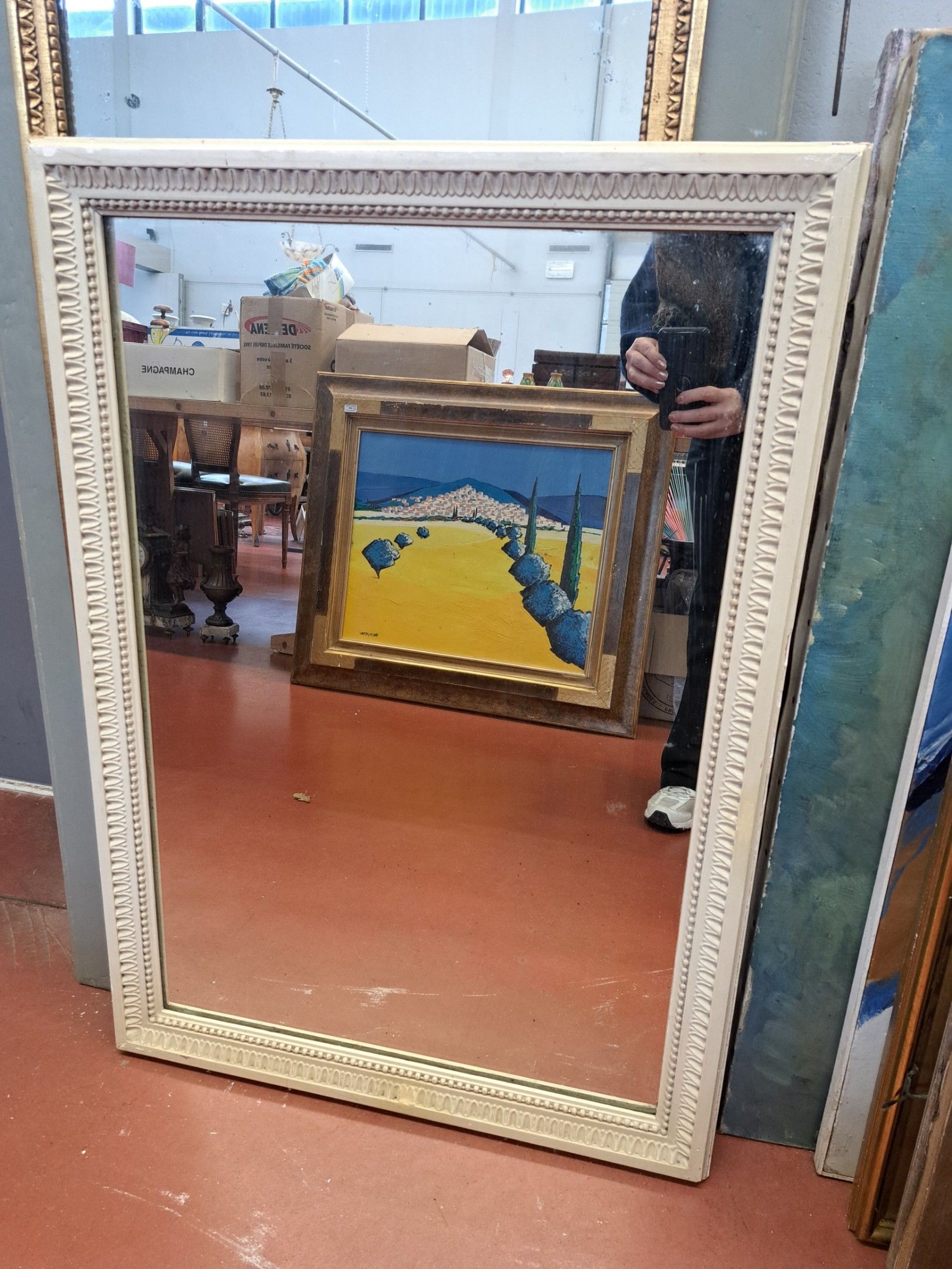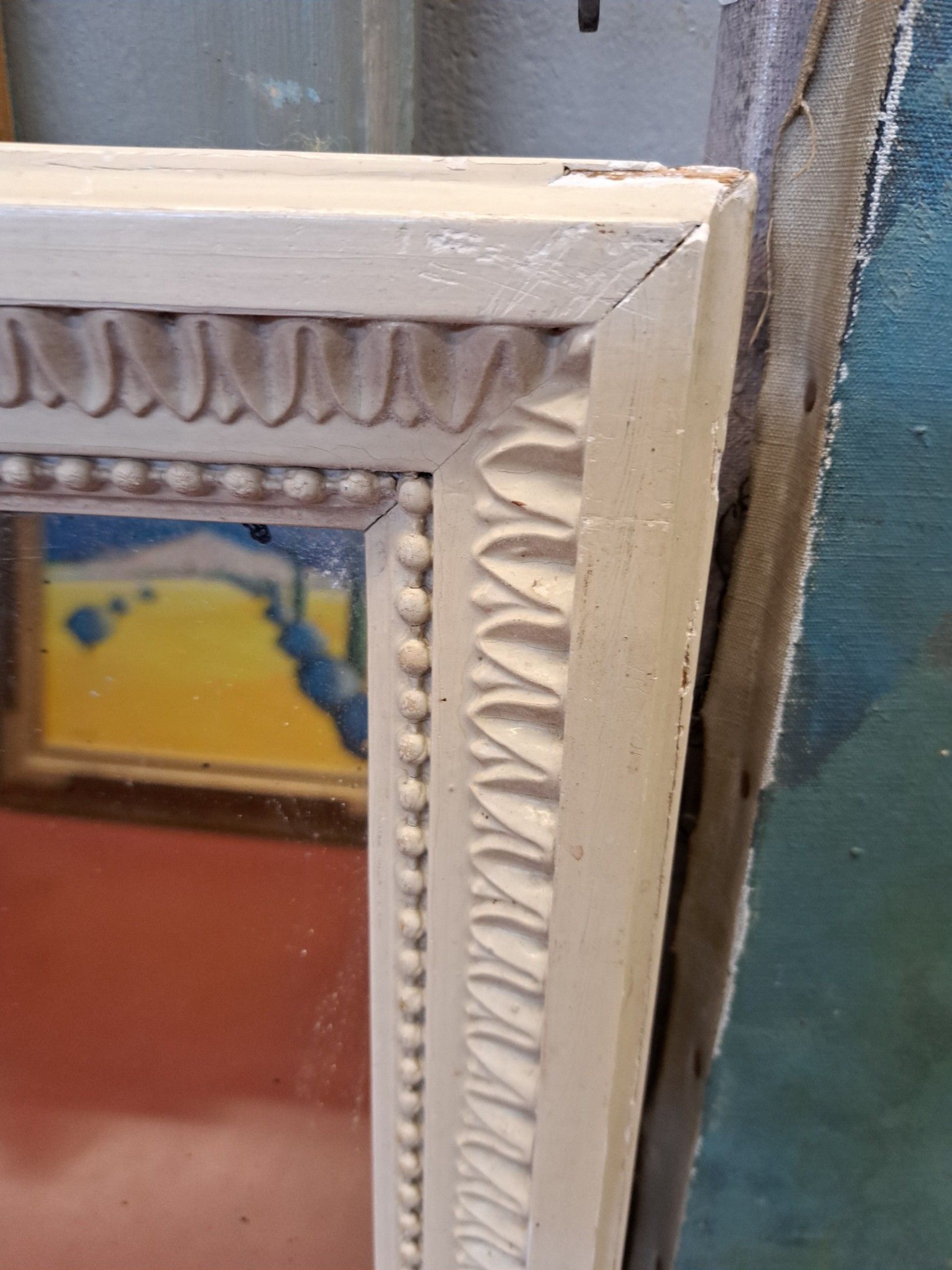 Rectangular mirror in a white painted wood frame decorated w…