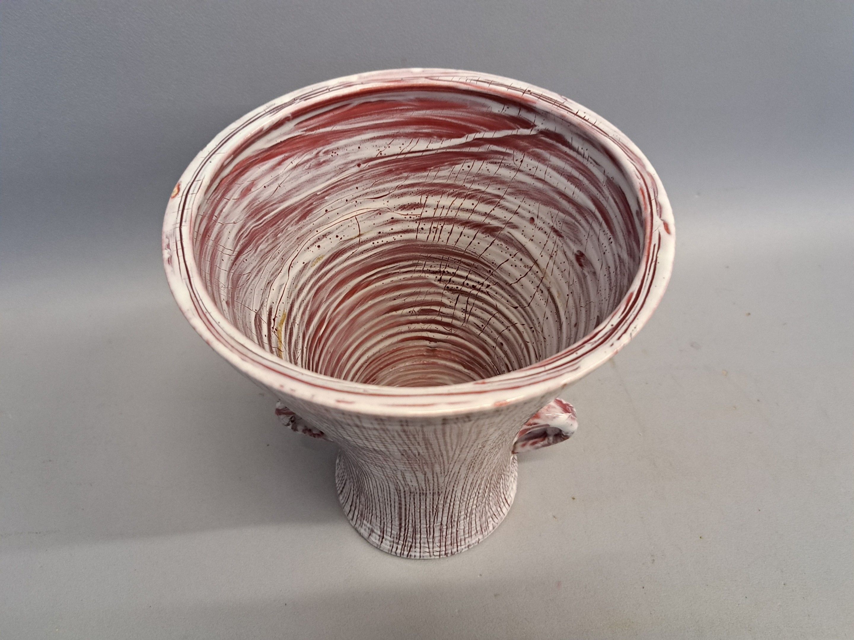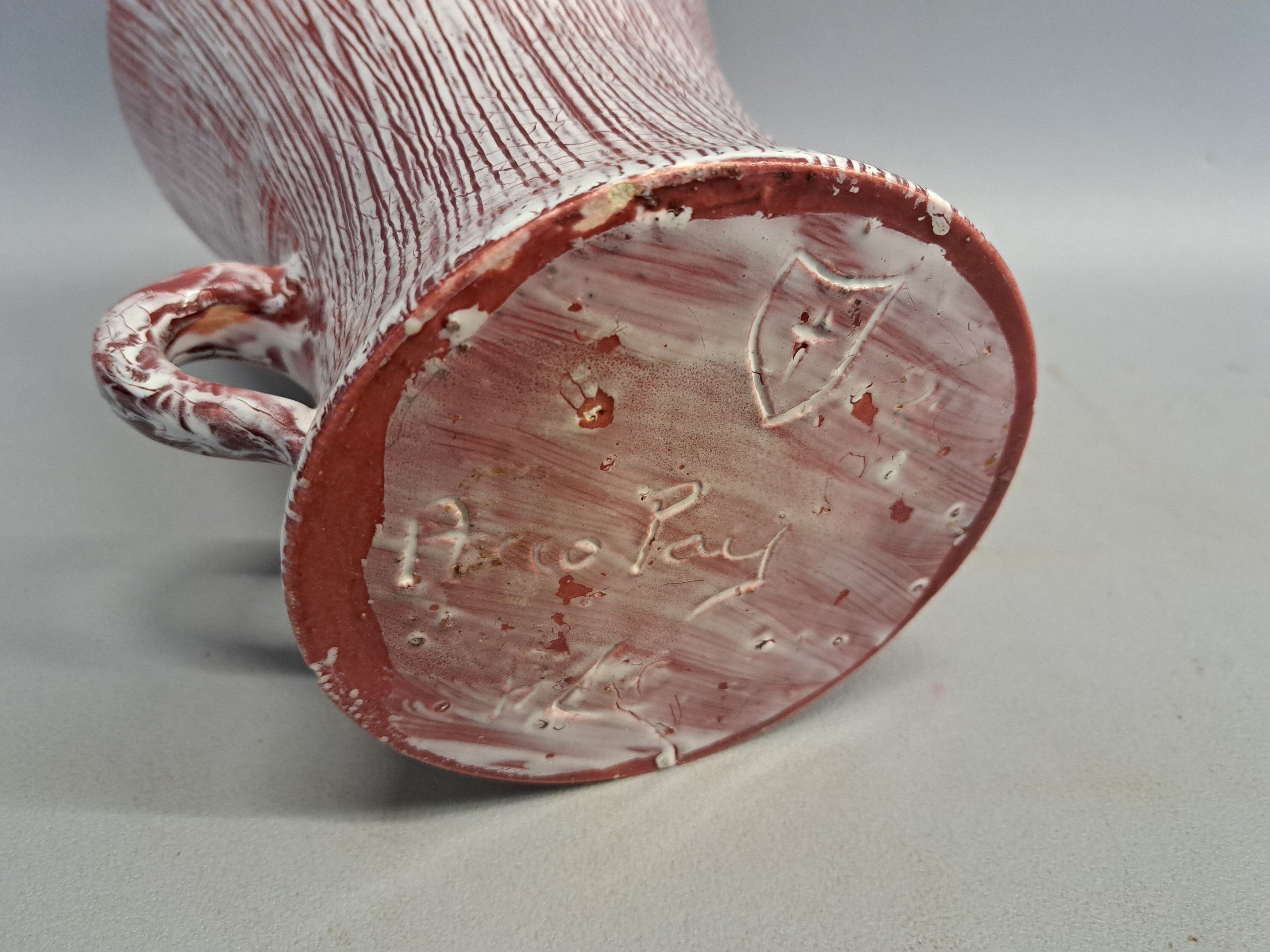 White and red enamelled ceramic vase in the shape of a truncated cone. Signed under the base and monogrammed AL.