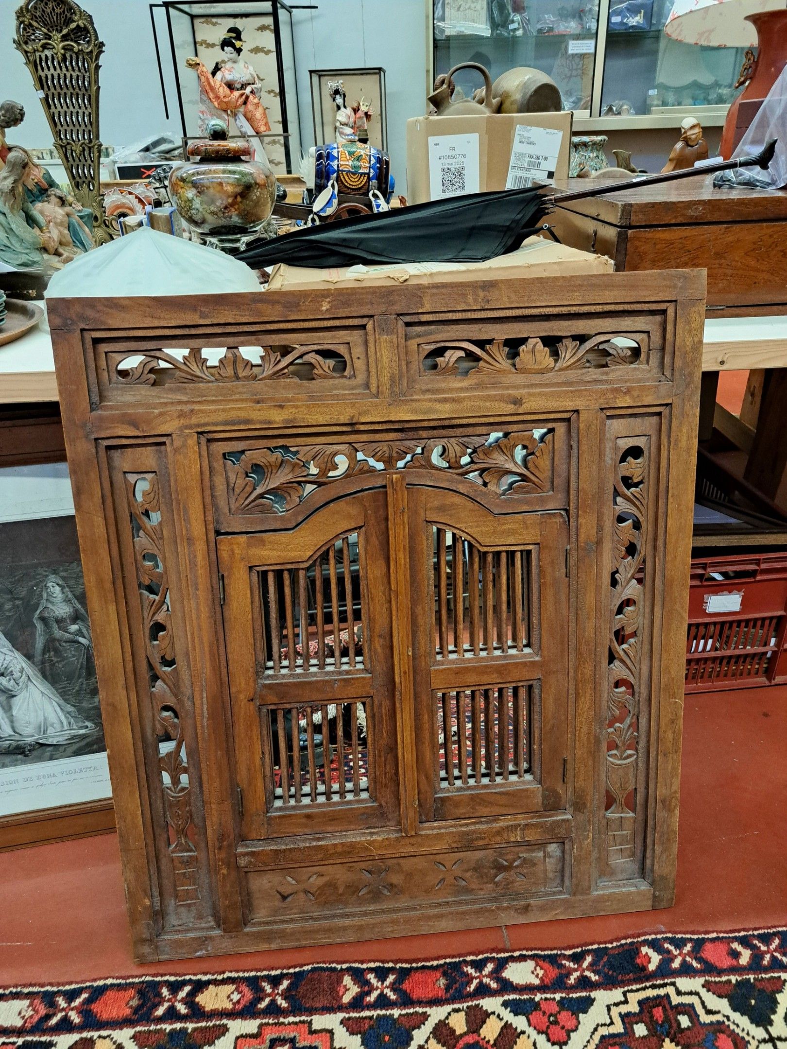 Mirror in a carved wood window frame with plant decoration,