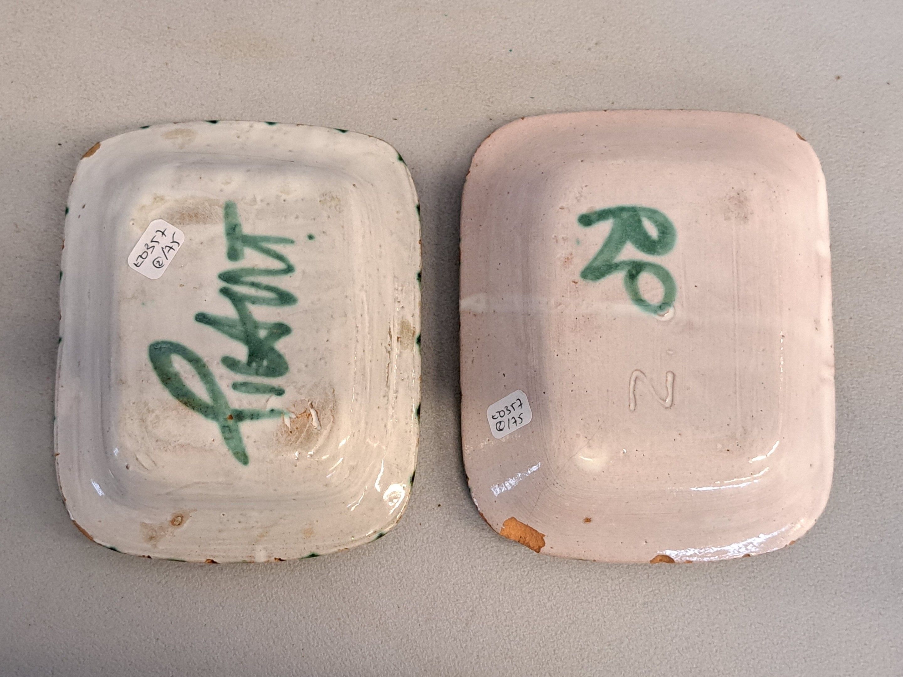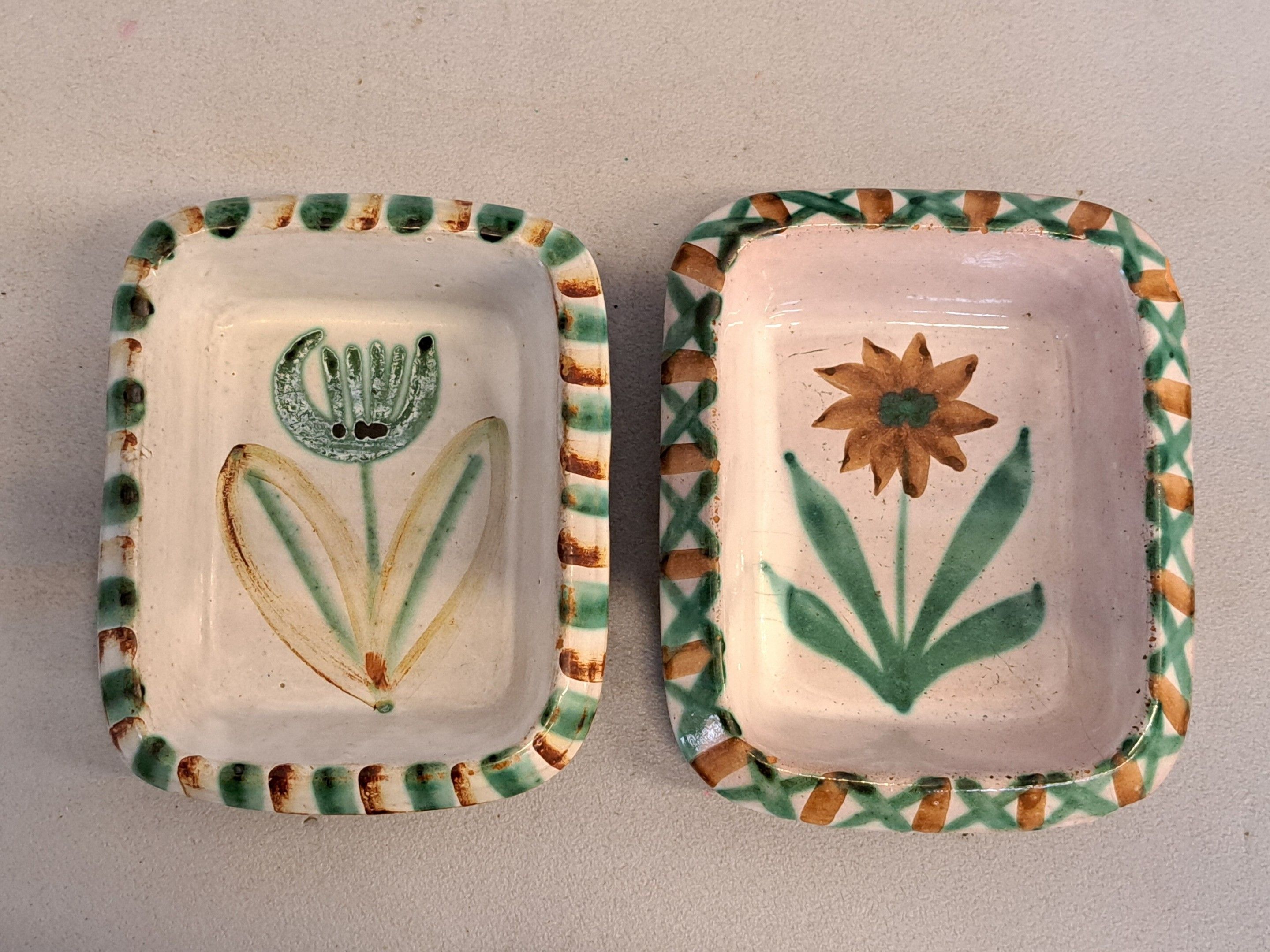 Two small earthenware dishes enamelled in green and brown with flowers. (chips). 14 x 12 cm.