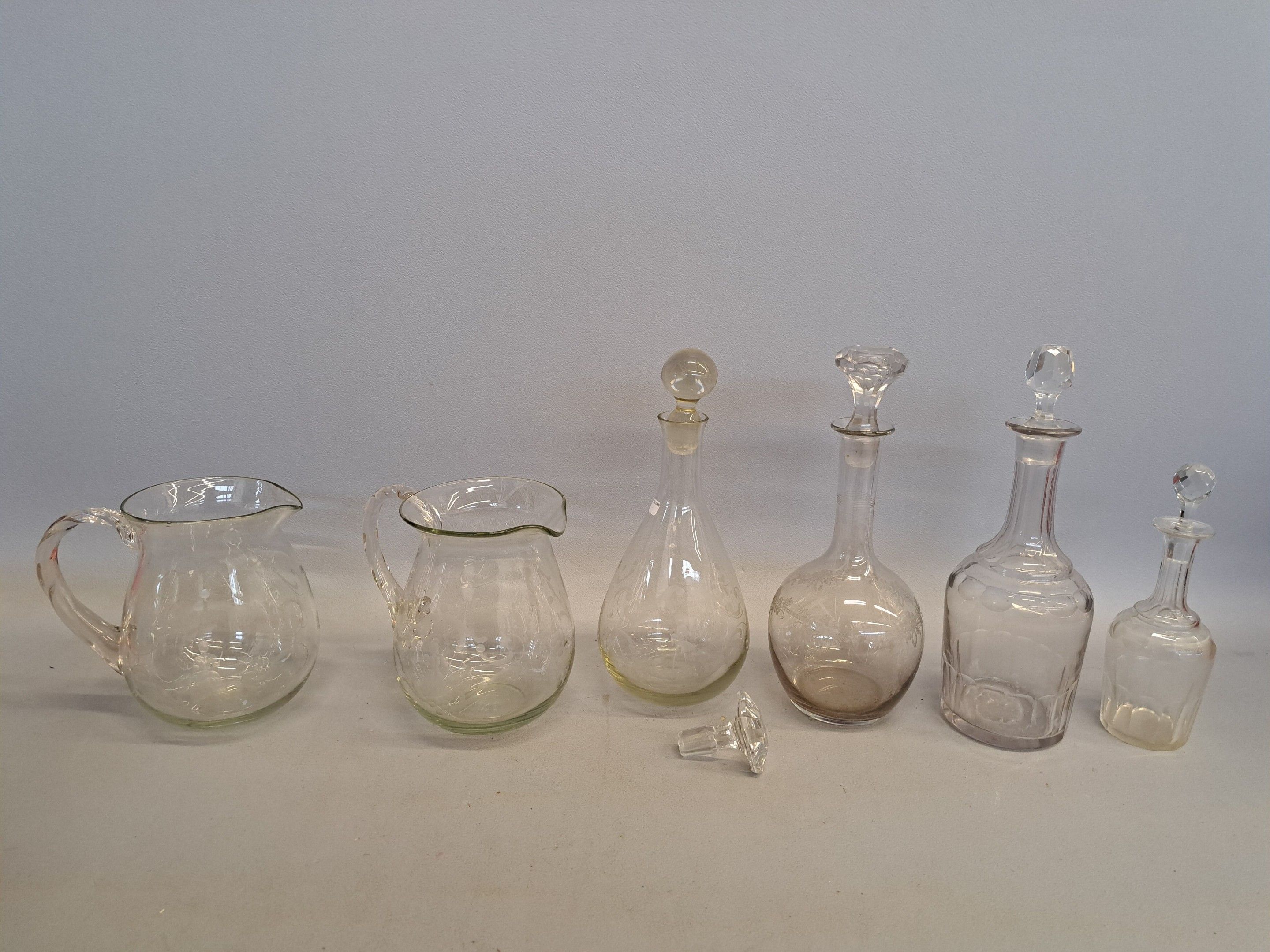 Six antique glass or crystal decanters or flasks with mismatched stoppers (minor wear). Maximum height 32 cm.