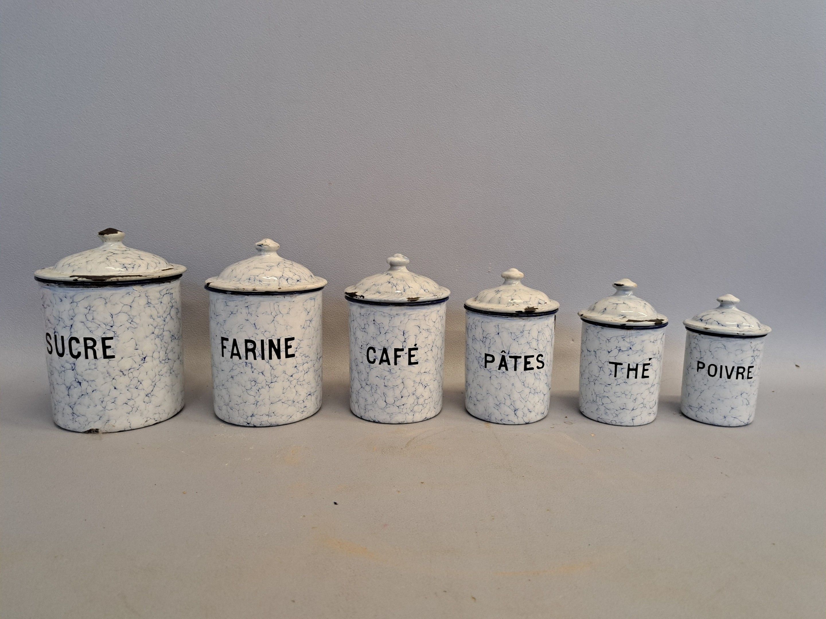 Six enamelled metal spice jars. Early 20th century.