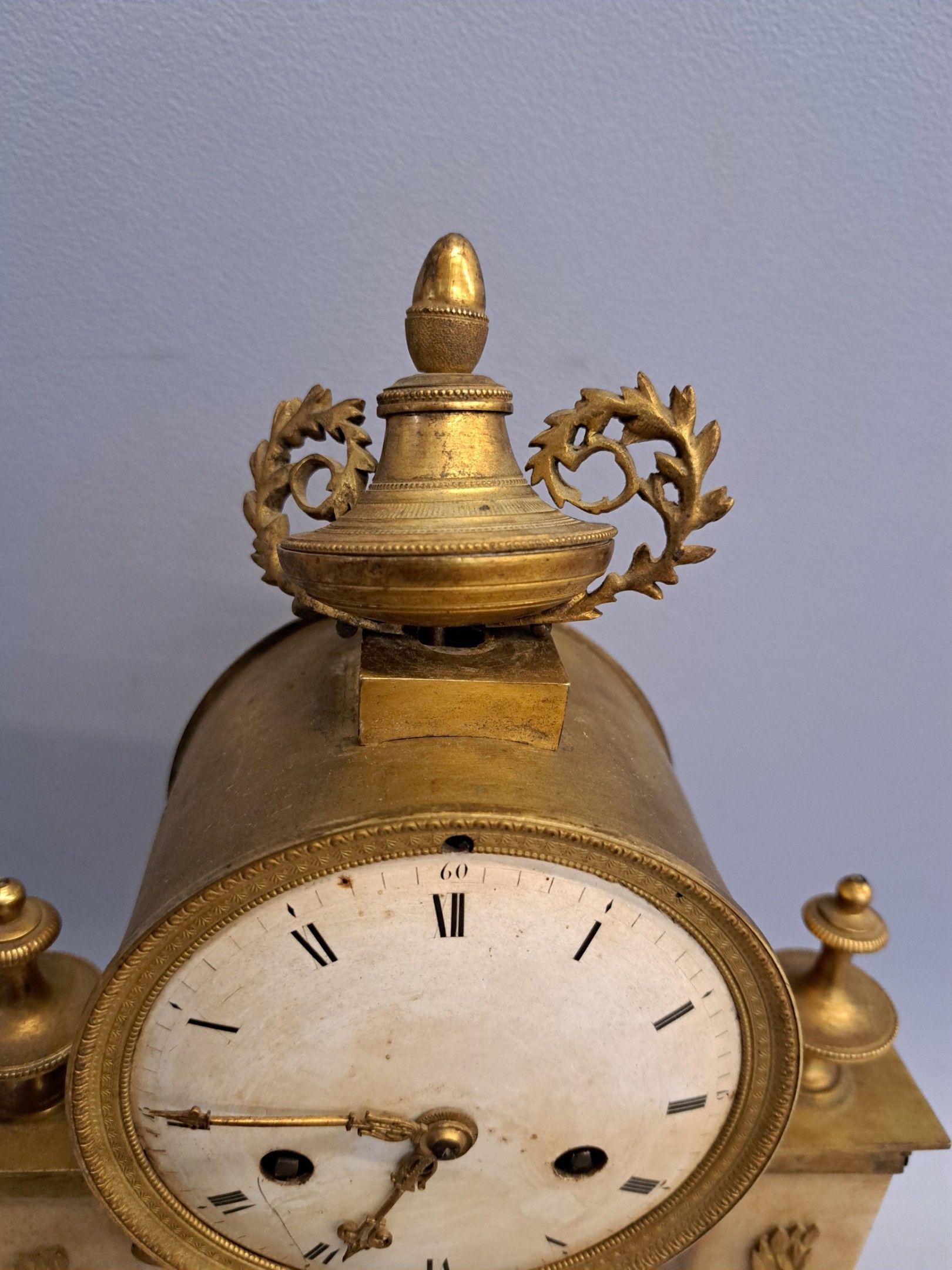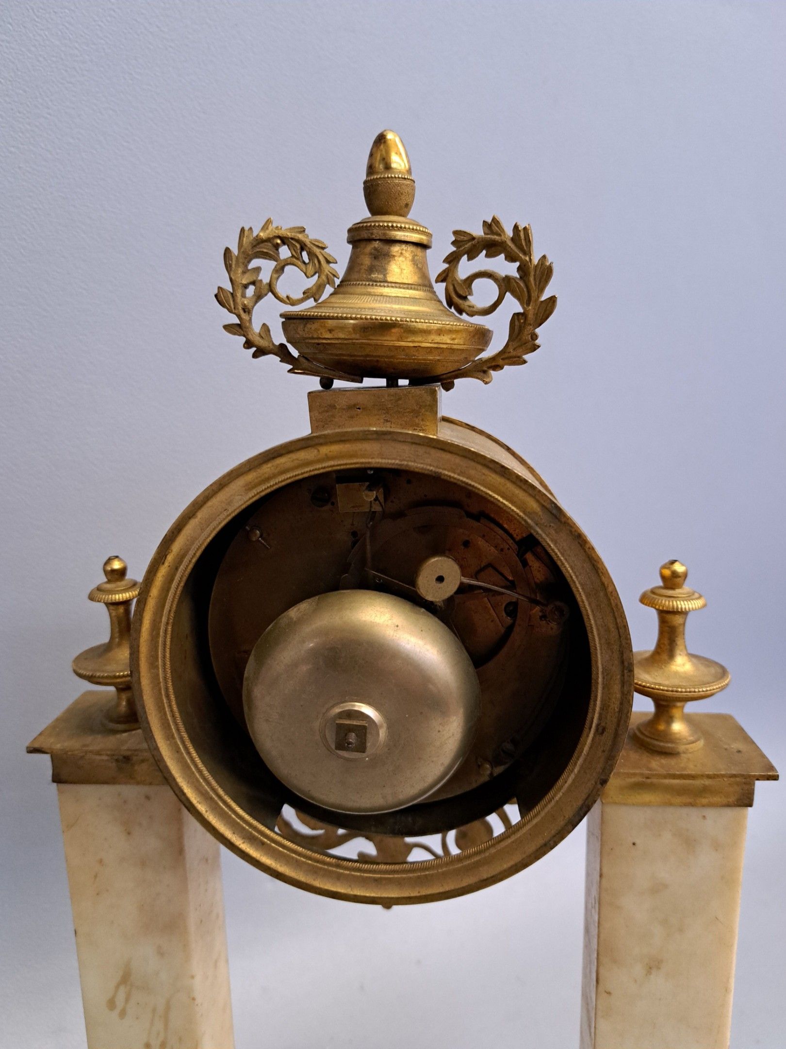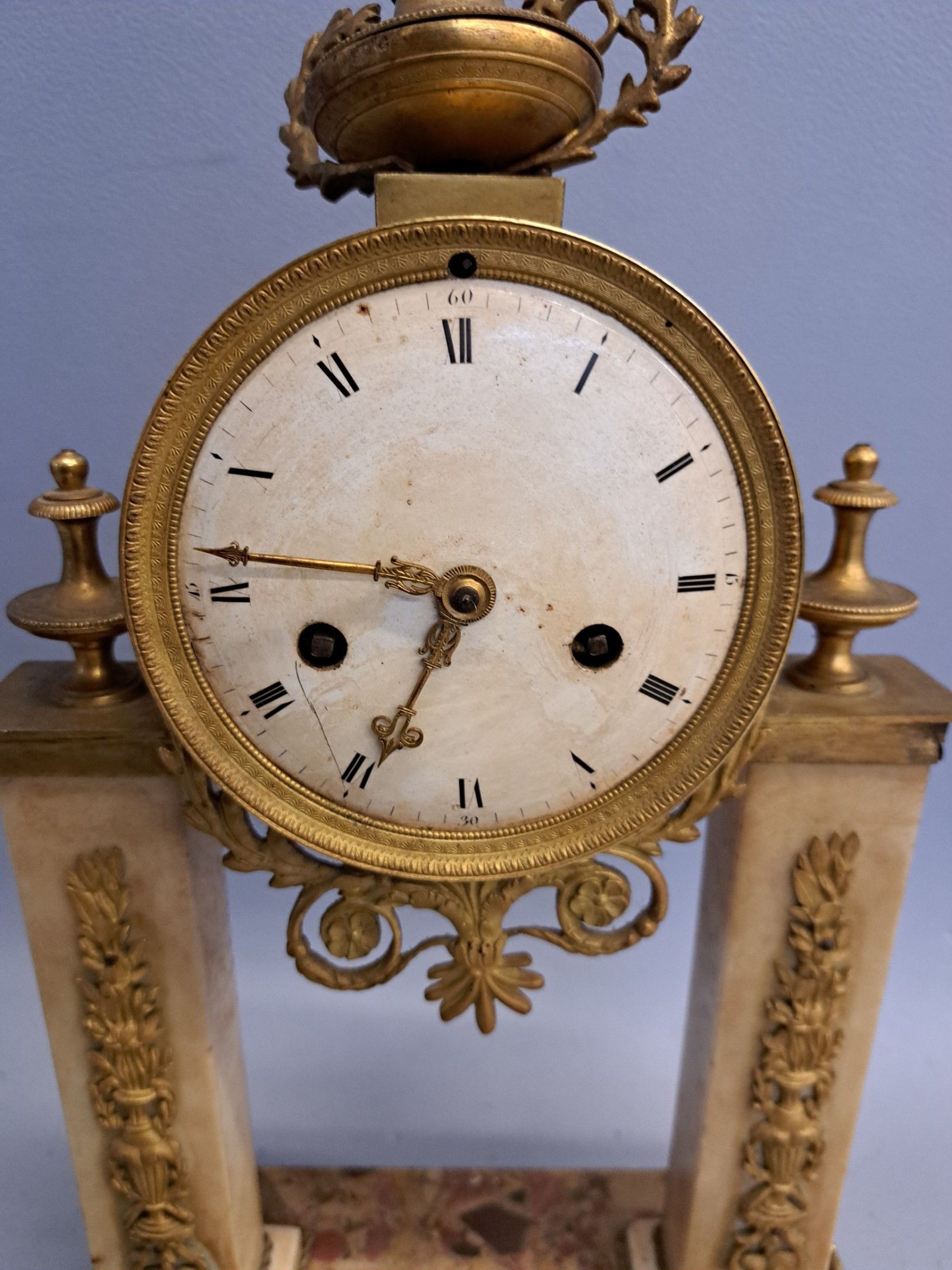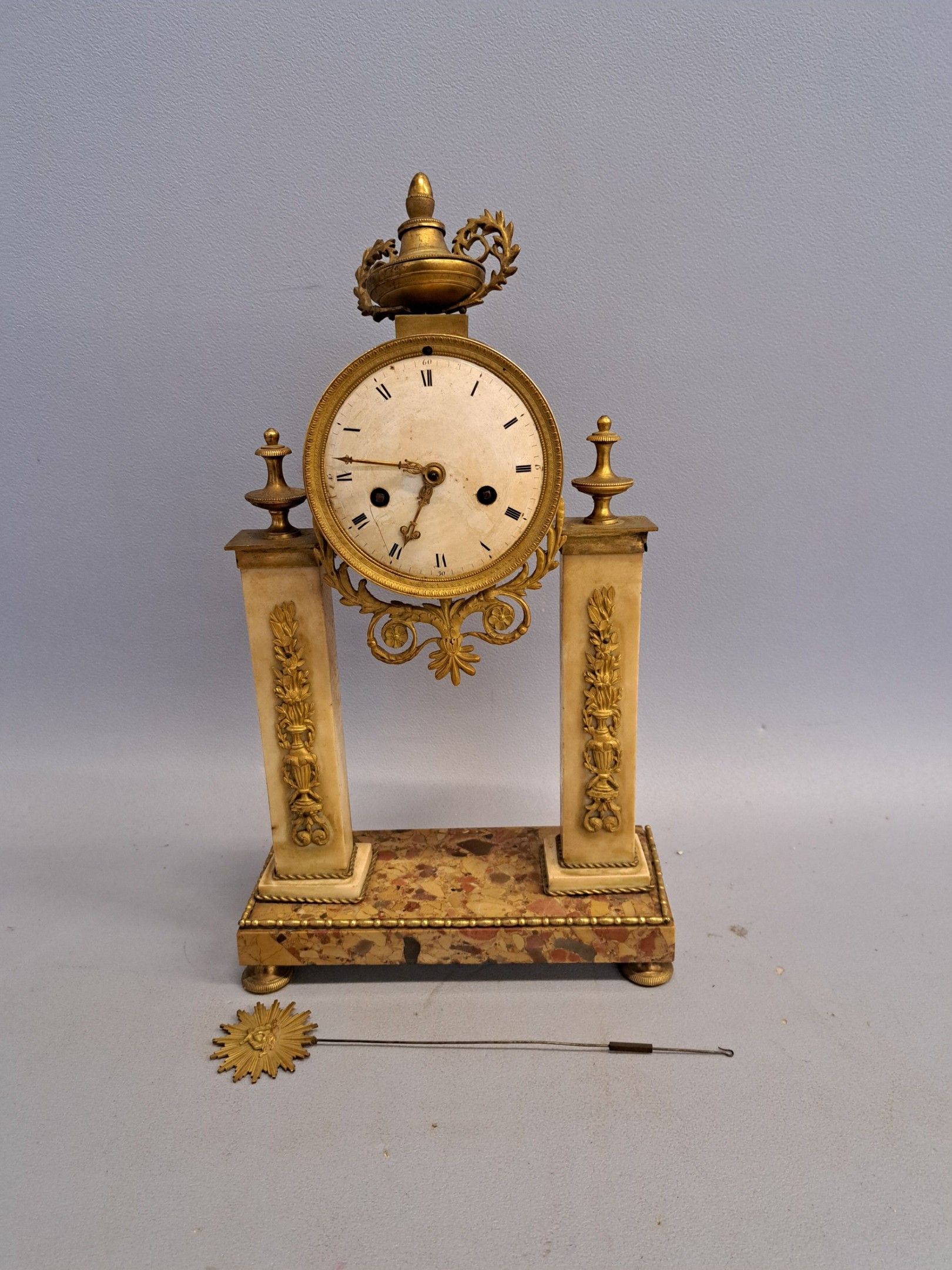 An ormolu and marble portico clock topped by a fire pot. 19th century (Damage and missing parts)