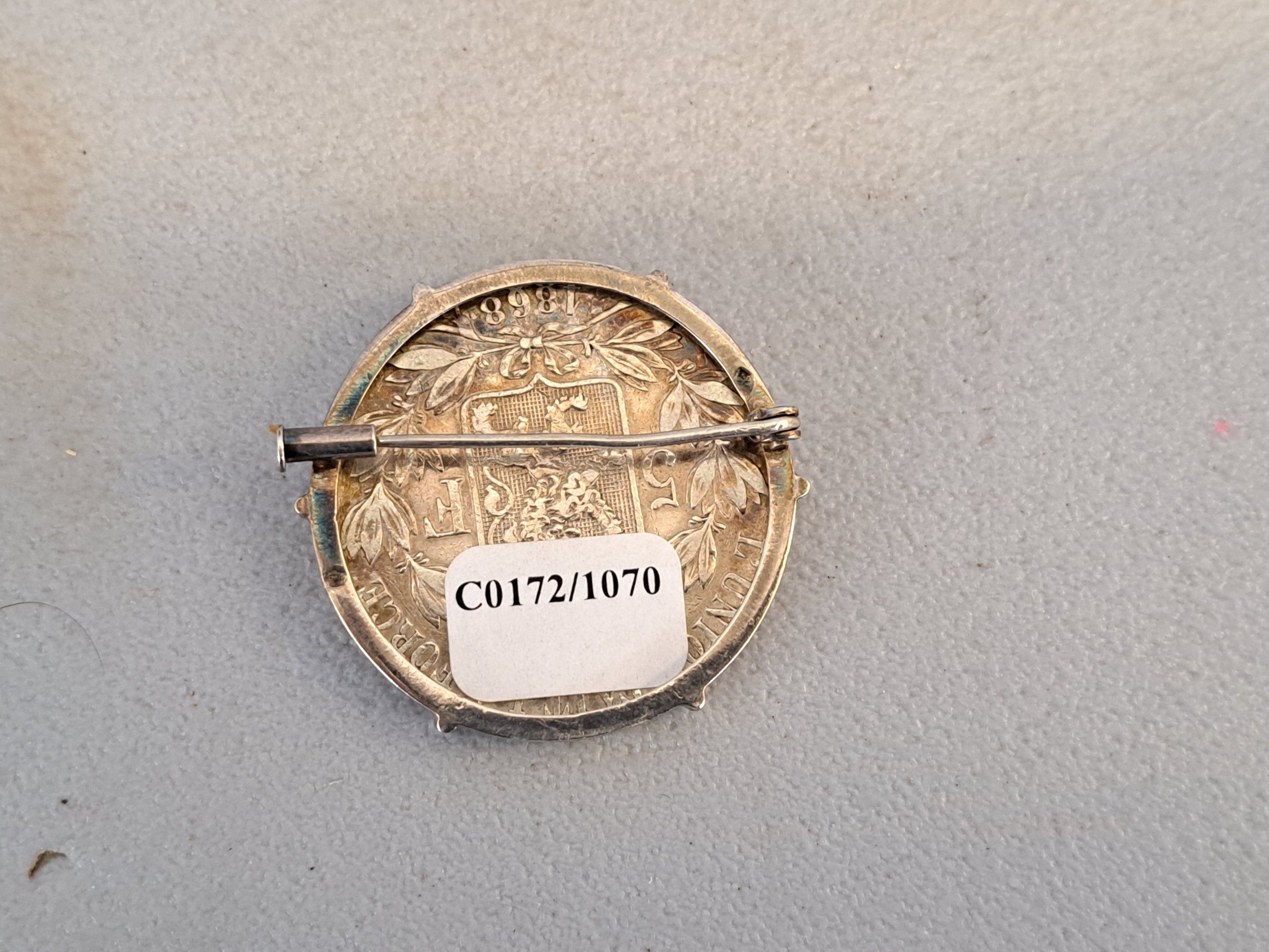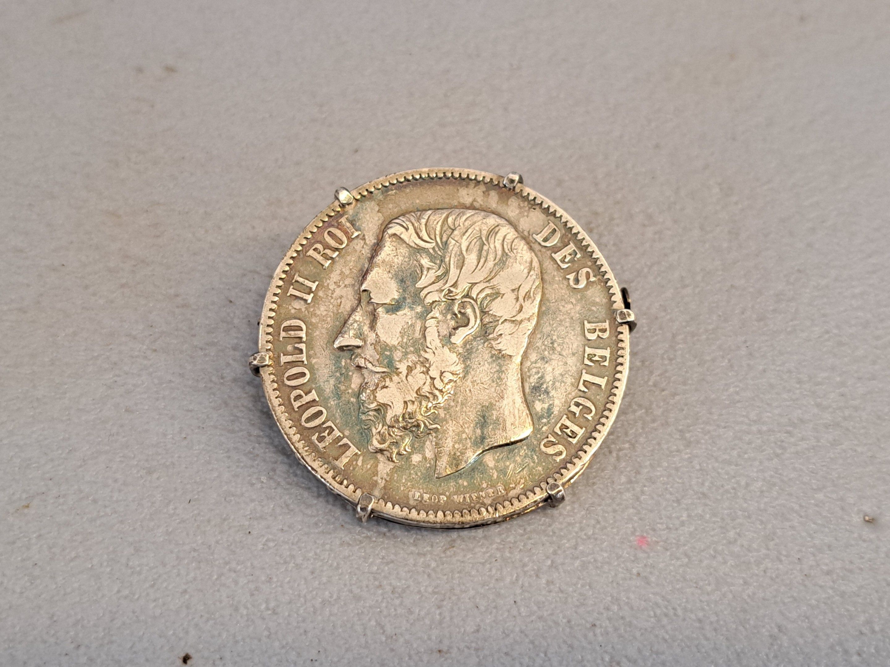 5 franc silver coin, Leopold II King of the Belgians, 1868, mounted in a brooch. Weight : 29,29g.